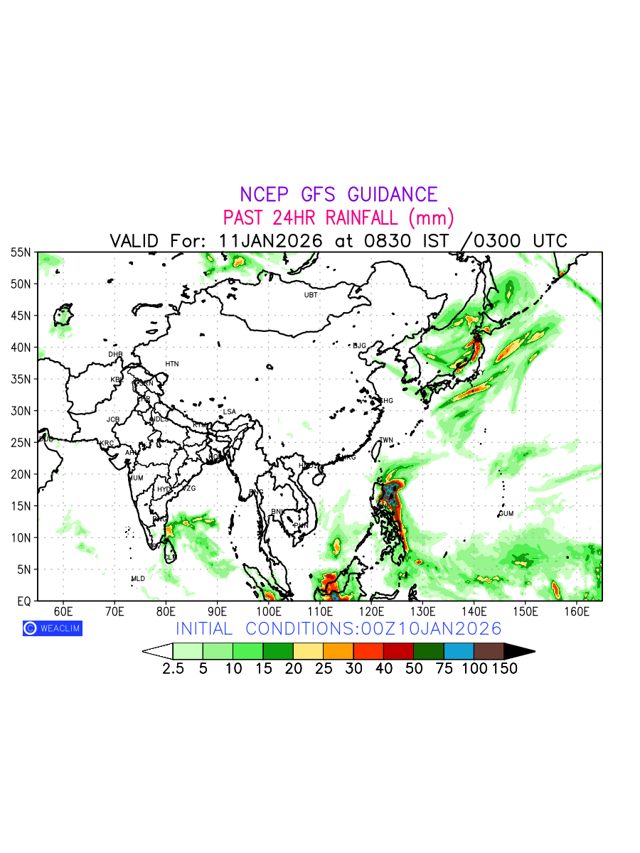 Rainfall forecast for 24 hours for East Asia is expected amount of precipitation in millimeters for a given area over a time period of 24 hours and valid from 0300 UTC (0830 IST) of the previous date to 0300 UTC of the required date. This prediction enables the users to plan/review their tasks that are affected by rainfall related severe weather events that may lead to flooding, drought, snowfall and avalanche etc.