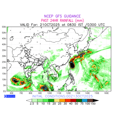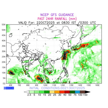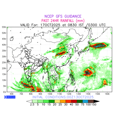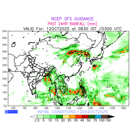 Rainfall forecast for 24 hours for East Asia is expected amount of precipitation in millimeters for a given area over a time period of 24 hours and valid from 0300 UTC (0830 IST) of the previous date to 0300 UTC of the required date. This prediction enables the users to plan/review their tasks that are affected by rainfall related severe weather events that may lead to flooding, drought, snowfall and avalanche etc.