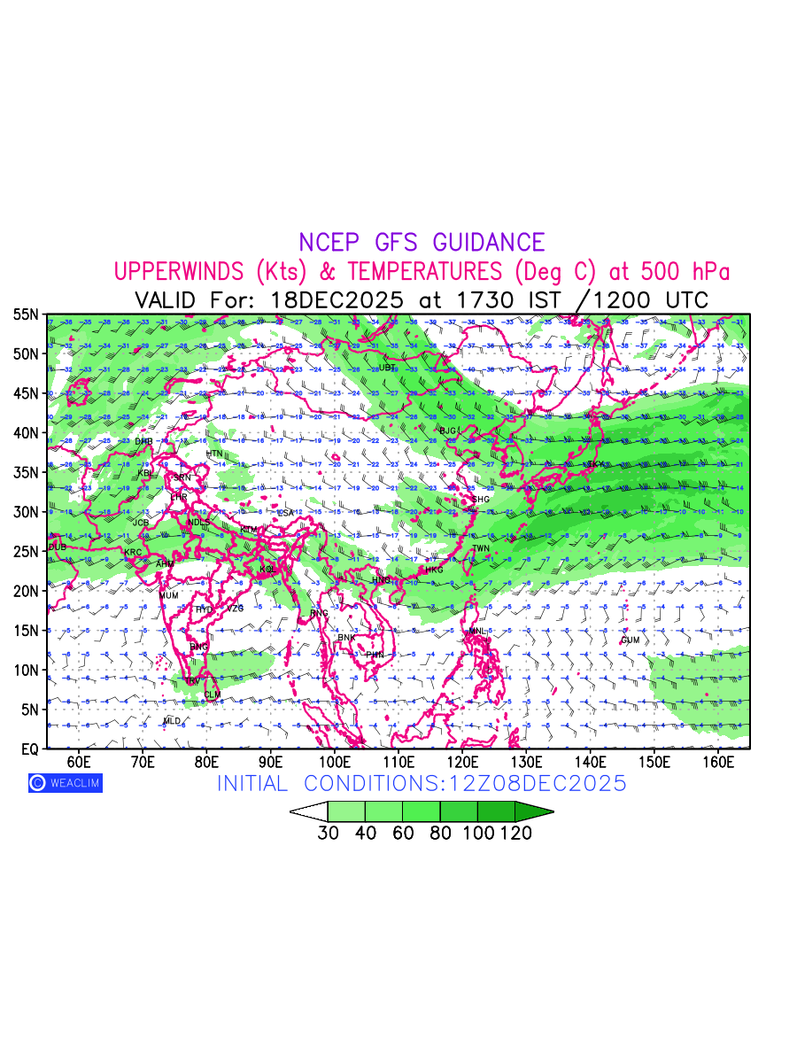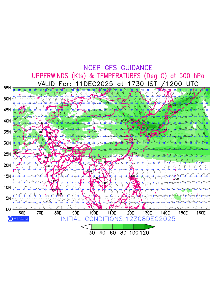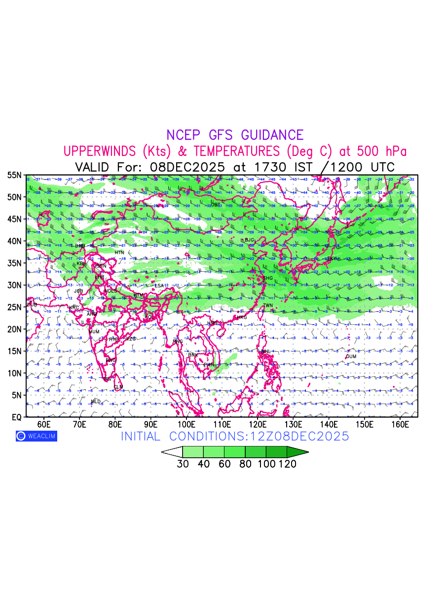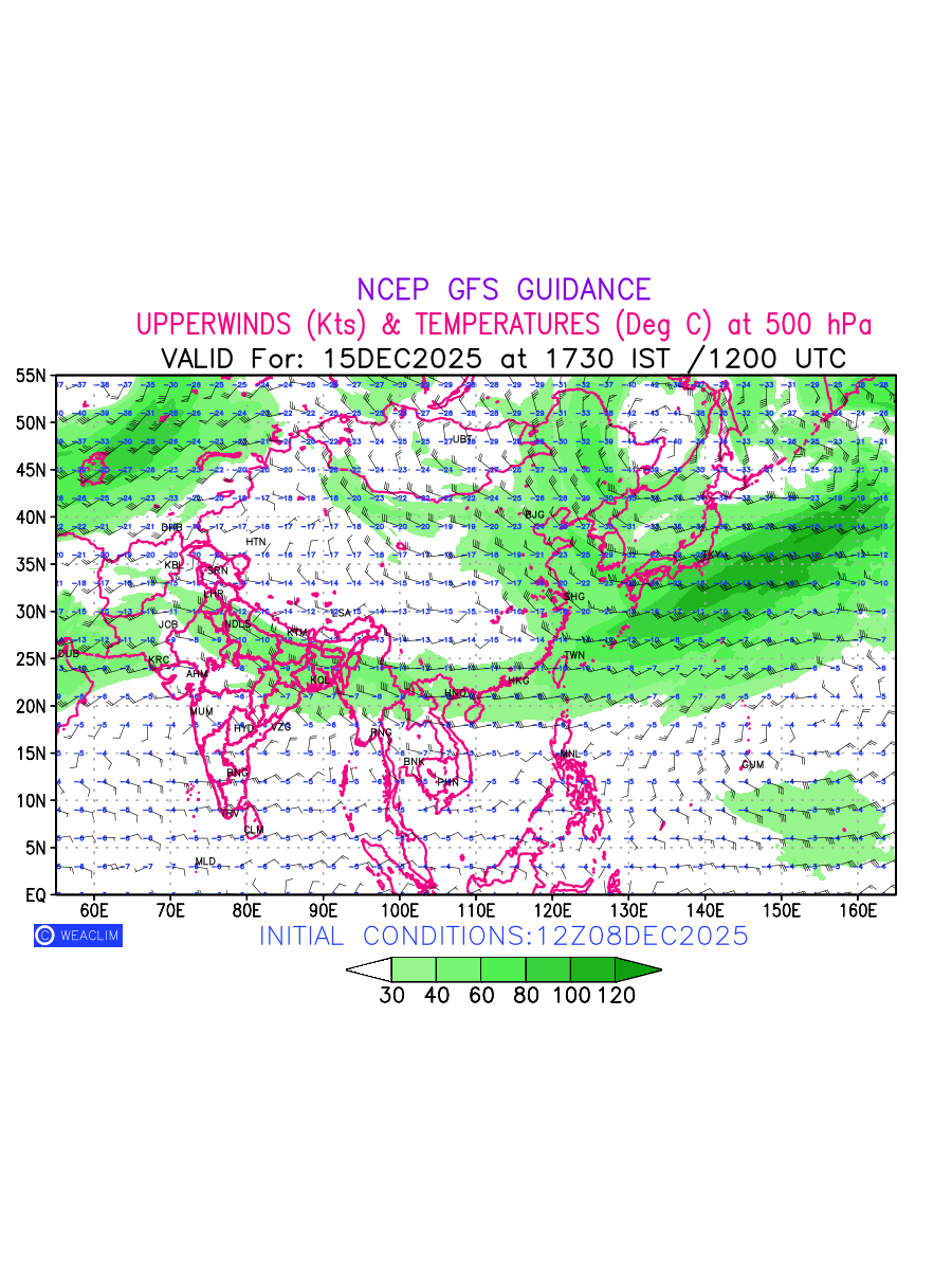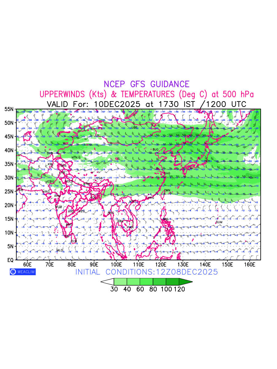 Winds at 500 hPa at the 24th hour for East Asia refers to the predicted wind direction and speed at a pressure level of 500 hPa, which is located in the upper troposphere about 5.5 km (18,000 ft) above the Earth’s surface.The winds are presented in knots (kt), and the direction is given in degrees from true north. Winds with magnitude of more than 40 kt are marked in shades of green. It provides important information on forecasting weather patterns, including the movement and intensification of storms, the development of weather fronts, and the location and strength of high and low pressure systems. Along with the wind speed (kt) and direction, upper air temperatures (Deg C) are also shown at the grid points over the East Asian Region at 500hPa level for the next ten days.