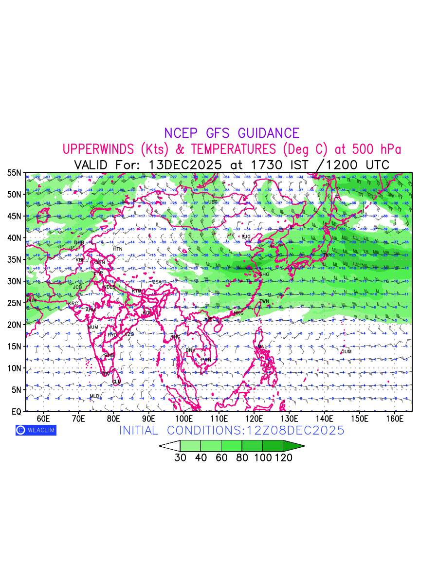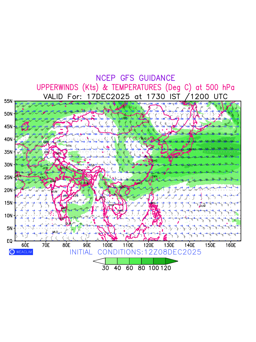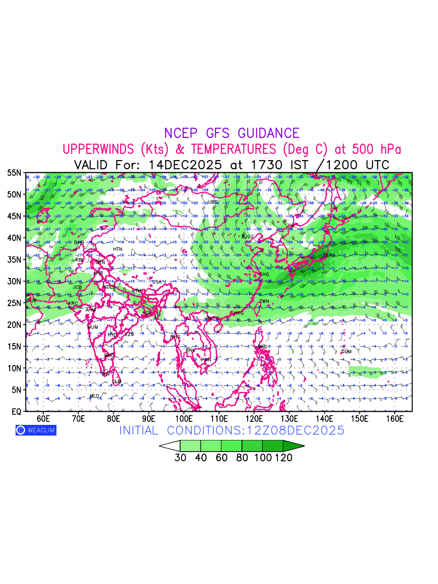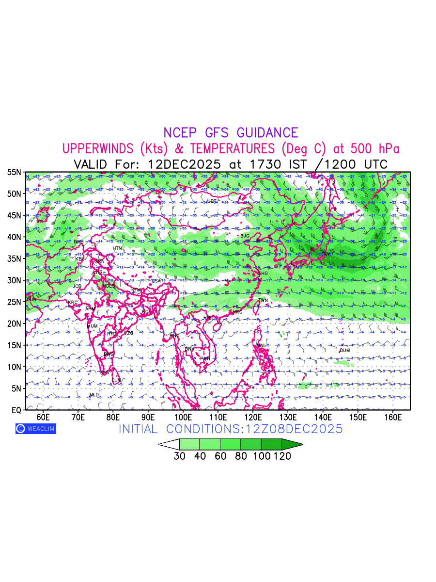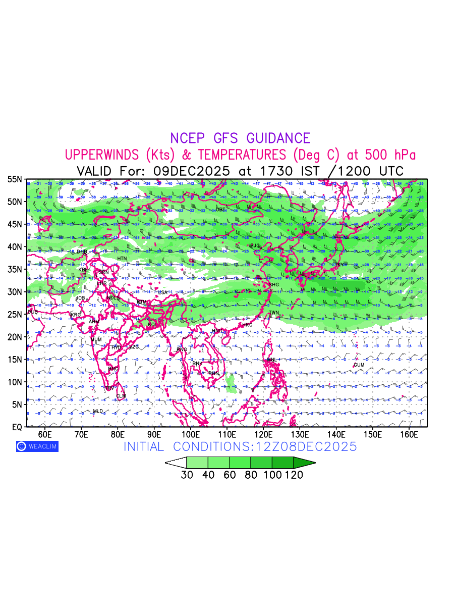 Winds at 500 hPa at the 24th hour for East Asia refers to the predicted wind direction and speed at a pressure level of 500 hPa, which is located in the upper troposphere about 5.5 km (18,000 ft) above the Earth’s surface.The winds are presented in knots (kt), and the direction is given in degrees from true north. Winds with magnitude of more than 40 kt are marked in shades of green. It provides important information on forecasting weather patterns, including the movement and intensification of storms, the development of weather fronts, and the location and strength of high and low pressure systems. Along with the wind speed (kt) and direction, upper air temperatures (Deg C) are also shown at the grid points over the East Asian Region at 500hPa level for the next ten days.