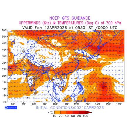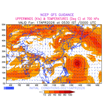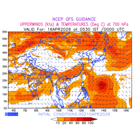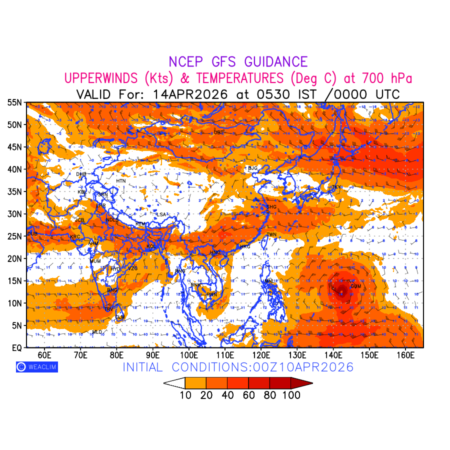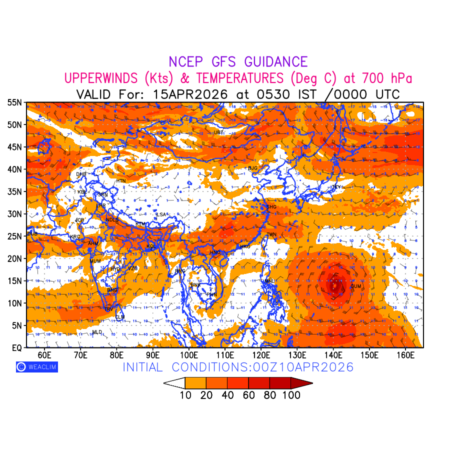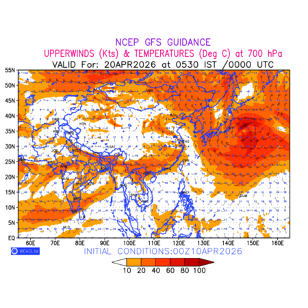 Winds at 700 hPa at the 24th hour for East Asia refers to the predicted wind direction and speed at a pressure level of 700 hPa, which is located in the middle troposphere (approximately 3,000 meters or 10,000 feet above the Earths surface). The winds are presented in knots (kt), and the direction is given in degrees from true north. Winds with magnitude of more than 20 kt are marked in shades of red. At this level, the wind speed and direction can influence the movement and development of weather systems such as storms, fronts, and high-pressure systems.The depiction also shows the temperature along with the wind barb on the grid points at 700 hPa. Along with the wind speed (kt) and direction, upper air temperatures (Deg C) are also shown at the grid points over the East Asian Region at 700hPa level for the next ten days.