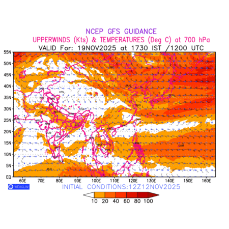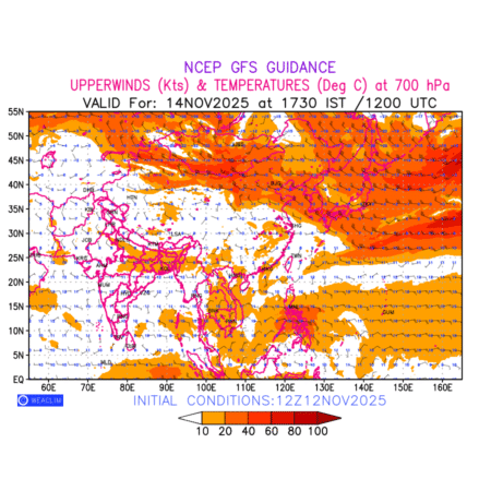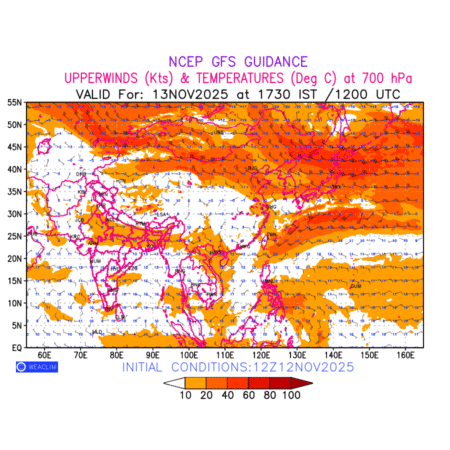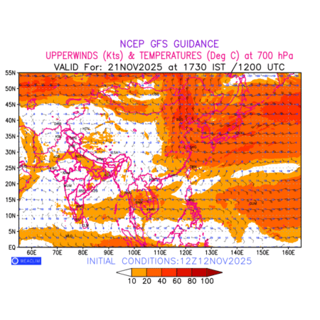 Winds at 700 hPa at the 24th hour for East Asia refers to the predicted wind direction and speed at a pressure level of 700 hPa, which is located in the middle troposphere (approximately 3,000 meters or 10,000 feet above the Earths surface). The winds are presented in knots (kt), and the direction is given in degrees from true north. Winds with magnitude of more than 20 kt are marked in shades of red. At this level, the wind speed and direction can influence the movement and development of weather systems such as storms, fronts, and high-pressure systems.The depiction also shows the temperature along with the wind barb on the grid points at 700 hPa. Along with the wind speed (kt) and direction, upper air temperatures (Deg C) are also shown at the grid points over the East Asian Region at 700hPa level for the next ten days.