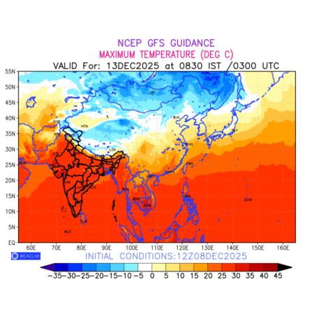 Maximum Temperature for East Asia countries depicts the highest temperatures at 2m above the ground surface between 0300 UTC of the previous date to 0300 UTC of the required date. This is an important variable for weather forecasting, as it determines the conditions at the Earth’s surface during the warmest part of the date, affecting human activities, agriculture, and the environment. 2m Temperature data can be used for a variety of applications, such as predicting the onset of heatwaves or cold spells, forecasting temperature trends, and studying the impact of weather on various systems and processes.