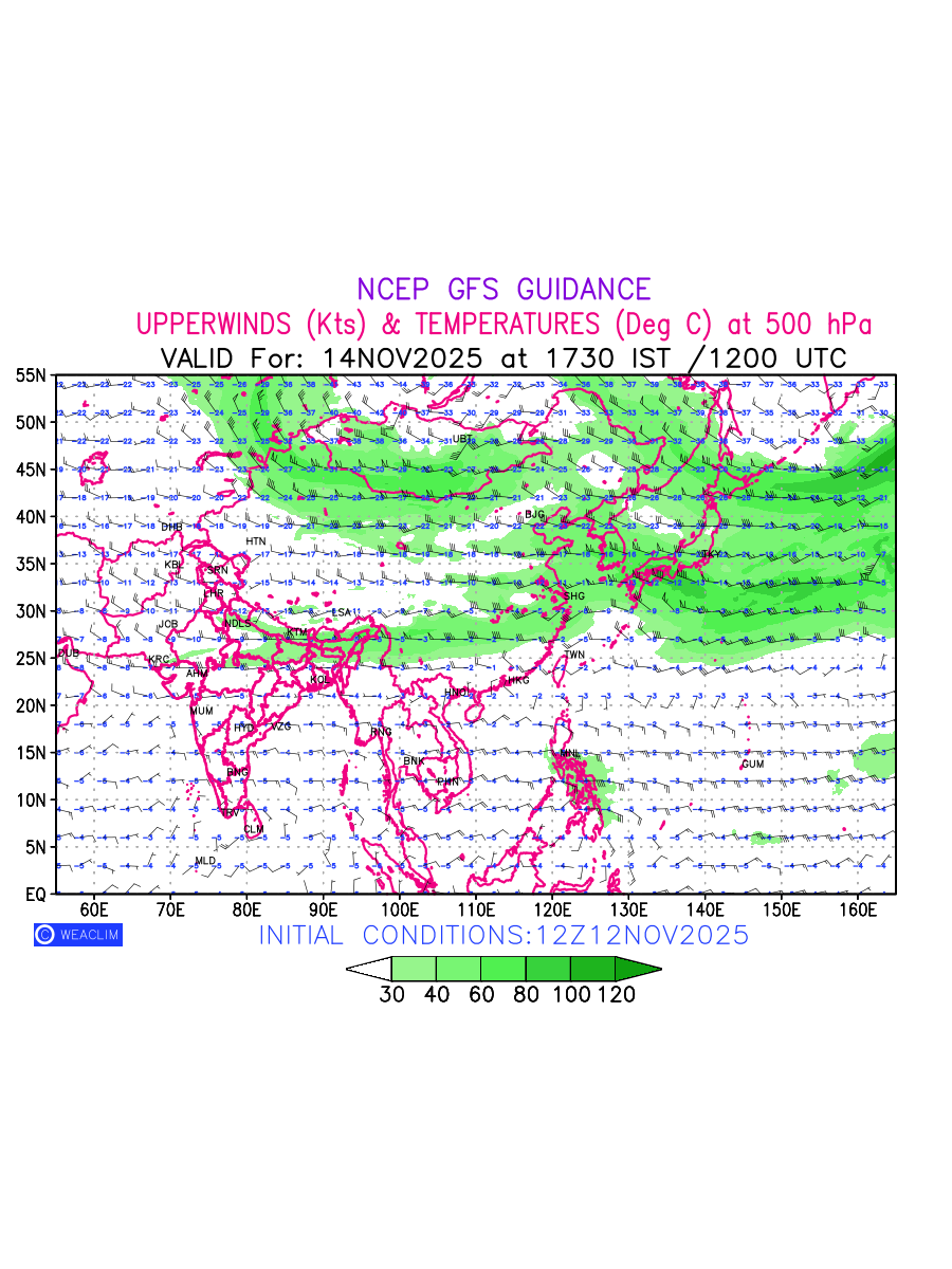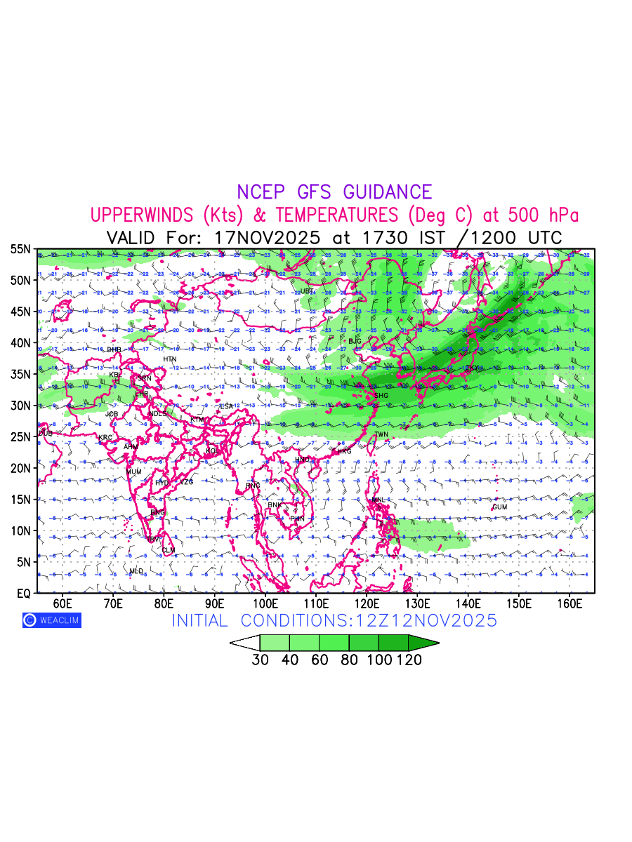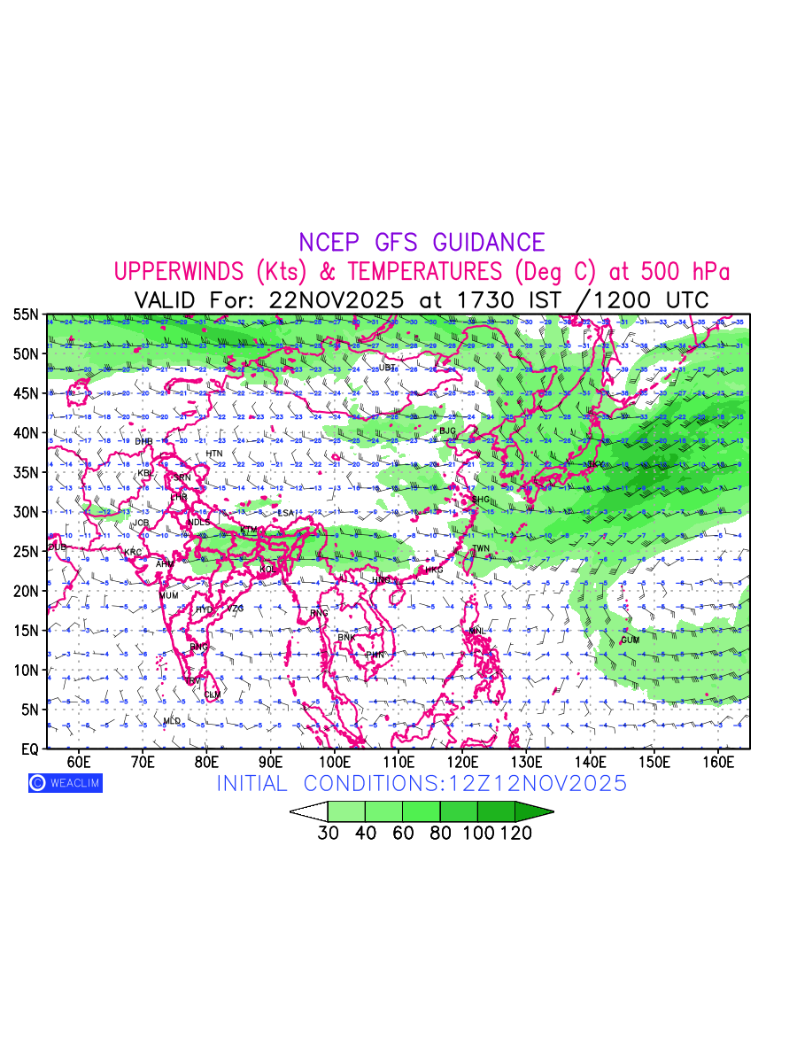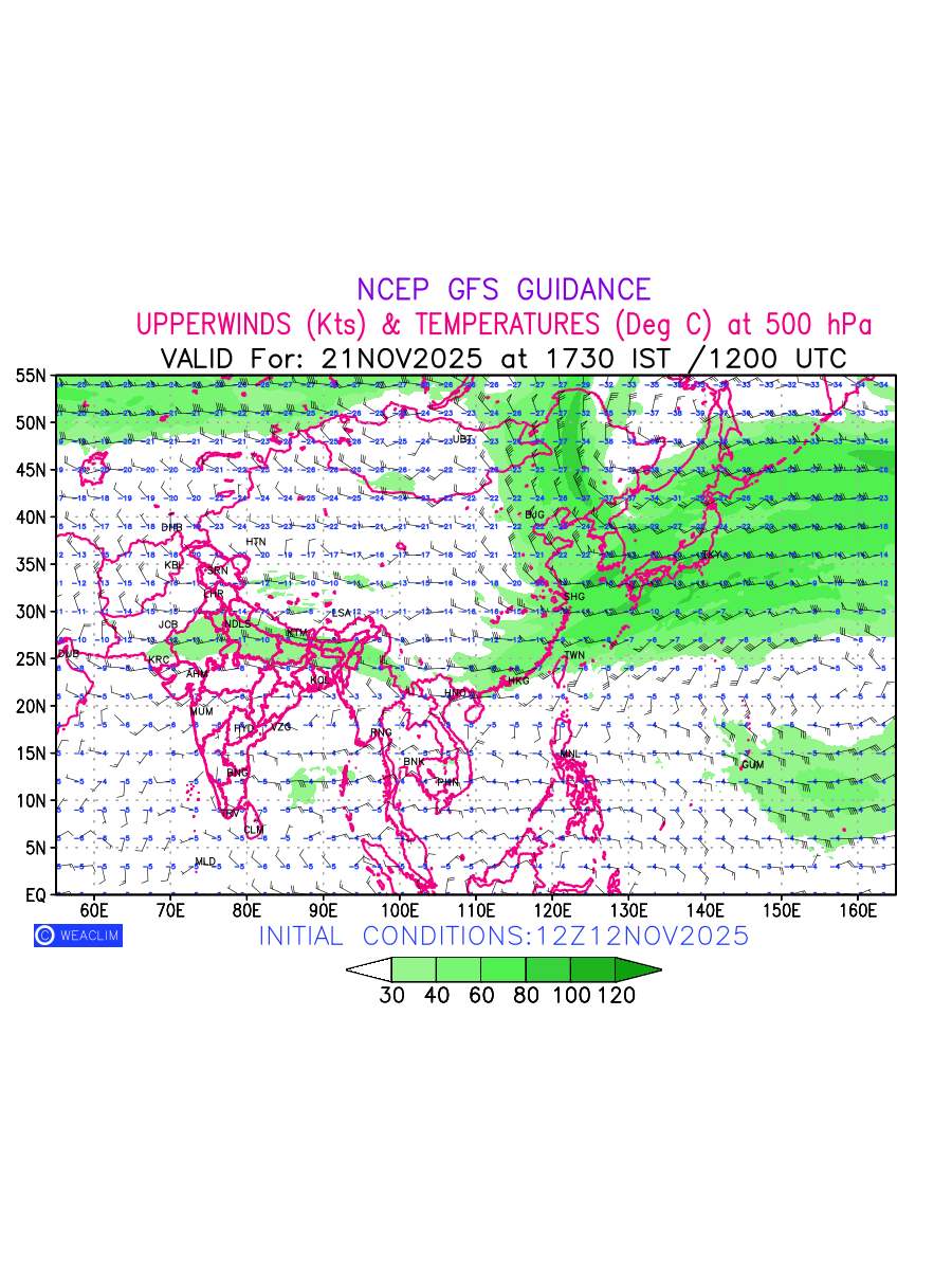 Winds at 500 hPa at the 24th hour for East Asia refers to the predicted wind direction and speed at a pressure level of 500 hPa, which is located in the upper troposphere about 5.5 km (18,000 ft) above the Earth’s surface.The winds are presented in knots (kt), and the direction is given in degrees from true north. Winds with magnitude of more than 40 kt are marked in shades of green. It provides important information on forecasting weather patterns, including the movement and intensification of storms, the development of weather fronts, and the location and strength of high and low pressure systems. Along with the wind speed (kt) and direction, upper air temperatures (Deg C) are also shown at the grid points over the East Asian Region at 500hPa level for the next ten days.