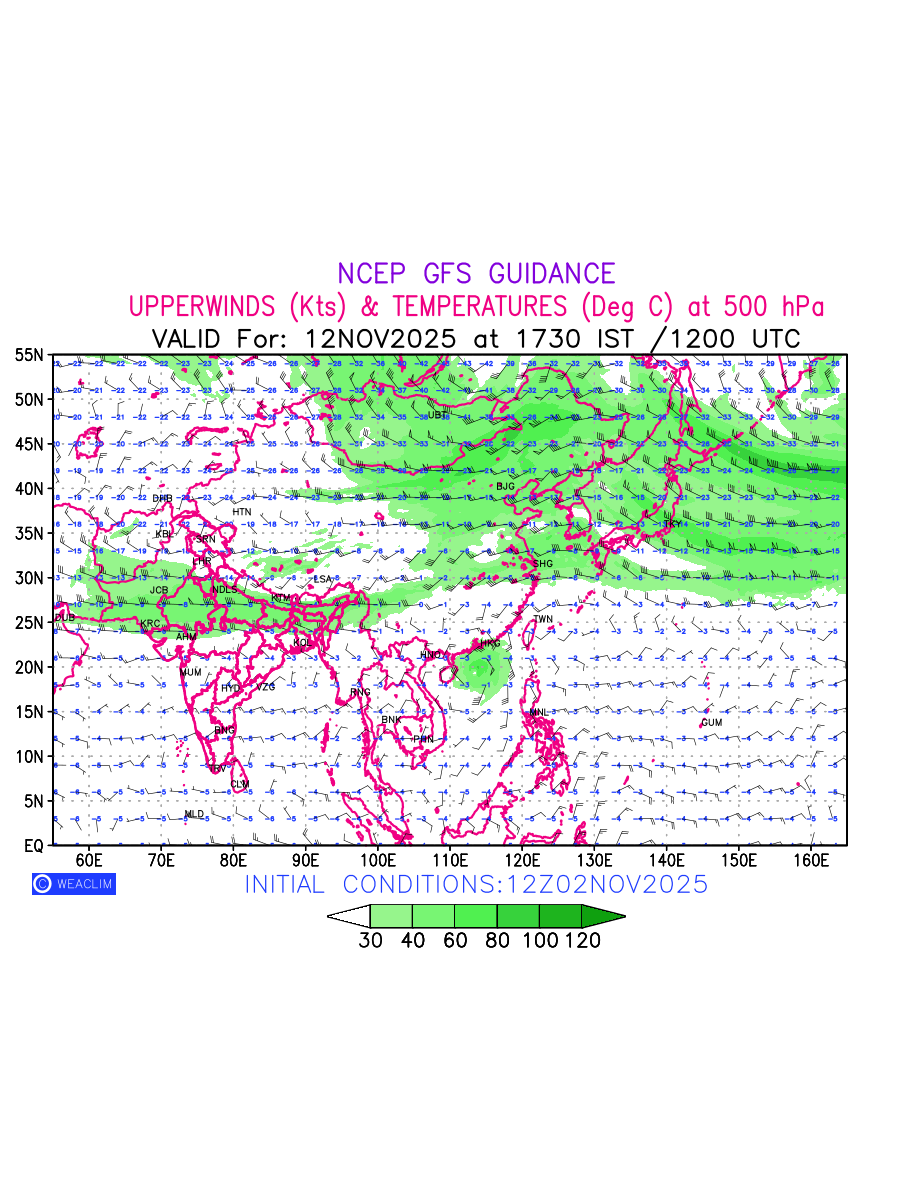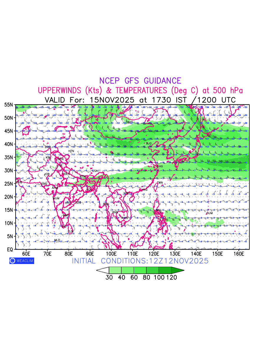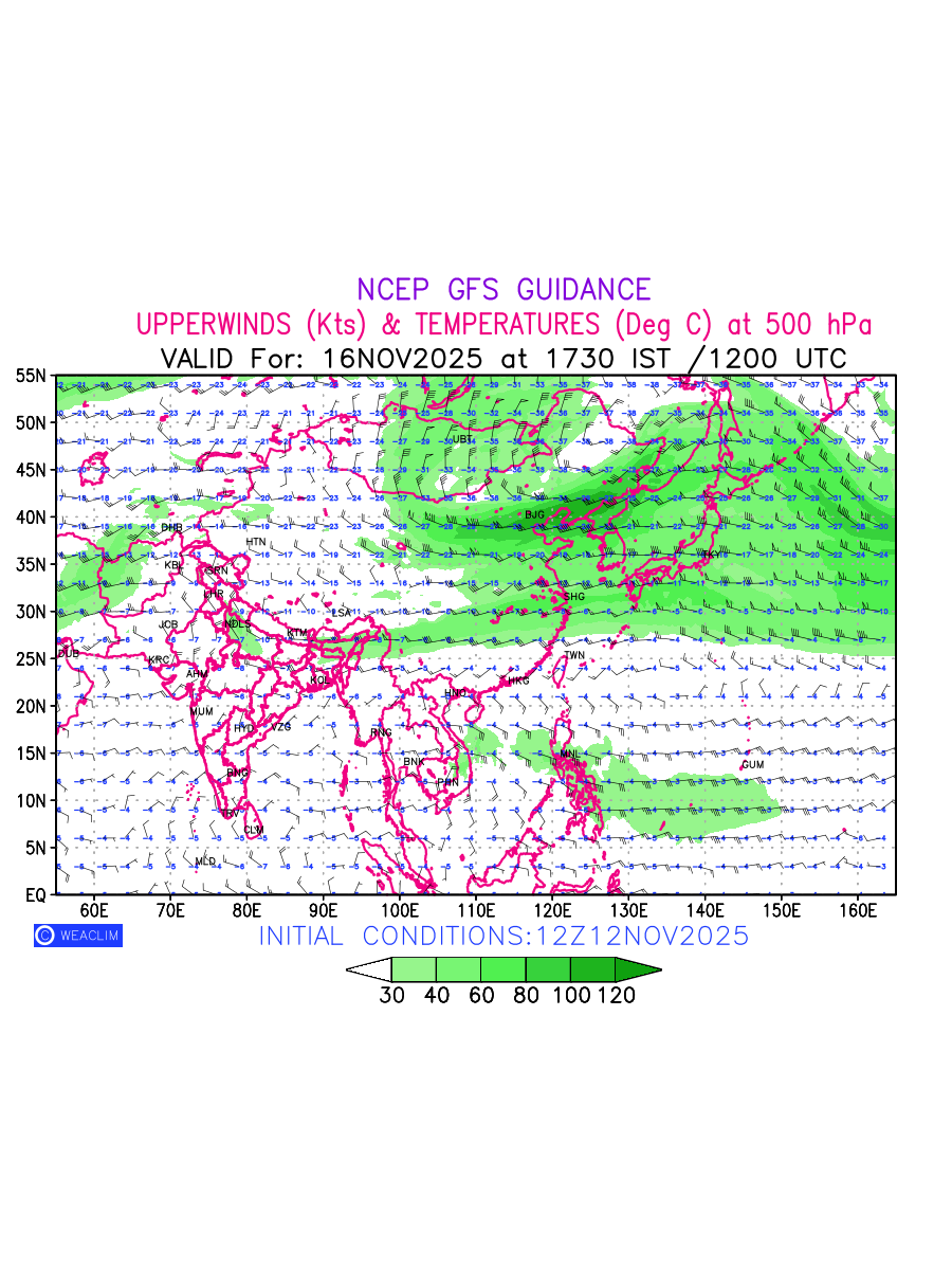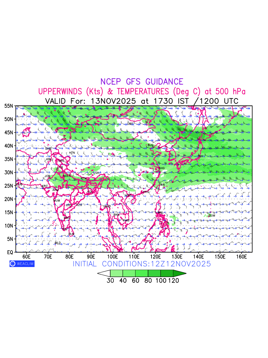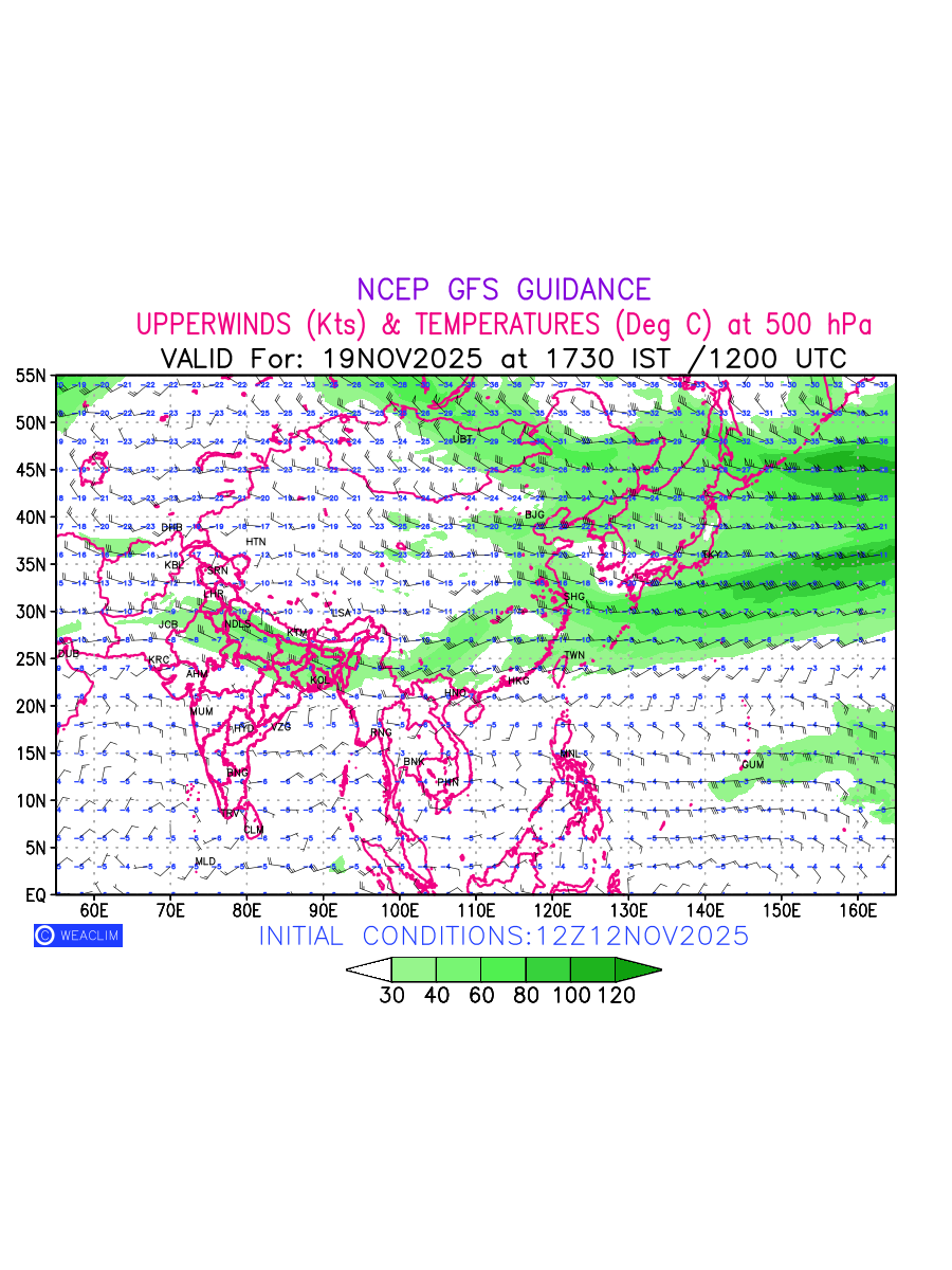 Winds at 500 hPa at the 24th hour for East Asia refers to the predicted wind direction and speed at a pressure level of 500 hPa, which is located in the upper troposphere about 5.5 km (18,000 ft) above the Earth’s surface.The winds are presented in knots (kt), and the direction is given in degrees from true north. Winds with magnitude of more than 40 kt are marked in shades of green. It provides important information on forecasting weather patterns, including the movement and intensification of storms, the development of weather fronts, and the location and strength of high and low pressure systems. Along with the wind speed (kt) and direction, upper air temperatures (Deg C) are also shown at the grid points over the East Asian Region at 500hPa level for the next ten days.