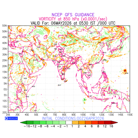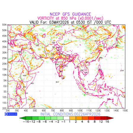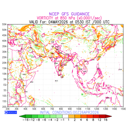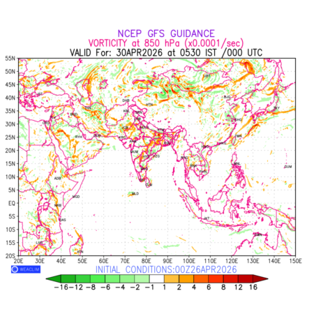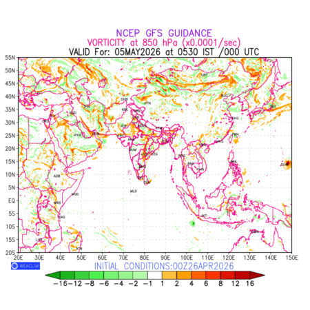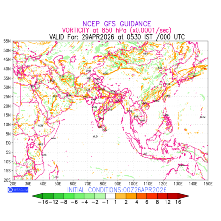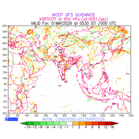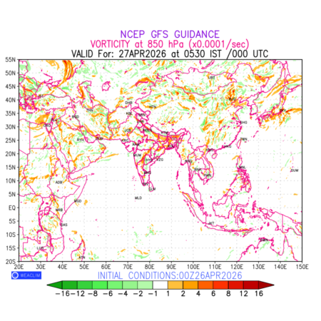 Low Level Convergence at the 24th hour for Eurasia is the graphical representation of the expected magnitude and pattern of horizontal rotation (or the vorticity) of atmosphere around a vertical axis or the vorticity at 850 hPa (1.5km). In northern hemisphere it is typically displayed with warm colors ranging from shades of red (to yellow) indicating positive vorticity (cyclonic rotation), and cool colors shades of green (to blue) indicating negative vorticity (anticyclonic rotation). They are useful tools for identifying areas of high and low vorticity, associated with weather systems such as fronts, lows, and highs etc.