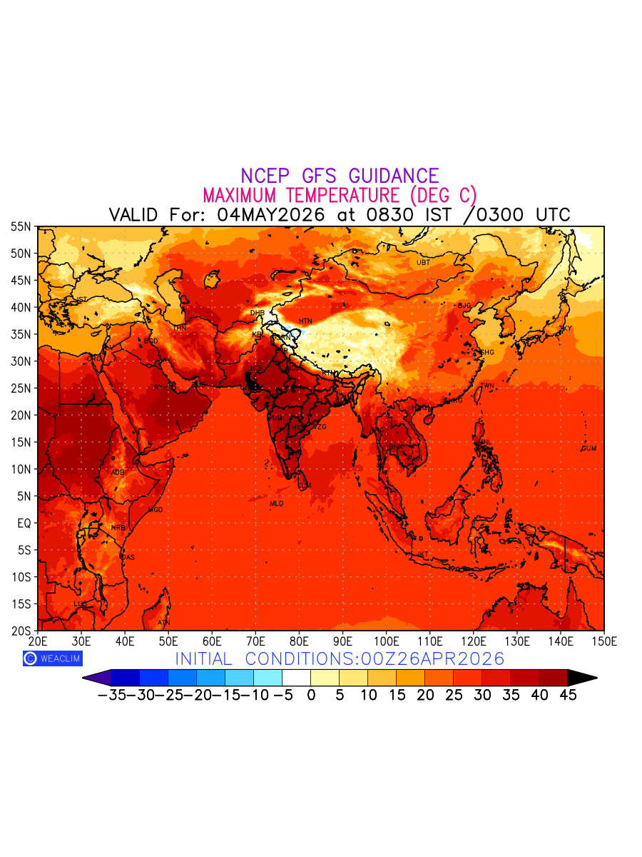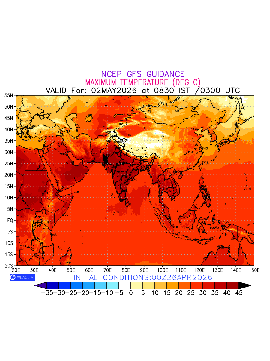 Maximum Temperature for Eurasia countries depicts the highest temperatures at 2m above the ground surface between 0300 UTC of the previous date to 0300 UTC of the required date. This is an important variable for weather forecasting, as it determines the conditions at the Earth’s surface during the warmest part of the date, affecting human activities, agriculture, and the environment. 2m Temperature data can be used for a variety of applications, such as predicting the onset of heatwaves or cold spells, forecasting temperature trends, and studying the impact of weather on various systems and processes.