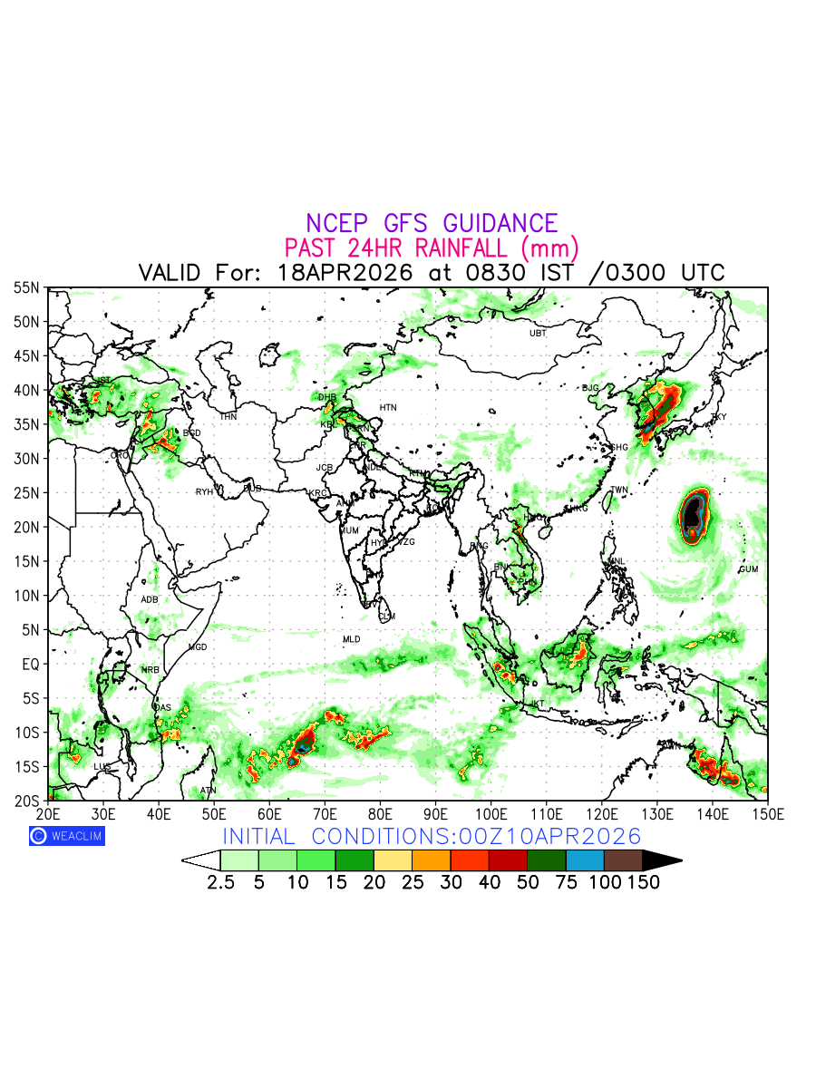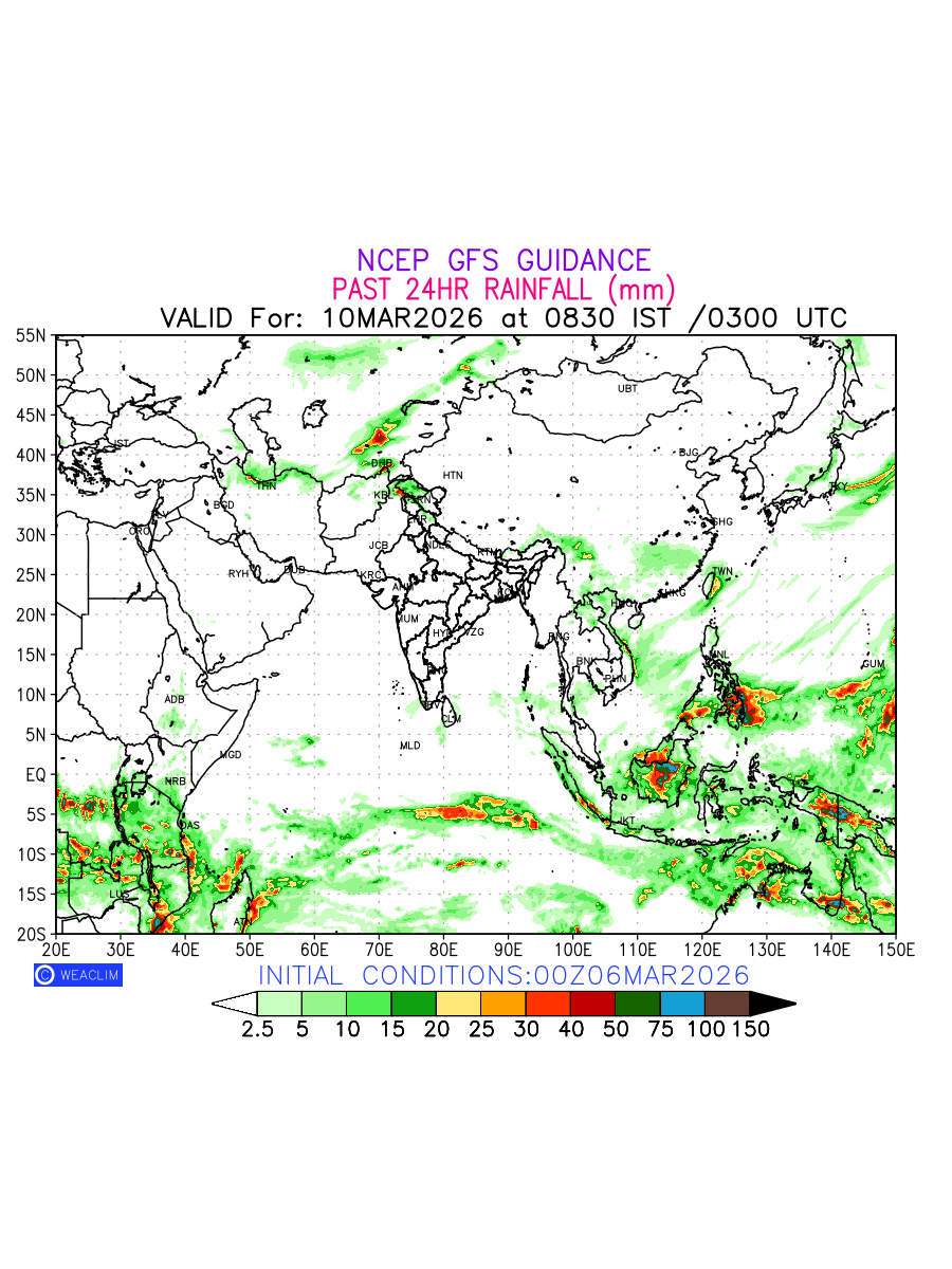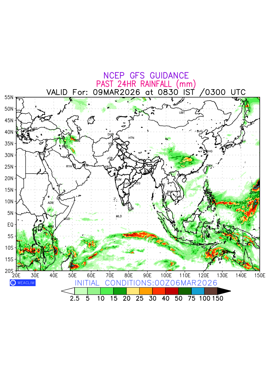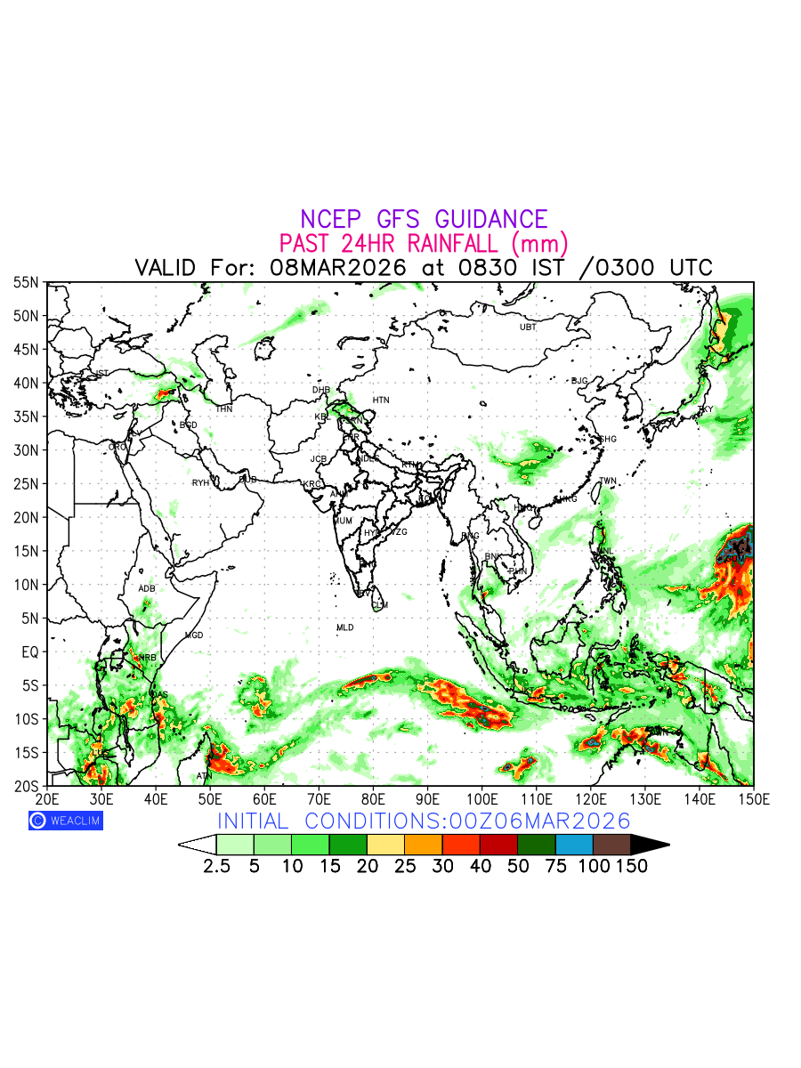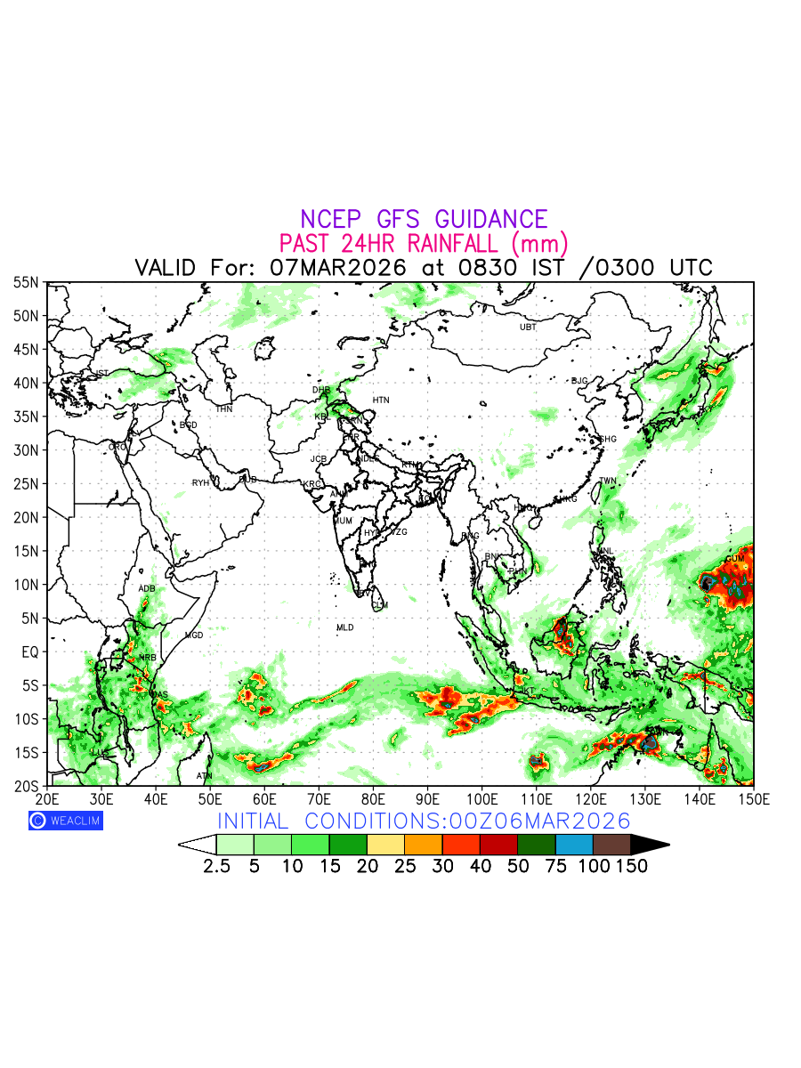 Rainfall forecast for 24 hours for Eurasia is expected amount of precipitation in millimeters for a given area over a time period of 24 hours and valid from 0300 UTC (0830 IST) of the previous date to 0300 UTC of the required date. This prediction enables the users to plan/review their tasks that are affected by rainfall related severe weather events that may lead to flooding, drought, snowfall and avalanche etc.