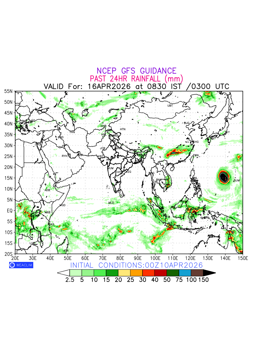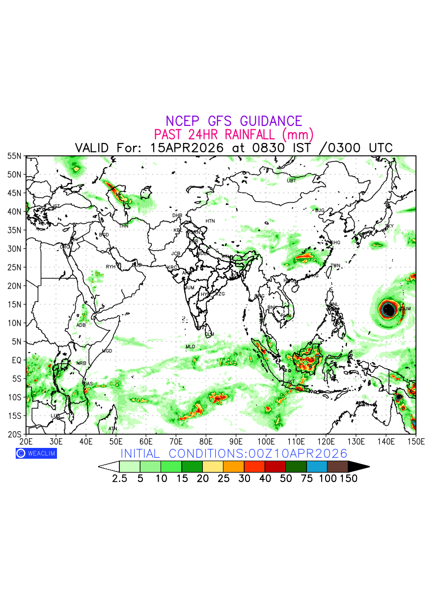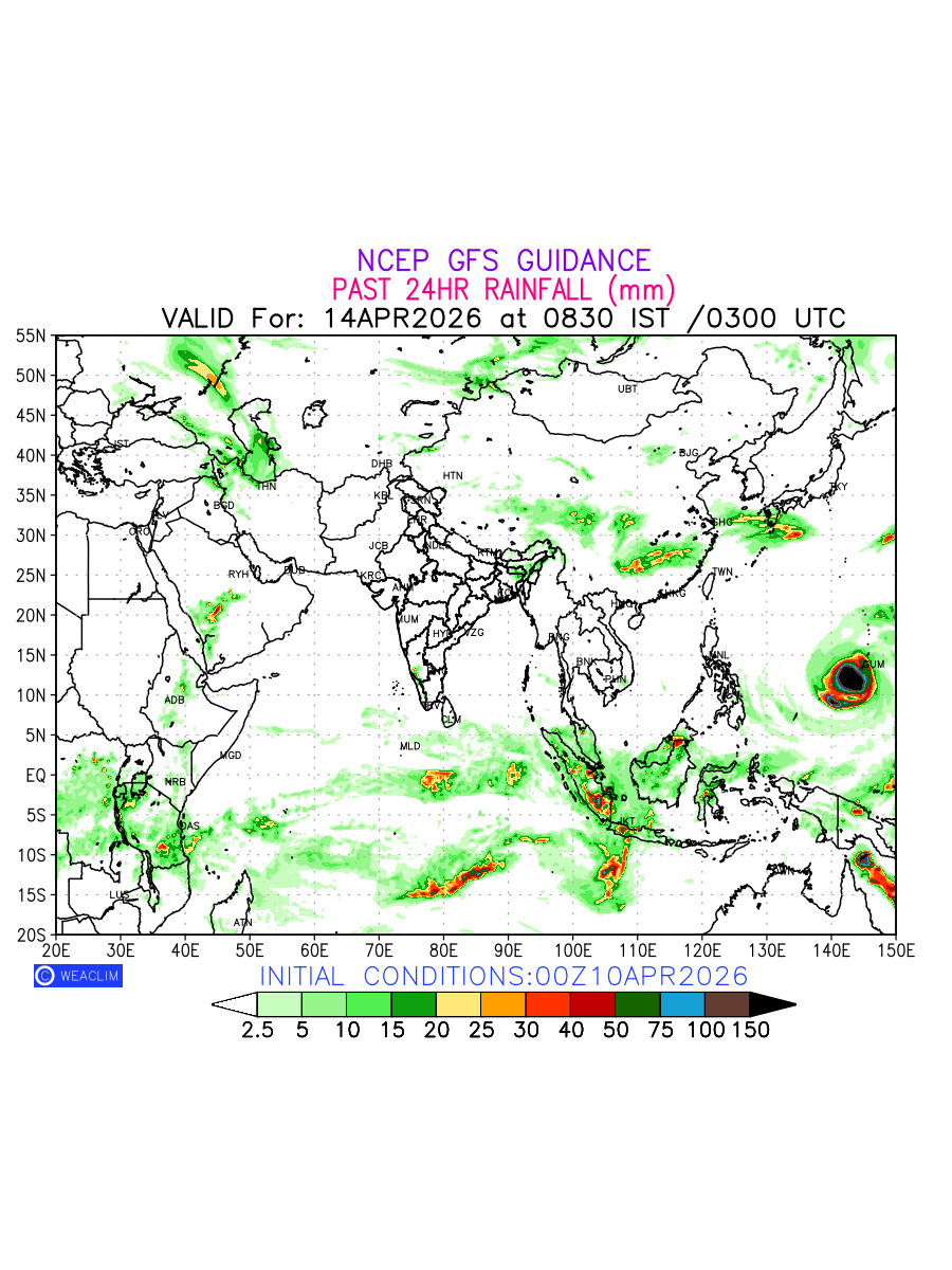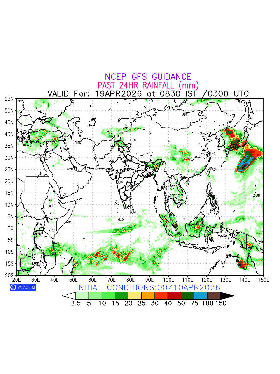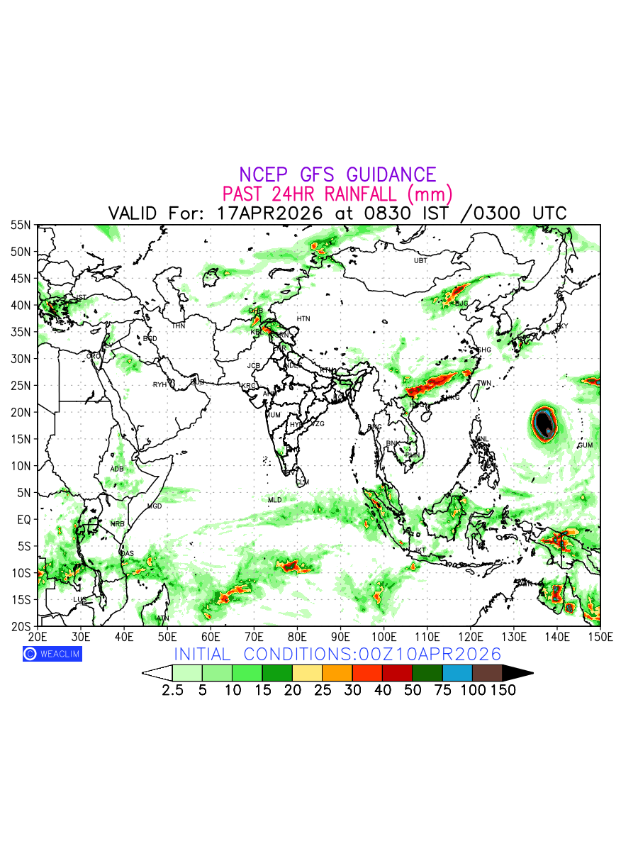 Rainfall forecast for 24 hours for Eurasia is expected amount of precipitation in millimeters for a given area over a time period of 24 hours and valid from 0300 UTC (0830 IST) of the previous date to 0300 UTC of the required date. This prediction enables the users to plan/review their tasks that are affected by rainfall related severe weather events that may lead to flooding, drought, snowfall and avalanche etc.