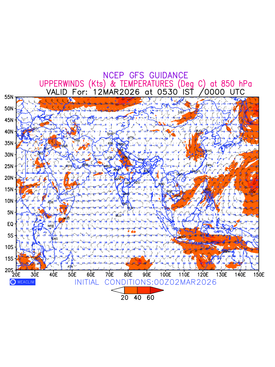 Winds at 850 hPa at the 24th hour for Eurasia refers to the predicted wind direction and speed at a pressure level of 850 hPa, which is located in the lower troposphere (1,500 meters or 5,000 feet above the Earth’s surface). The winds are presented in knots (kt), and the direction is given in degrees from true north. Winds with magnitude of more than 20 kt are marked in shades of red. Being close to the Earth’s surface it is strongly influenced by surface features such as mountains, valleys, and bodies of water. It gives insight into the strength and direction of wind flow in the lower troposphere, affecting the movement of weather systems and the transport of heat, moisture, and pollutants in the atmosphere. Depiction also shows the temperature along with the wind barb on the grid points at 850 hPa. Along with the wind speed (kt) and direction, upper air temperatures (Deg C) are also shown at the grid points over the Eurasian Region at 850 hPa level for the next ten days.