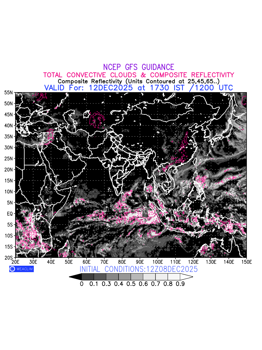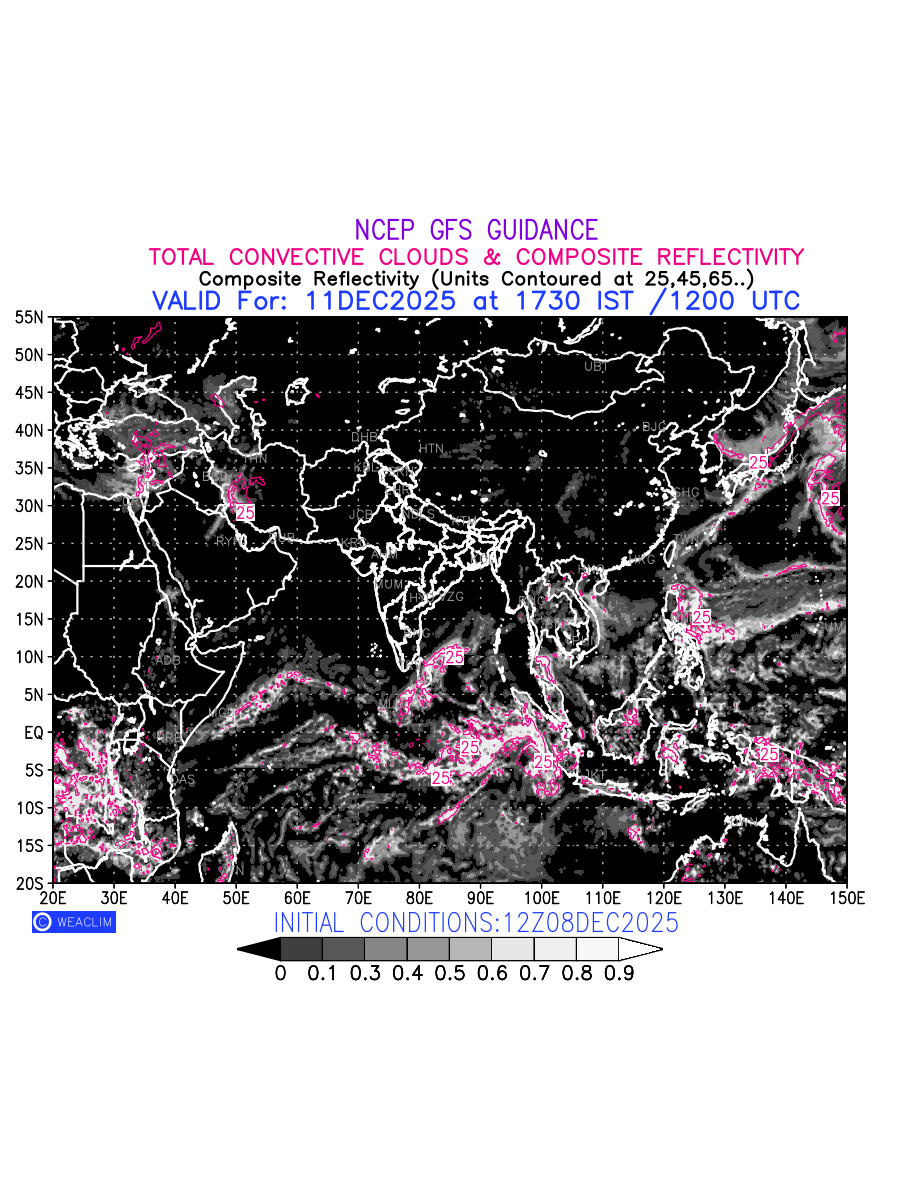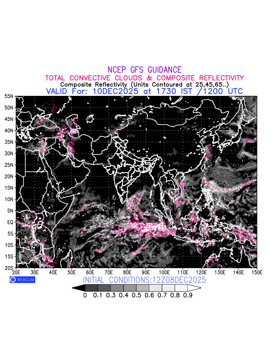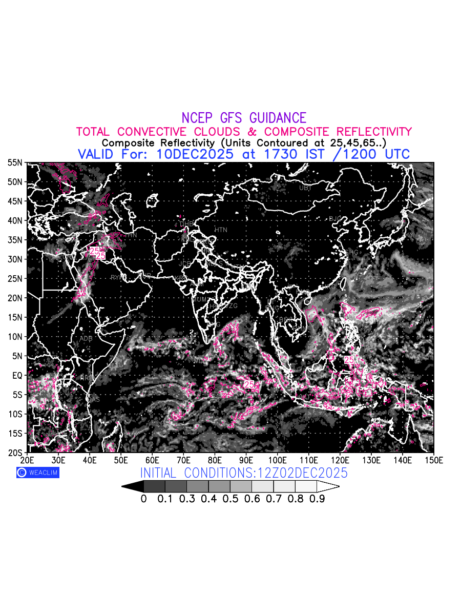 Convective clouds are formed by the vertical movement of air in the atmosphere and are associated with thunderstorms and other types of severe weather like intense rainfall, strong gusty winds etc. Shades from black to white on scale of 0 to 1 with whiter shade depicting more intensity of convection has been used in the depiction. Also shown is the Composite Reflectivity that takes the maximum reflectivity from each elevation angle of the Doppler Weather Radar and meshes it into one image. Advantage of this type of image is the ability to quickly assess the intensity of storms. Predicted pattern of Total Convective Clouds and percentage of the sky covered by them is shown here along with Composite Reflectivity over the Eurasian Region for the next ten days.