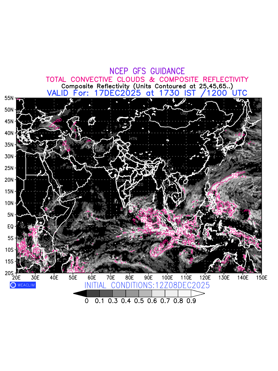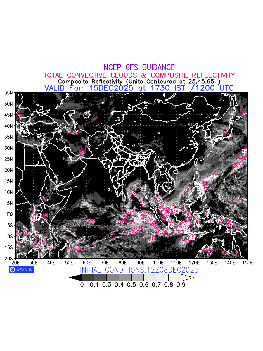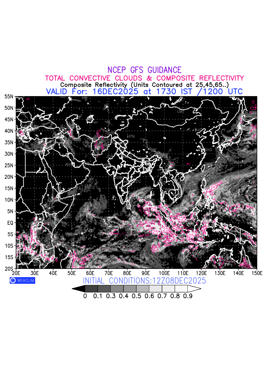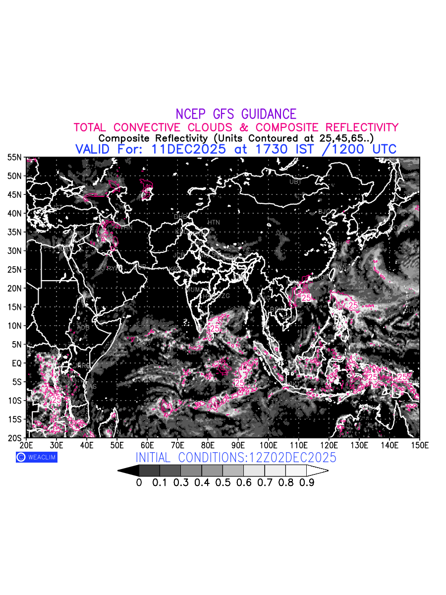 Convective clouds are formed by the vertical movement of air in the atmosphere and are associated with thunderstorms and other types of severe weather like intense rainfall, strong gusty winds etc. Shades from black to white on scale of 0 to 1 with whiter shade depicting more intensity of convection has been used in the depiction. Also shown is the Composite Reflectivity that takes the maximum reflectivity from each elevation angle of the Doppler Weather Radar and meshes it into one image. Advantage of this type of image is the ability to quickly assess the intensity of storms. Predicted pattern of Total Convective Clouds and percentage of the sky covered by them is shown here along with Composite Reflectivity over the Eurasian Region for the next ten days.