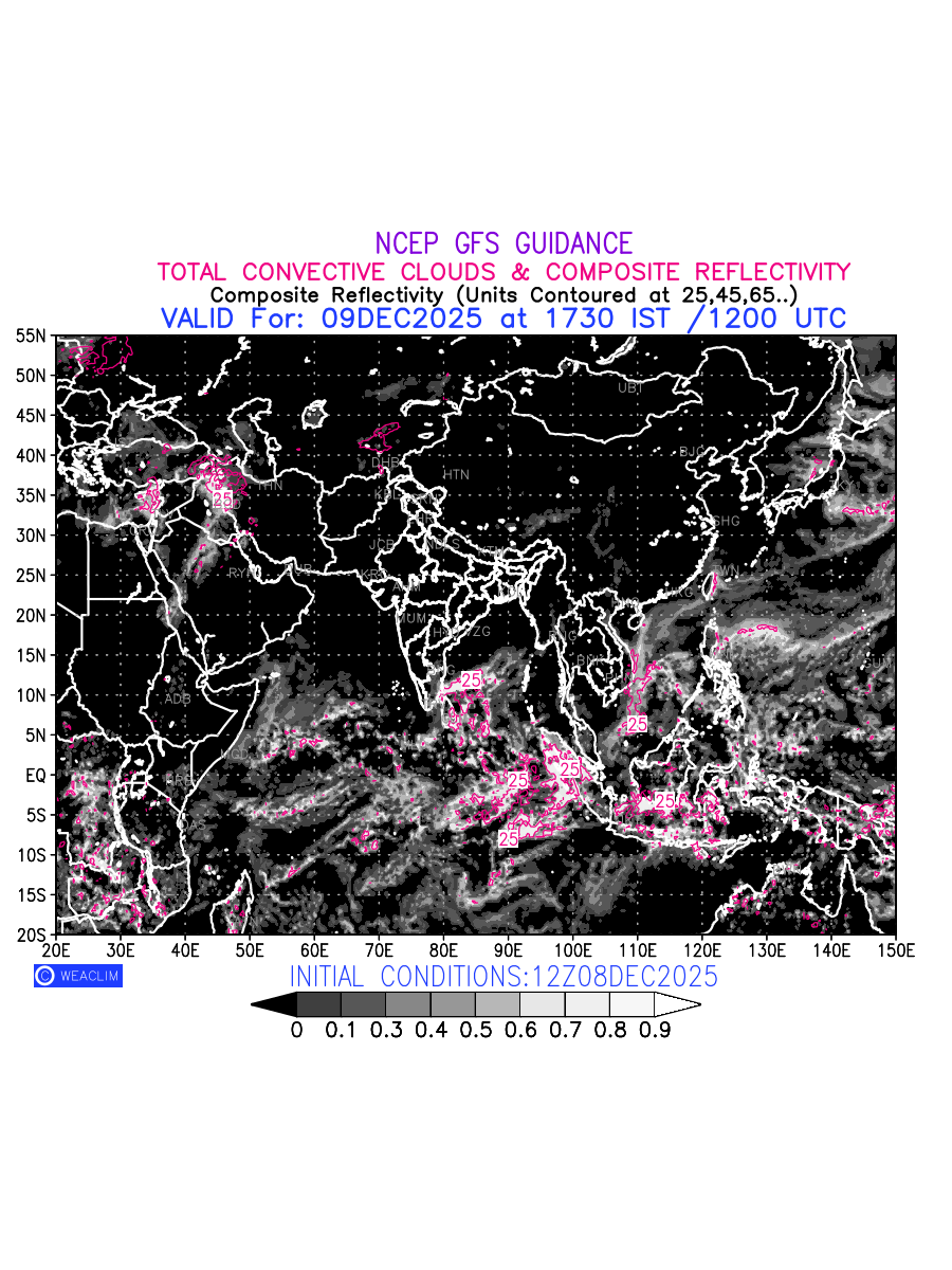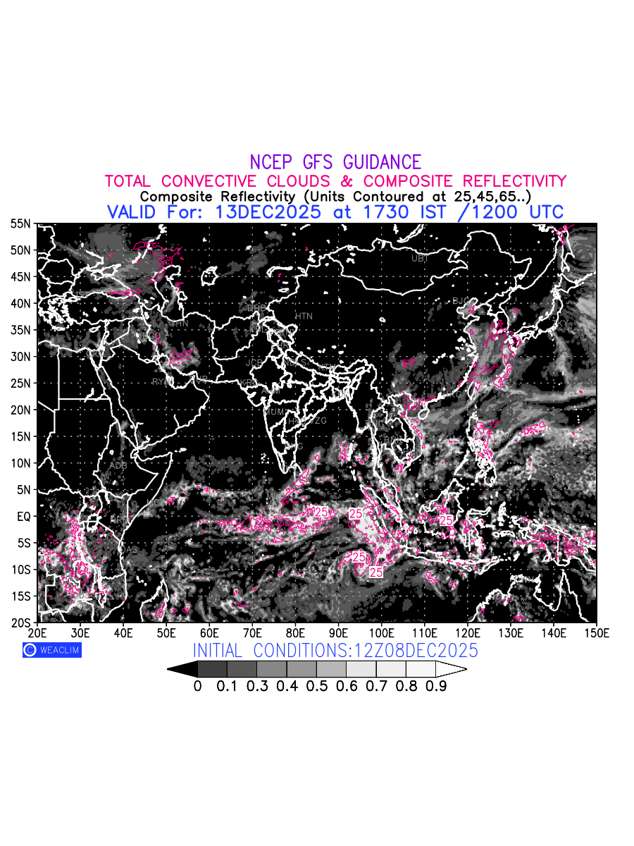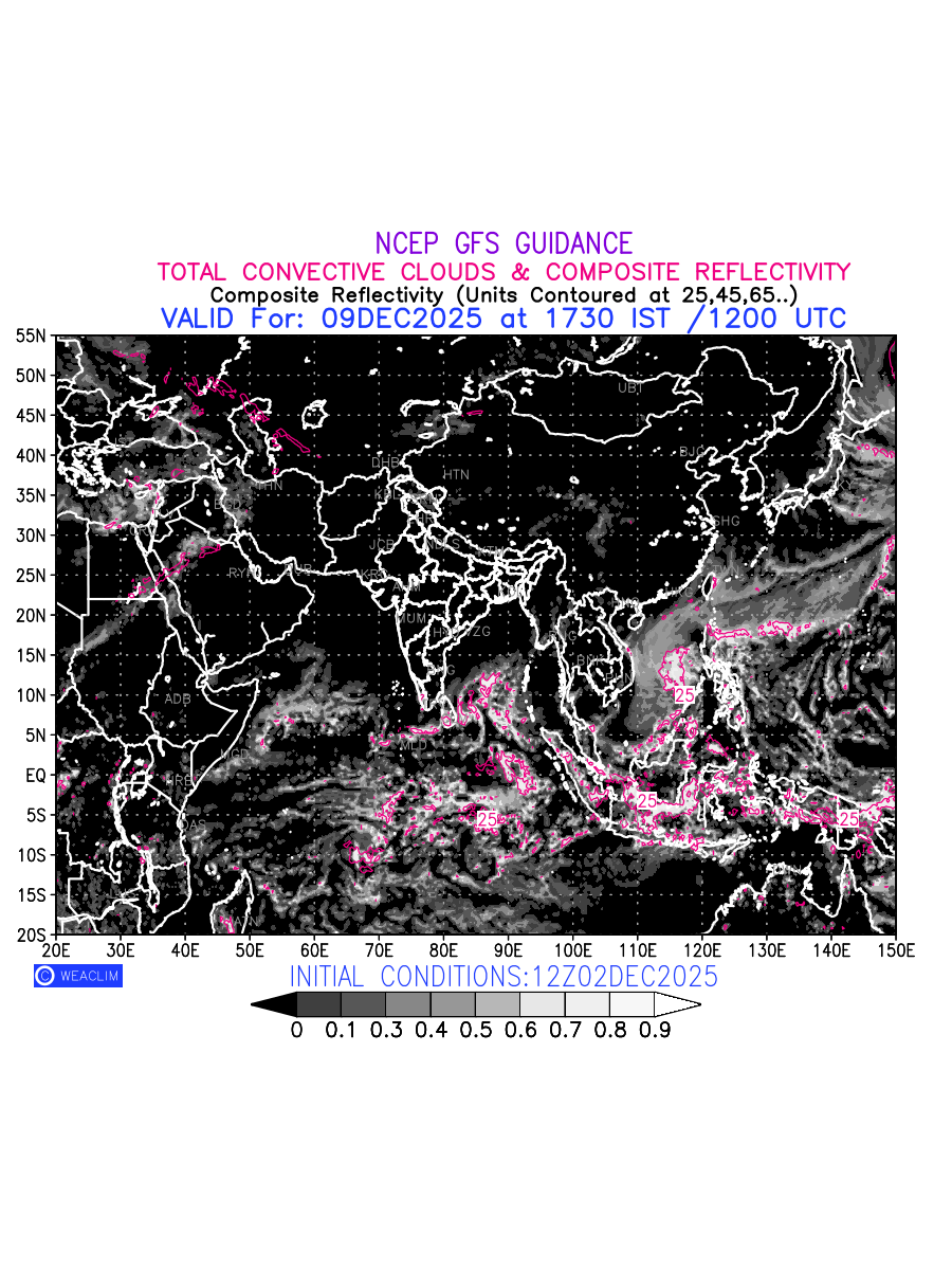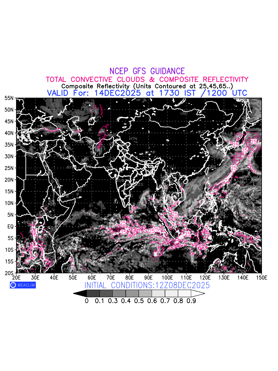 Convective clouds are formed by the vertical movement of air in the atmosphere and are associated with thunderstorms and other types of severe weather like intense rainfall, strong gusty winds etc. Shades from black to white on scale of 0 to 1 with whiter shade depicting more intensity of convection has been used in the depiction. Also shown is the Composite Reflectivity that takes the maximum reflectivity from each elevation angle of the Doppler Weather Radar and meshes it into one image. Advantage of this type of image is the ability to quickly assess the intensity of storms. Predicted pattern of Total Convective Clouds and percentage of the sky covered by them is shown here along with Composite Reflectivity over the Eurasian Region for the next ten days.