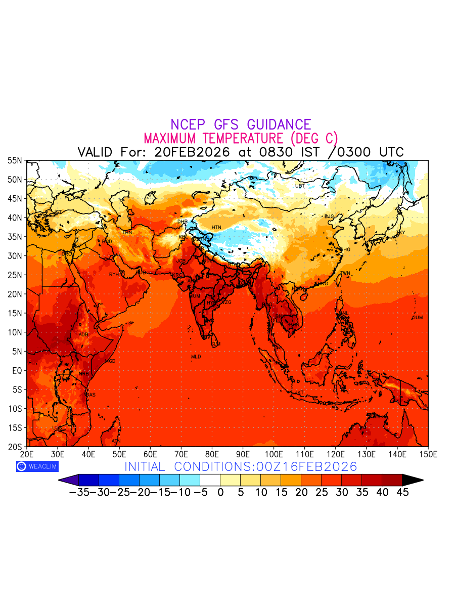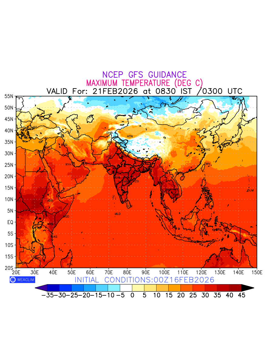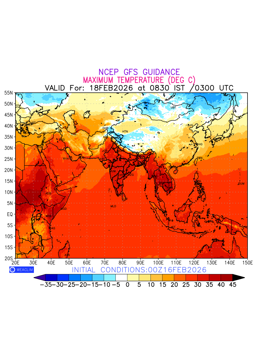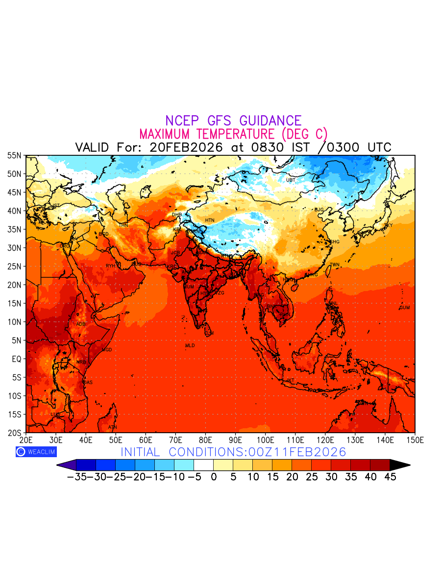 Maximum Temperature for Eurasia countries depicts the highest temperatures at 2m above the ground surface between 0300 UTC of the previous date to 0300 UTC of the required date. This is an important variable for weather forecasting, as it determines the conditions at the Earth’s surface during the warmest part of the date, affecting human activities, agriculture, and the environment. 2m Temperature data can be used for a variety of applications, such as predicting the onset of heatwaves or cold spells, forecasting temperature trends, and studying the impact of weather on various systems and processes.