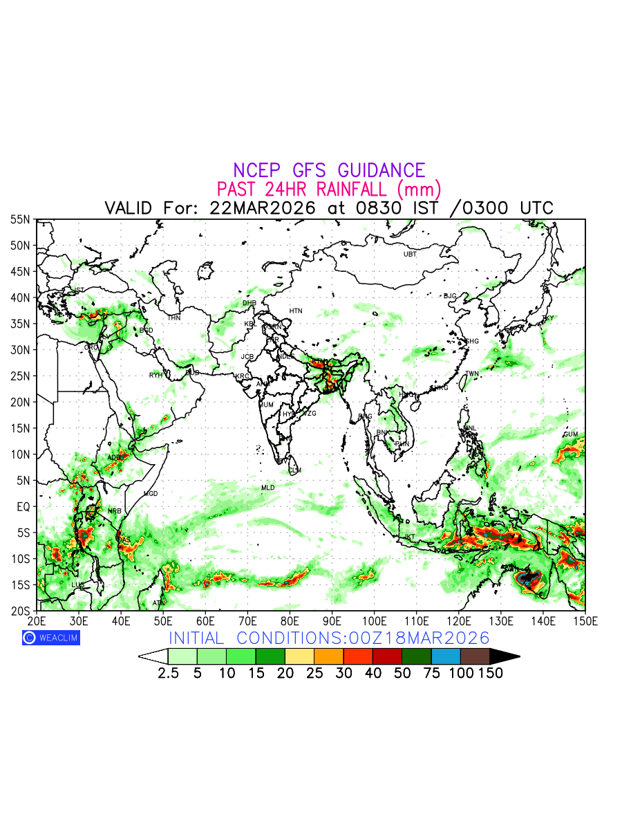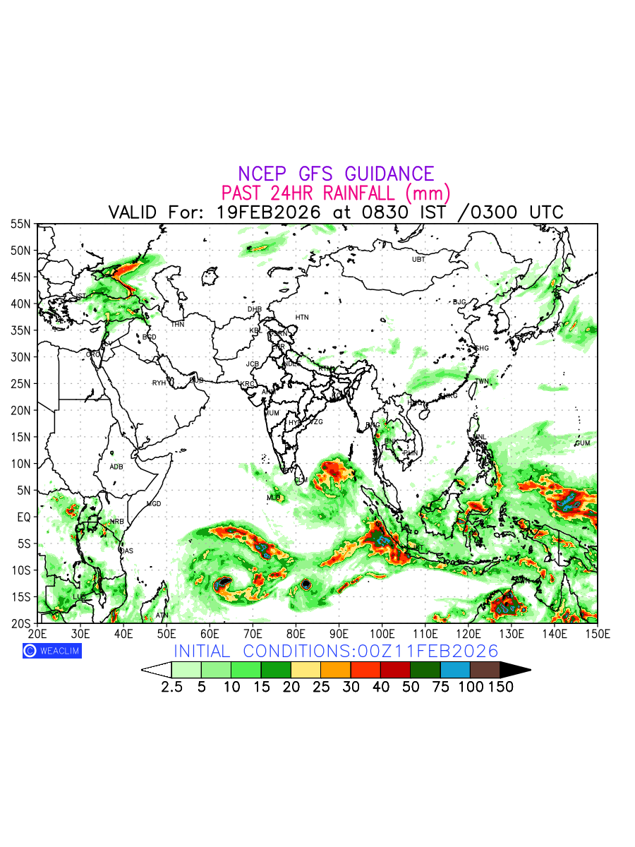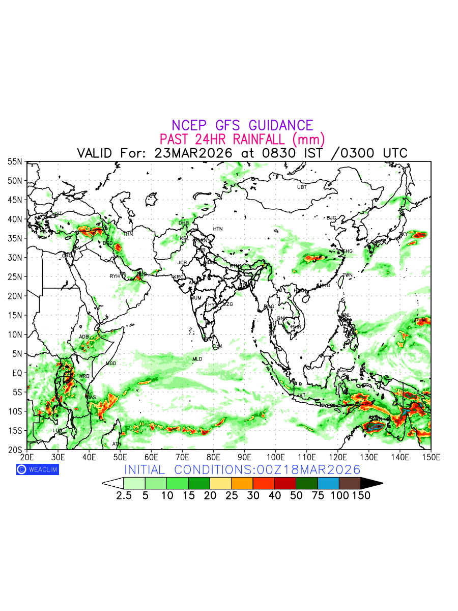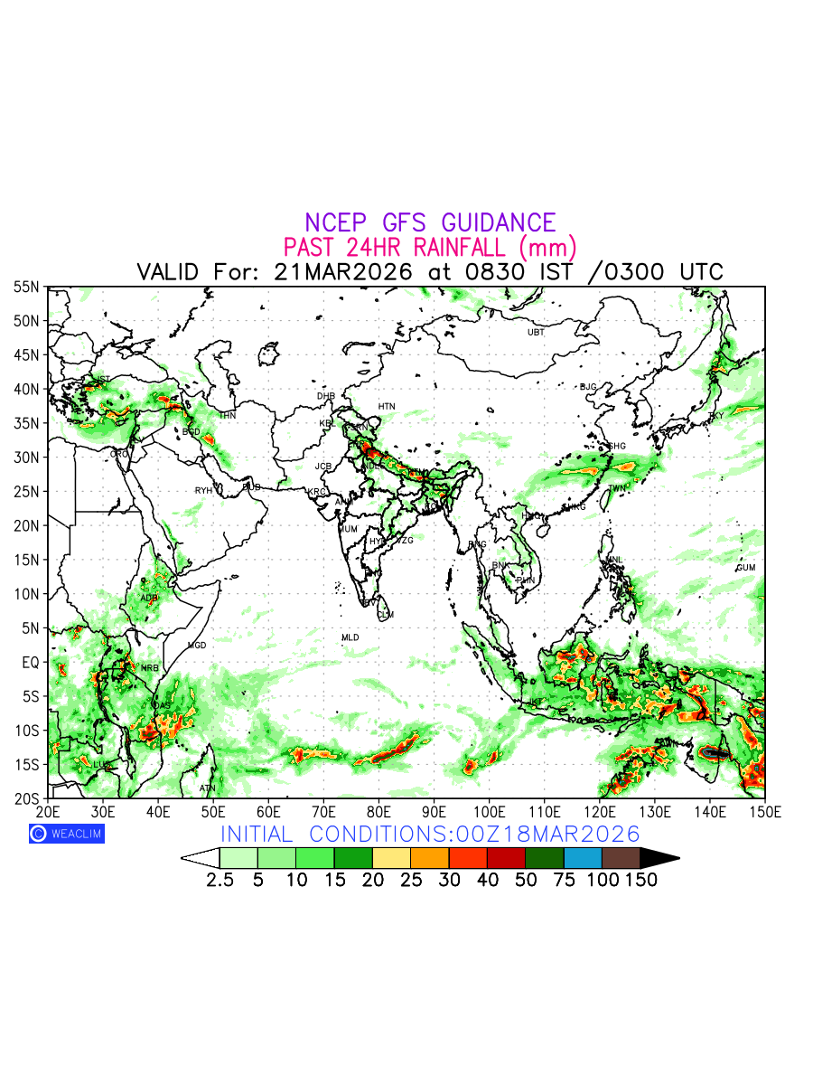 Rainfall forecast for 24 hours for Eurasia is expected amount of precipitation in millimeters for a given area over a time period of 24 hours and valid from 0300 UTC (0830 IST) of the previous date to 0300 UTC of the required date. This prediction enables the users to plan/review their tasks that are affected by rainfall related severe weather events that may lead to flooding, drought, snowfall and avalanche etc.