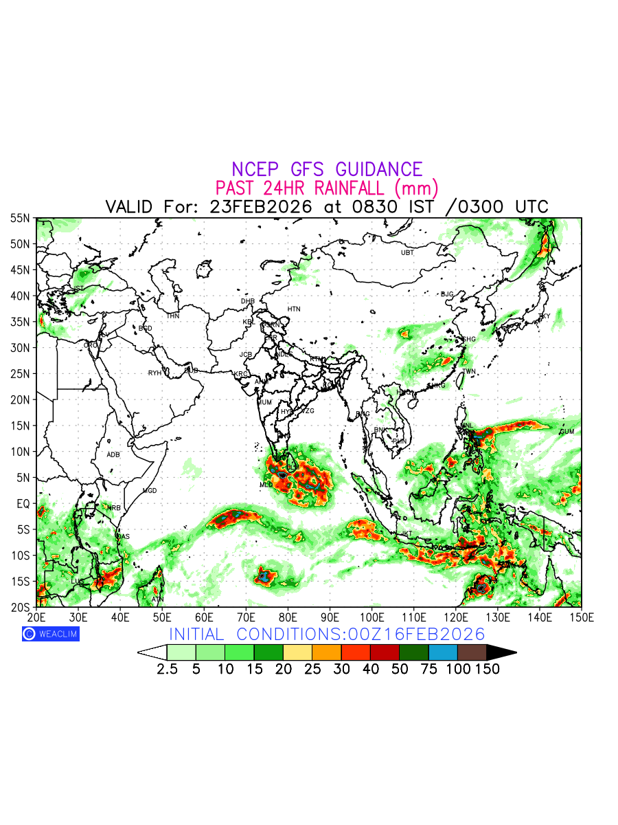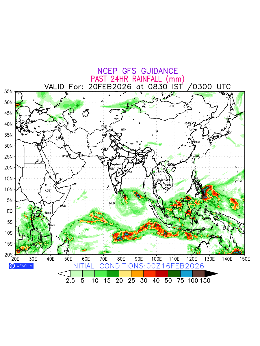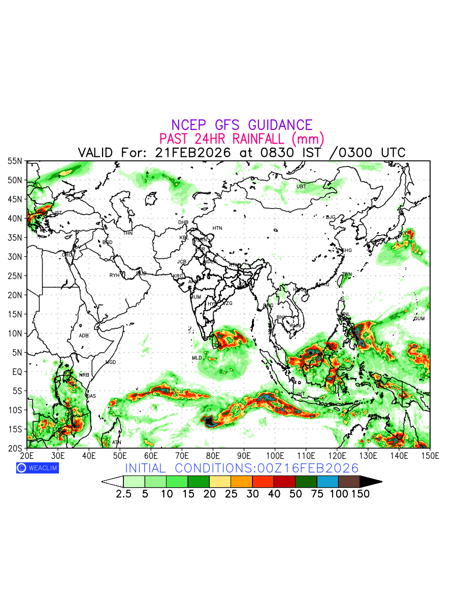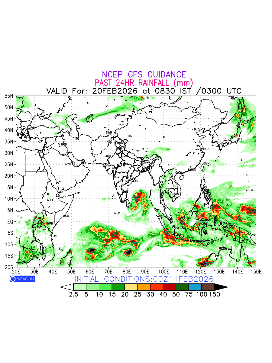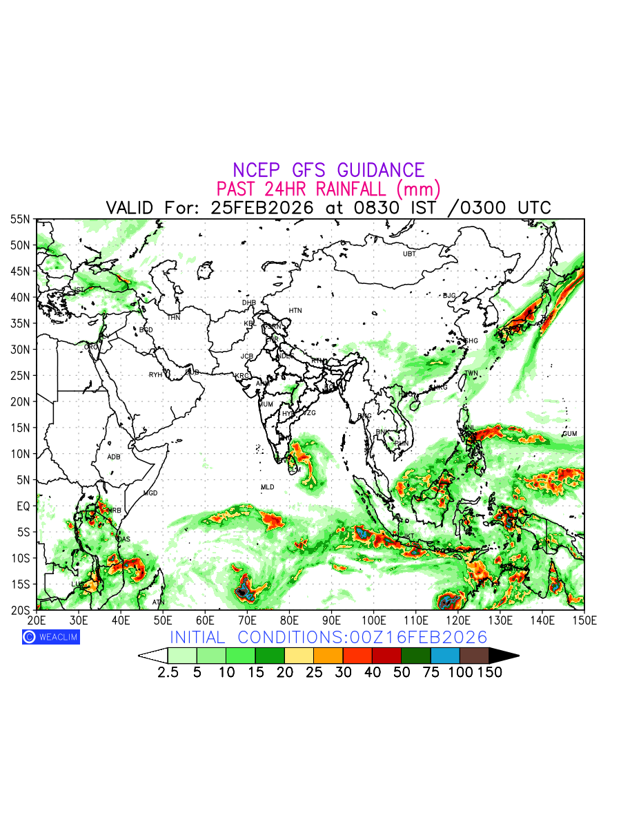 Rainfall forecast for 24 hours for Eurasia is expected amount of precipitation in millimeters for a given area over a time period of 24 hours and valid from 0300 UTC (0830 IST) of the previous date to 0300 UTC of the required date. This prediction enables the users to plan/review their tasks that are affected by rainfall related severe weather events that may lead to flooding, drought, snowfall and avalanche etc.