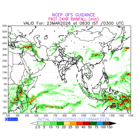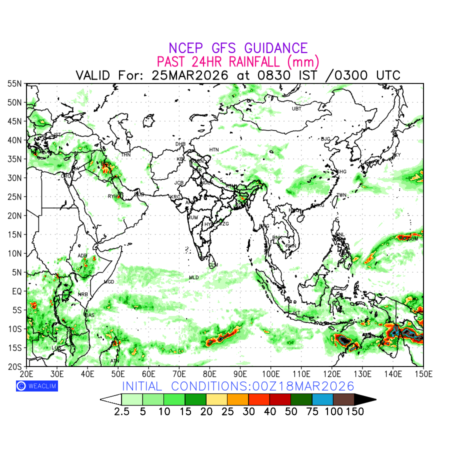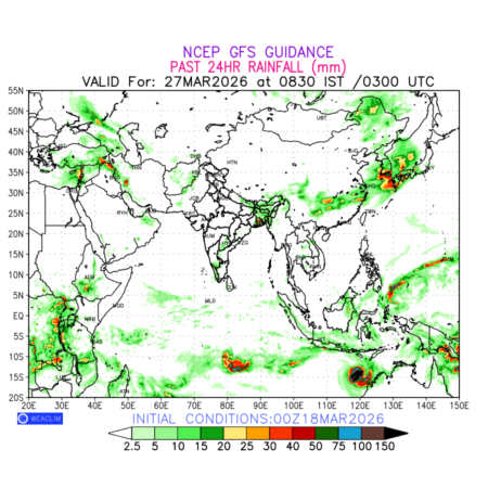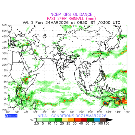 Rainfall forecast for 24 hours for Eurasia is expected amount of precipitation in millimeters for a given area over a time period of 24 hours and valid from 0300 UTC (0830 IST) of the previous date to 0300 UTC of the required date. This prediction enables the users to plan/review their tasks that are affected by rainfall related severe weather events that may lead to flooding, drought, snowfall and avalanche etc.