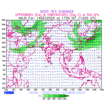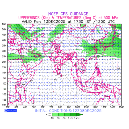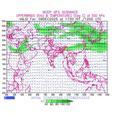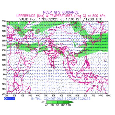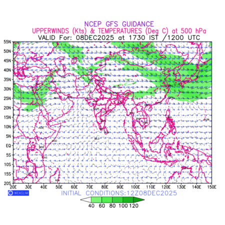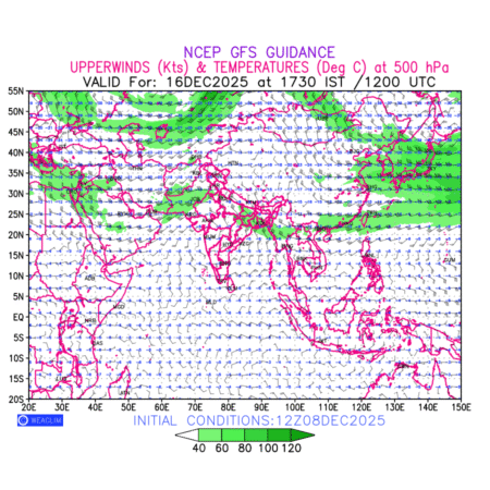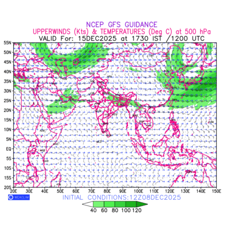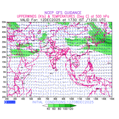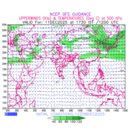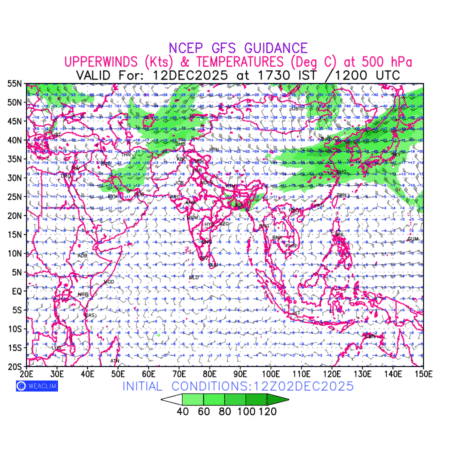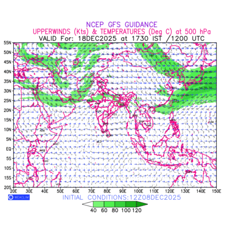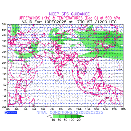 Winds at 500 hPa at the 24th hour for Eurasia refers to the predicted wind direction and speed at a pressure level of 500 hPa, which is located in the upper troposphere about 5.5 km (18,000 ft) above the Earths surface. The winds are presented in knots (kt), and the direction is given in degrees from true north. Winds with magnitude of more than 40 kt are marked in shades of green. It provides important information on forecasting weather patterns, including the movement and intensification of storms, the development of weather fronts, and the location and strength of high and low pressure systems. The depiction also shows the temperature along with the wind barb on the grid points at 500 hPa. Along with the wind speed (kt) and direction, upper air temperatures (Deg C) are also shown at the grid points over the Eurasian Region at 500 hPa level for the next ten days.