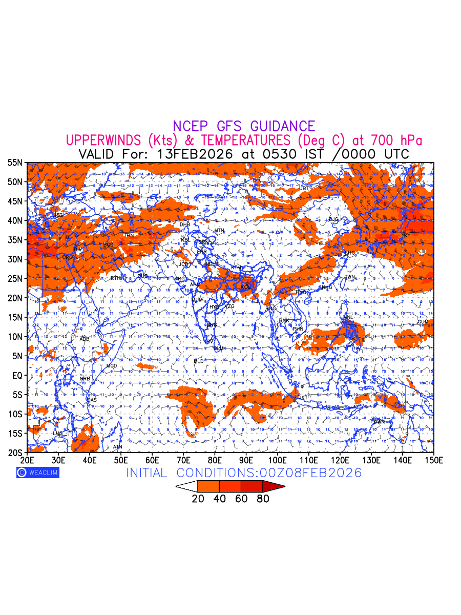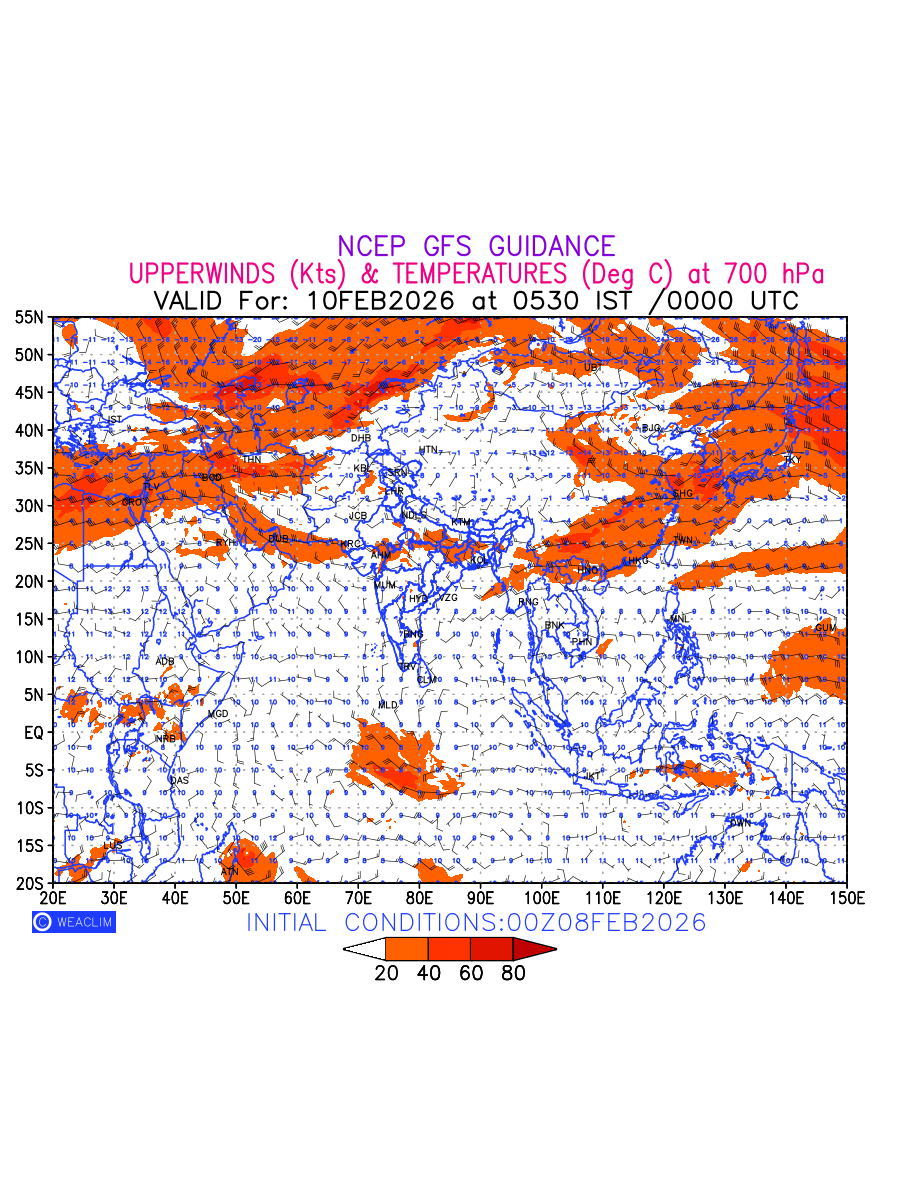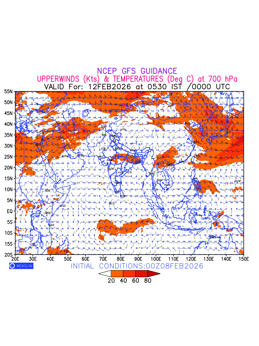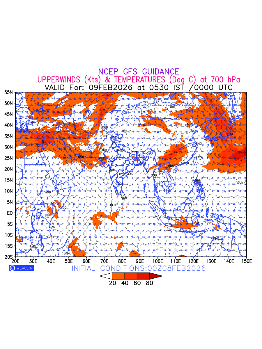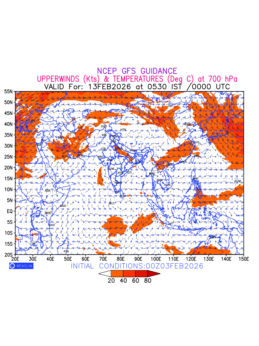 Winds at 700 hPa at the 24th hour for Eurasia refers to the predicted wind direction and speed at a pressure level of 700 hPa, which is located in the middle troposphere (approximately 3,000 meters or 10,000 feet above the Earths surface). The winds are presented in knots (kt), and the direction is given in degrees from true north. Winds with magnitude of more than 20 kt are marked in shades of red. At this level, the wind speed and direction can influence the movement and development of weather systems such as storms, fronts, and high-pressure systems. The depiction also shows the temperature along with the wind barb on the grid points at 700 hPa. Along with the wind speed (kt) and direction, upper air temperatures (Deg C) are also shown at the grid points over the Eurasian Region at 700 hPa level for the next ten days.
