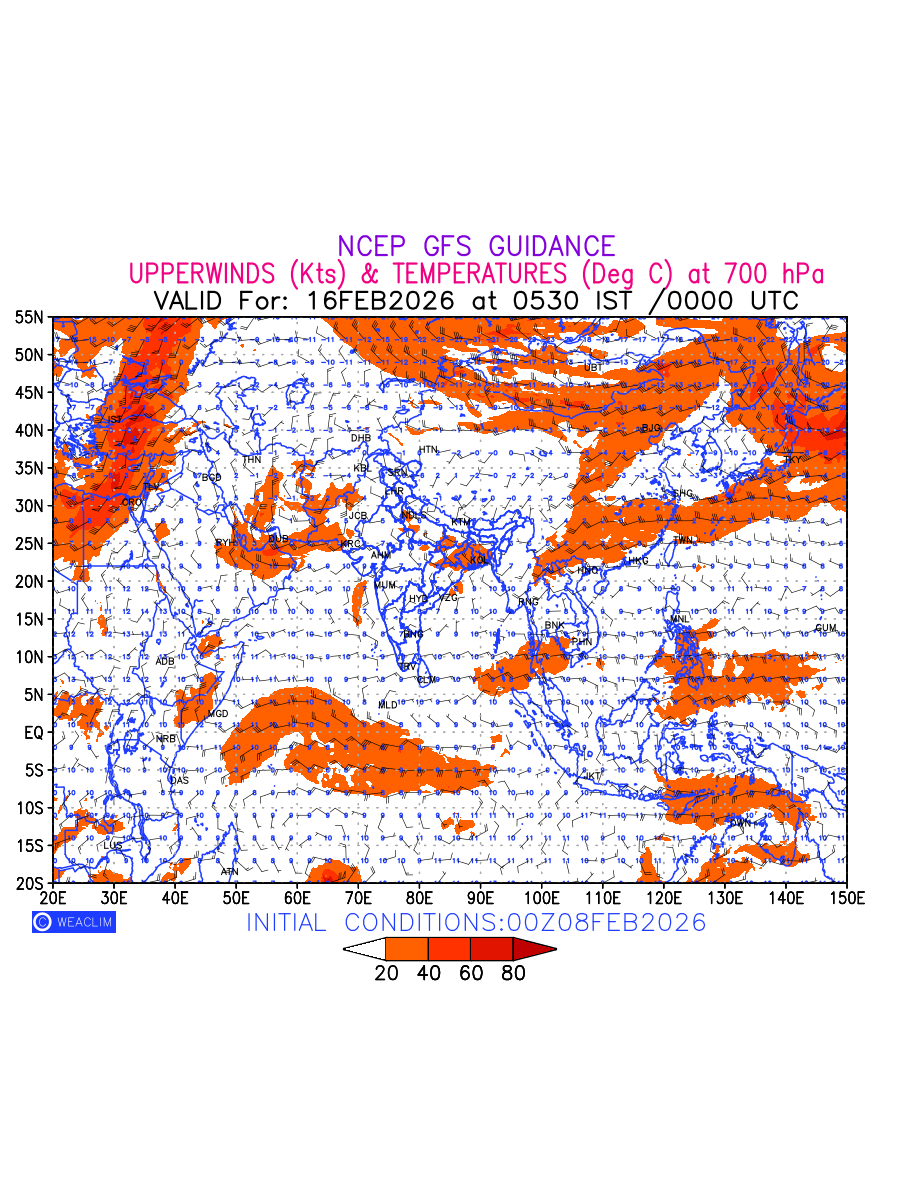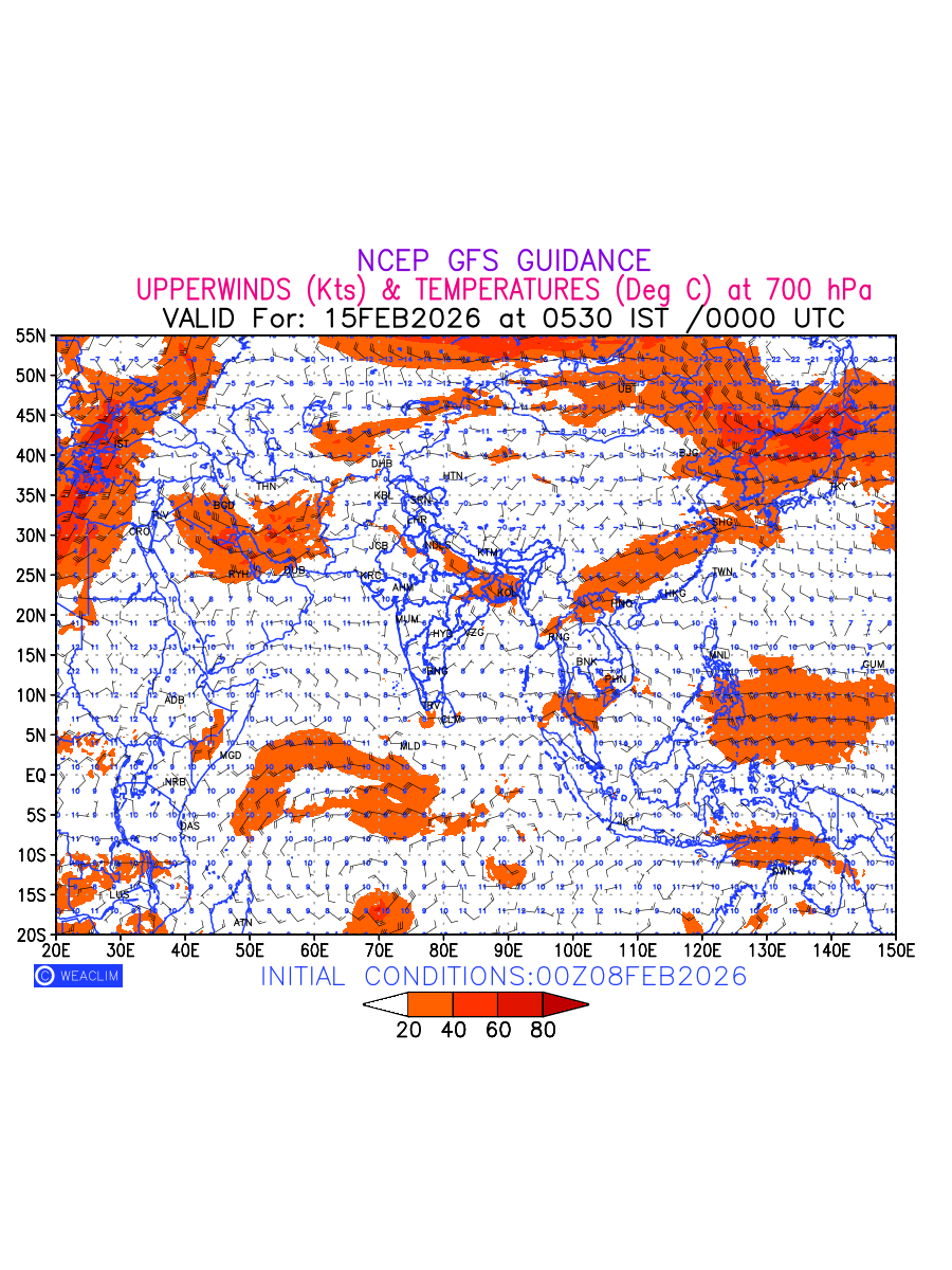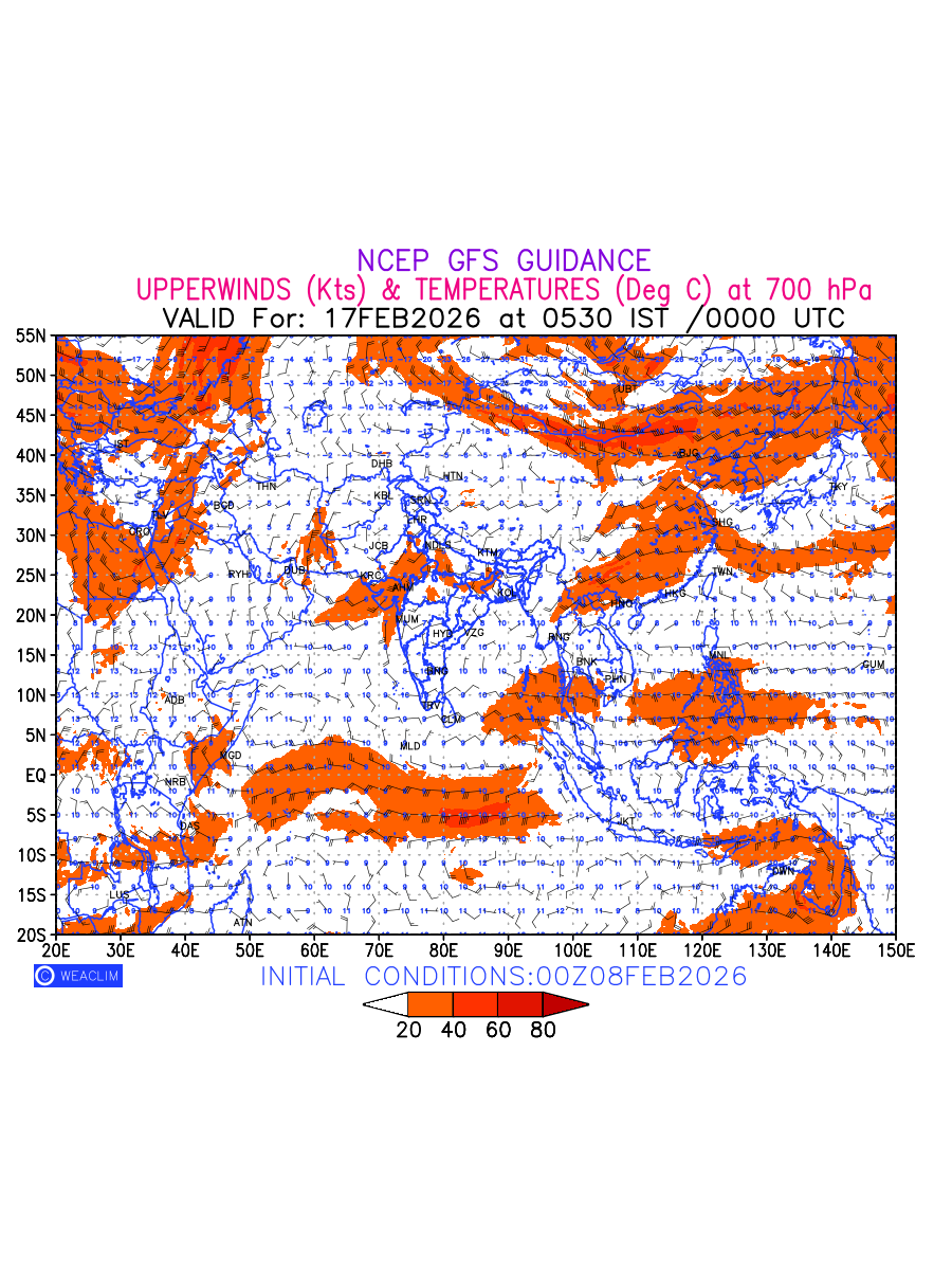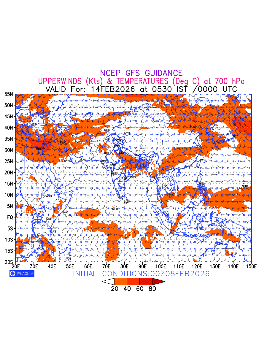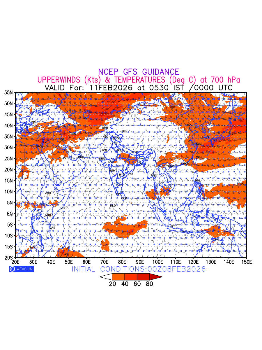 Winds at 700 hPa at the 24th hour for Eurasia refers to the predicted wind direction and speed at a pressure level of 700 hPa, which is located in the middle troposphere (approximately 3,000 meters or 10,000 feet above the Earths surface). The winds are presented in knots (kt), and the direction is given in degrees from true north. Winds with magnitude of more than 20 kt are marked in shades of red. At this level, the wind speed and direction can influence the movement and development of weather systems such as storms, fronts, and high-pressure systems. The depiction also shows the temperature along with the wind barb on the grid points at 700 hPa. Along with the wind speed (kt) and direction, upper air temperatures (Deg C) are also shown at the grid points over the Eurasian Region at 700 hPa level for the next ten days.