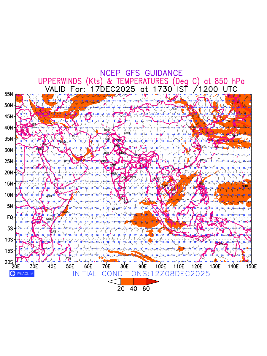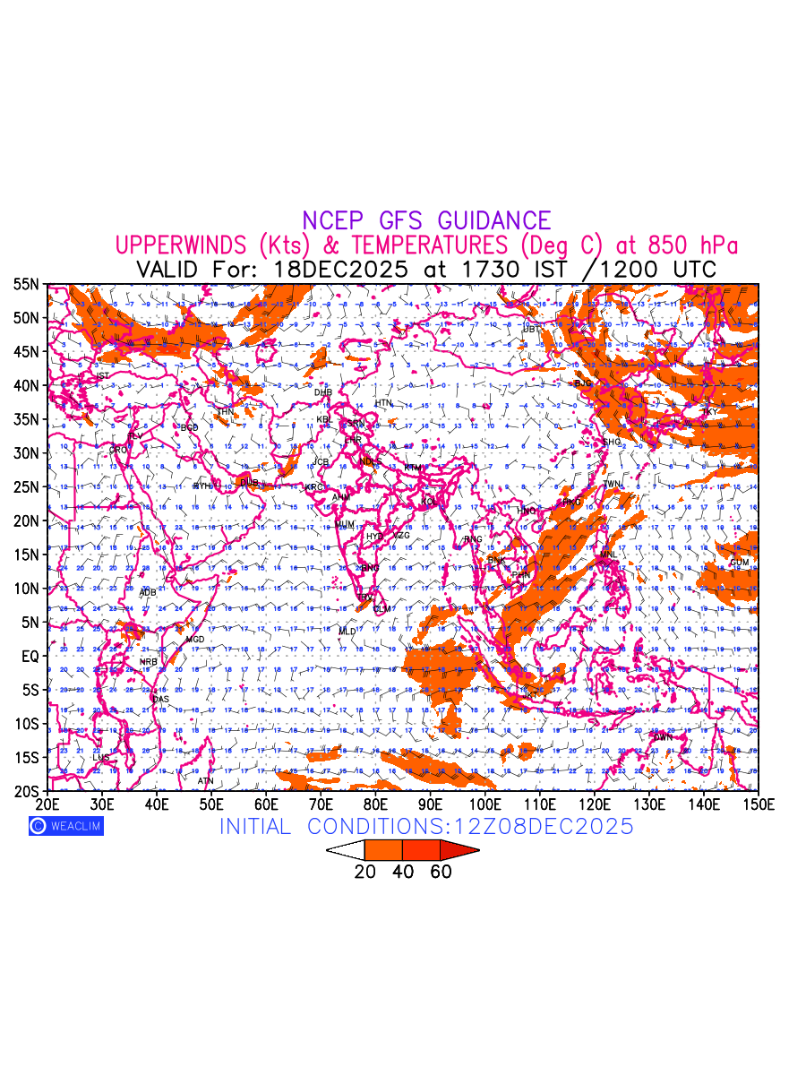 Winds at 850 hPa at the 24th hour for Eurasia refers to the predicted wind direction and speed at a pressure level of 850 hPa, which is located in the lower troposphere (1,500 meters or 5,000 feet above the Earth’s surface). The winds are presented in knots (kt), and the direction is given in degrees from true north. Winds with magnitude of more than 20 kt are marked in shades of red. Being close to the Earth’s surface it is strongly influenced by surface features such as mountains, valleys, and bodies of water. It gives insight into the strength and direction of wind flow in the lower troposphere, affecting the movement of weather systems and the transport of heat, moisture, and pollutants in the atmosphere. Depiction also shows the temperature along with the wind barb on the grid points at 850 hPa. Along with the wind speed (kt) and direction, upper air temperatures (Deg C) are also shown at the grid points over the Eurasian Region at 850 hPa level for the next ten days.