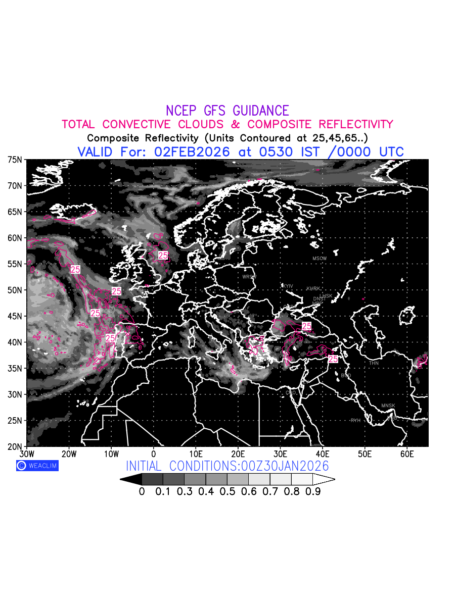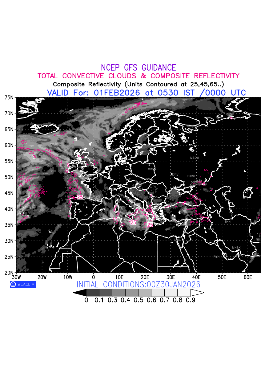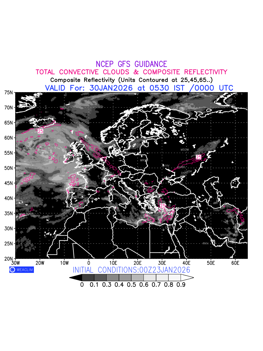 Convective clouds are formed by the vertical movement of air in the atmosphere and are associated with thunderstorms and other types of severe weather like intense rainfall, strong gusty winds etc. Shades from black to white on scale of 0 to 1 with whiter shade depicting more intensity of convection has been used in the depiction. Also shown is the Composite Reflectivity that takes the maximum reflectivity from each elevation angle of the Doppler Weather Radar and meshes it into one image. Advantage of this type of image is the ability to quickly assess the intensity of storms. Predicted pattern of Total Convective Clouds and percentage of the sky covered by them is shown here along with Composite Reflectivity over the European Region for the next ten days.