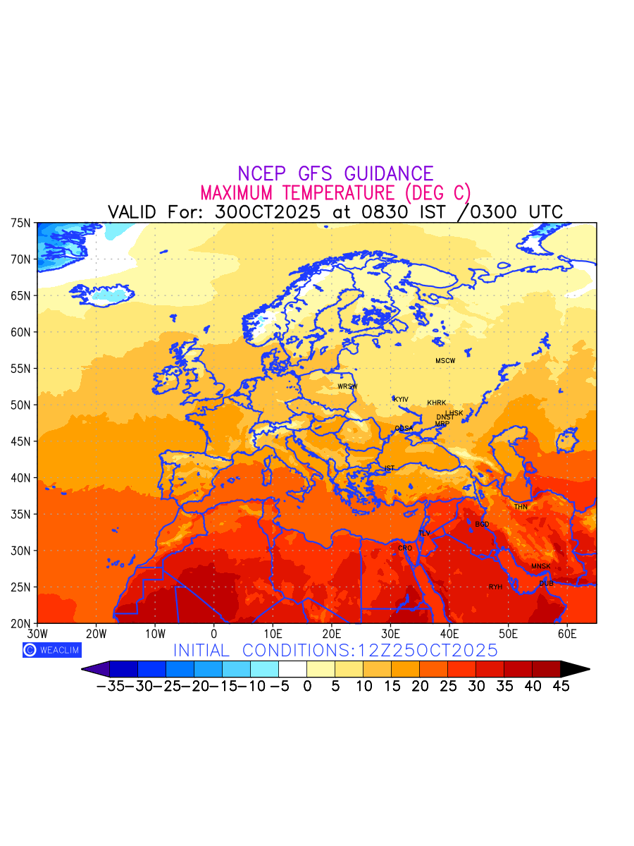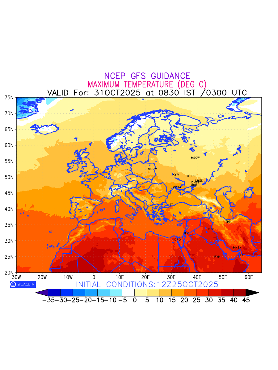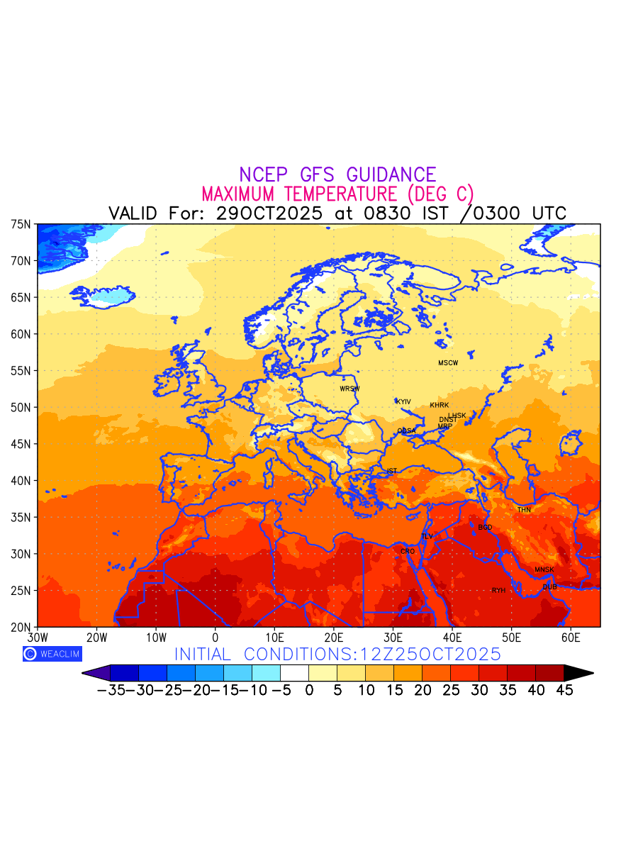 Maximum Temperature for Europe countries depicts the highest temperatures at 2m above the ground surface between 0300 UTC of the previous date to 0300 UTC of the required date. This is an important variable for weather forecasting, as it determines the conditions at the Earth’s surface during the warmest part of the date,affecting human activities, agriculture, and the environment. 2m Temperature data can be used for a variety of applications, such as predicting the onset of heatwaves or cold spells, forecasting temperature trends, and studying the impact of weather on various systems and processes.