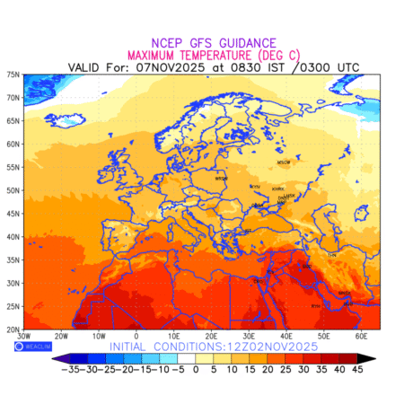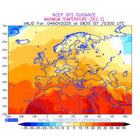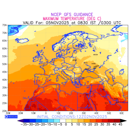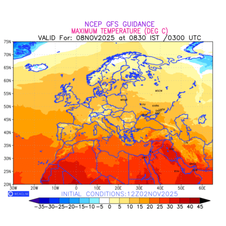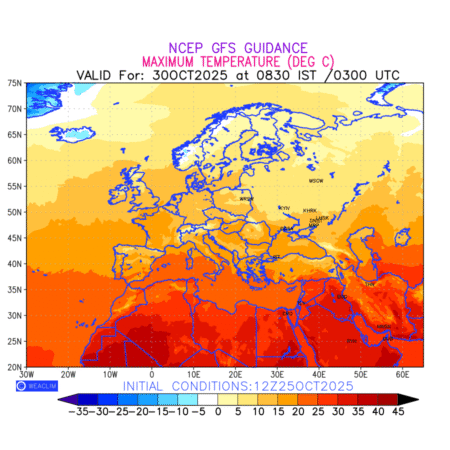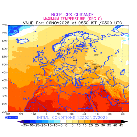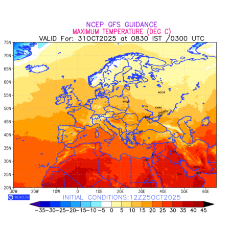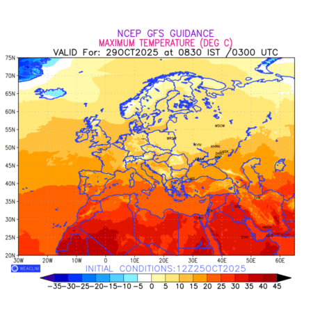Maximum Temperature for Europe countries depicts the highest temperatures at 2m above the ground surface between 0300 UTC of the previous date to 0300 UTC of the required date. This is an important variable for weather forecasting, as it determines the conditions at the Earth’s surface during the warmest part of the date,affecting human activities, agriculture, and the environment. 2m Temperature data can be used for a variety of applications, such as predicting the onset of heatwaves or cold spells, forecasting temperature trends, and studying the impact of weather on various systems and processes.
