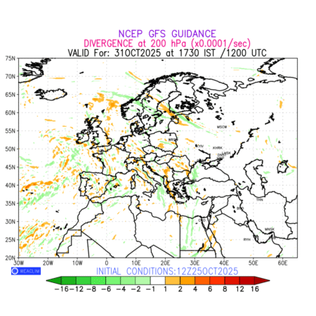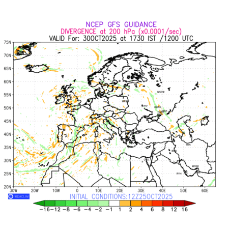 Upper Level Divergence at the 24th hour for Europe is the graphical representation that depict the magnitude and pattern of horizontal rotation (or the vorticity) of atmosphere around a vertical axis or the vorticity at 200 hPa (12.0km). In northern hemisphere, it is displayed in warm colors such as red and yellow indicating positive vorticity (cyclonic rotation), and cool colors such as blue and green indicating negative vorticity (anticyclonic rotation). It can be associated with weather systems such as troughs, ridges, and jet streams.