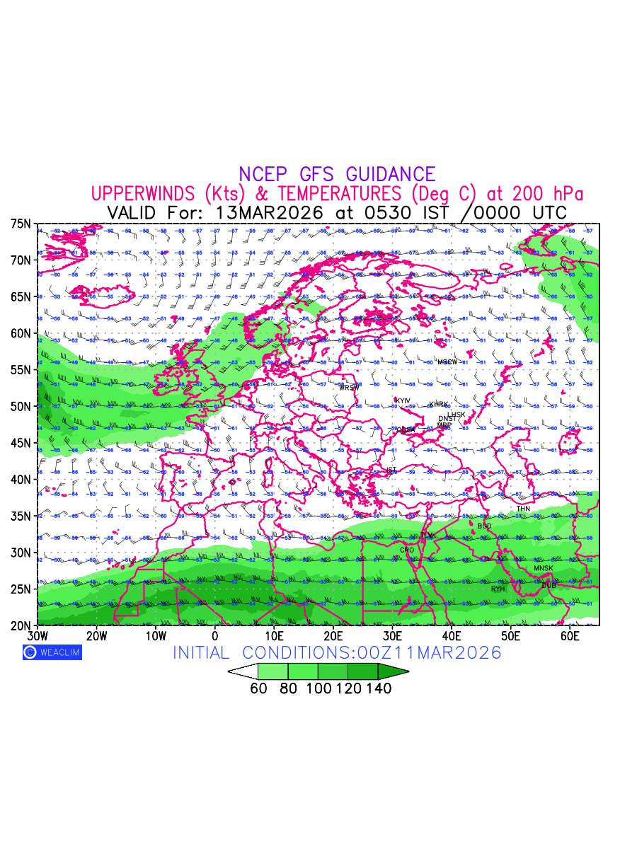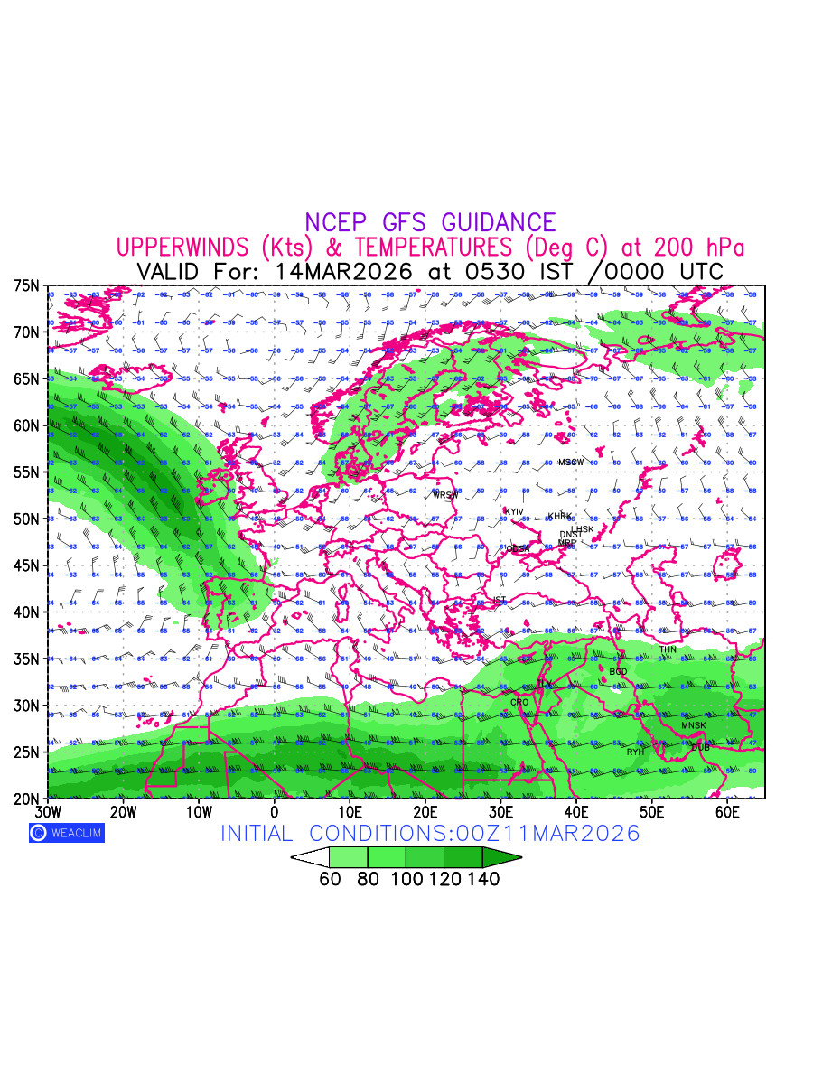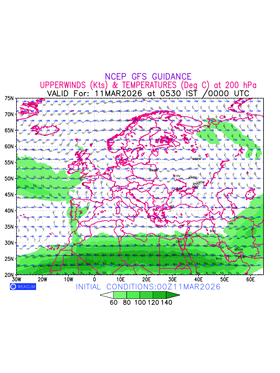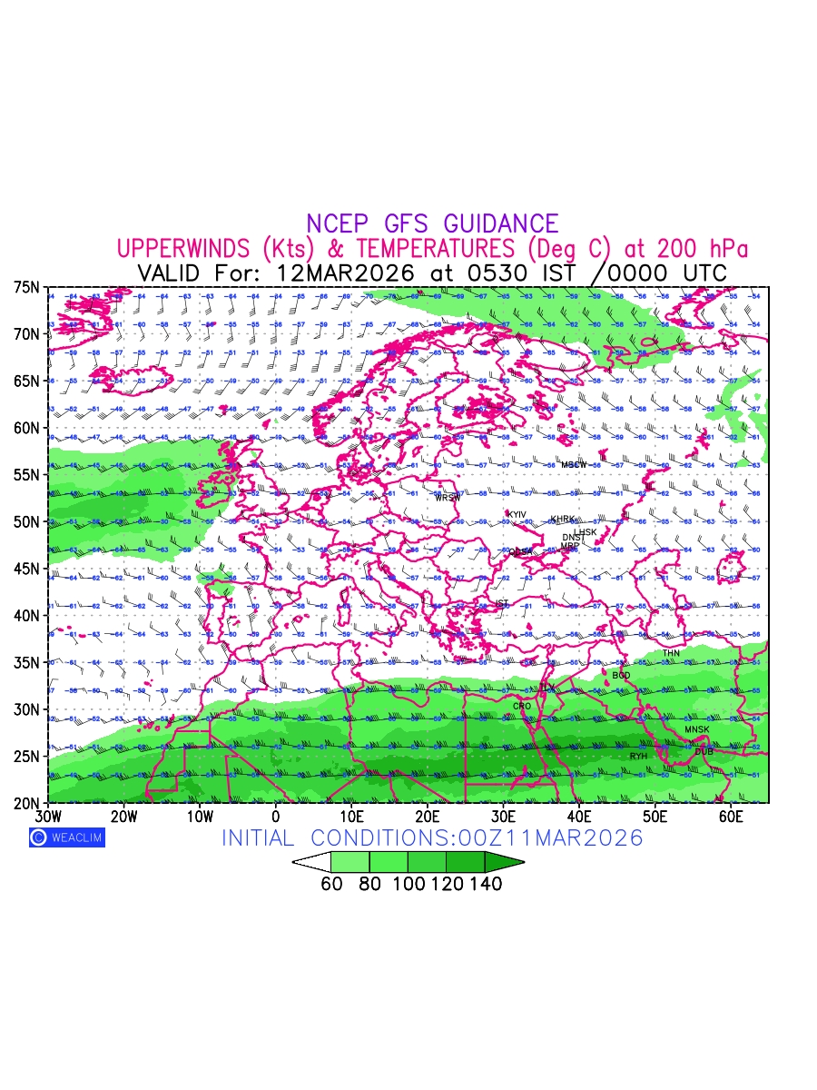 Winds at 200 hPa at the 24th hour for Europe refers to the predicted wind direction and speed at a pressure level of 200 hPa, which is located in the upper troposphere (approximately 12 Km or 7.5 Miles above the Earths surface). The winds are presented knots (kt), and the direction is given in degrees from true north. ‘JetStreams’ are marked in shades of green for winds with magnitude of more than 60 kt is a narrow band of high-speed winds that can influence weather patterns over large areas. Along with the wind speed (kt) and direction , upper air temperatures (Deg C) are also shown at the grid points over the European Region at 200 hPa level for the next ten days.