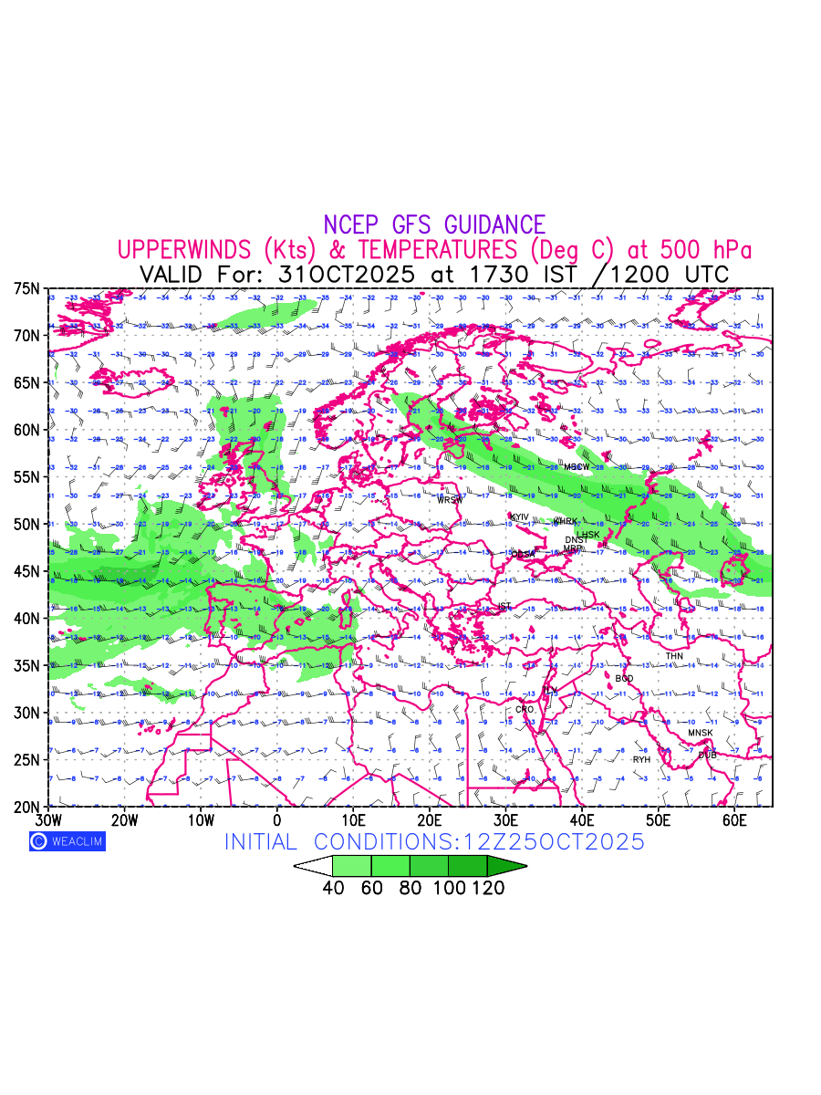 Winds at 500 hPa at the 24th hour for Europe refers to the predicted wind direction and speed at a pressure level of 500 hPa, which is located in the upper troposphere about 5.5 km (18,000 ft) above the Earth’s surface.The winds are presented in knots (kt), and the direction is given in degrees from true north. Winds with magnitude of more than 40 kt are marked in shades of green. It provides important information on forecasting weather patterns, including the movement and intensification of storms, the development of weather fronts, and the location and strength of high and low pressure systems. Along with the wind speed (kt) and direction, upper air temperatures (Deg C) are also shown at the grid points over the European Region at 500 hPa level for the next ten days.