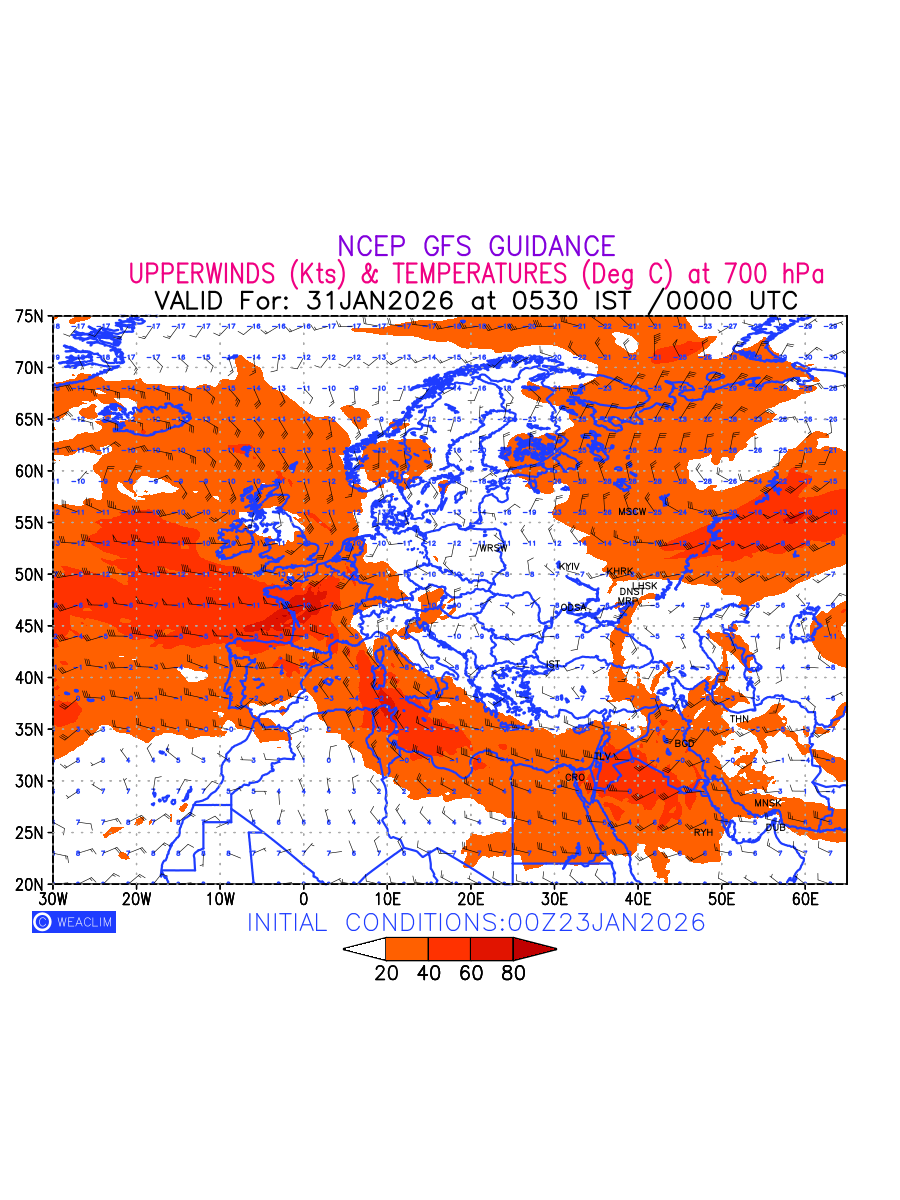 Winds at 700 hPa at the 24th hour for Europe refers to the predicted wind direction and speed at a pressure level of 700 hPa, which is located in the middle troposphere (approximately 3,000 meters or 10,000 feet above the Earths surface). The winds are presented in knots (kt), and the direction is given in degrees from true north. Winds with magnitude of more than 20 kt are marked in shades of red. At this level, the wind speed and direction can influence the movement and development of weather systems such as storms, fronts, and high-pressure systems.The depiction also shows the temperature along with the wind barb on the grid points at 700 hPa. Along with the wind speed (kt) and direction, upper air temperatures (Deg C) are also shown at the grid points over the European Region at 700 hPa level for the next ten days.