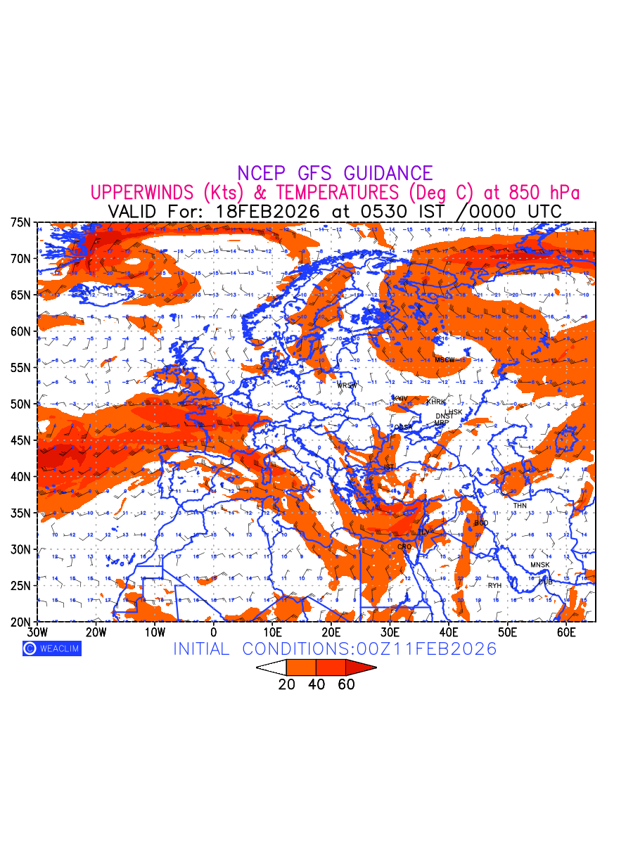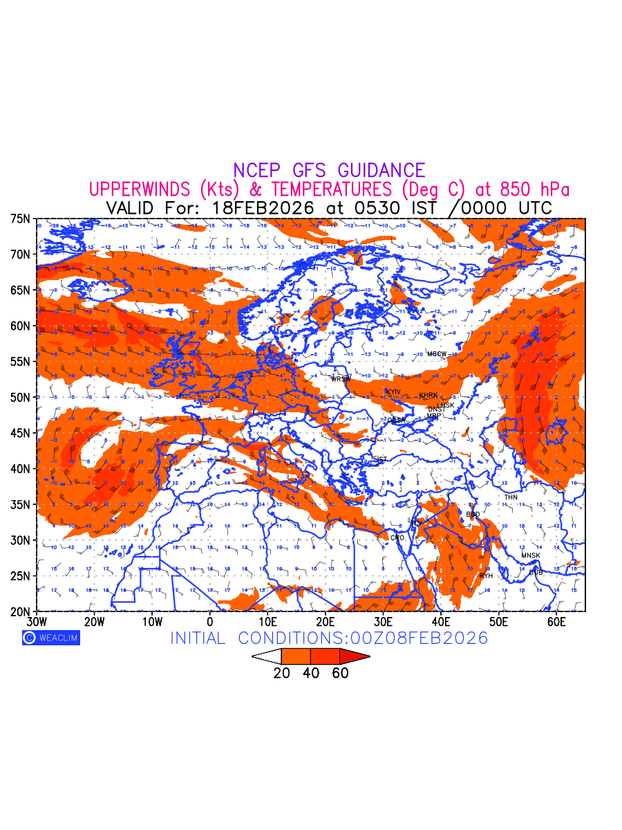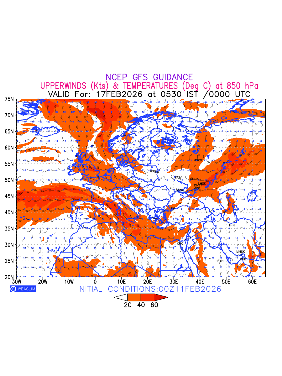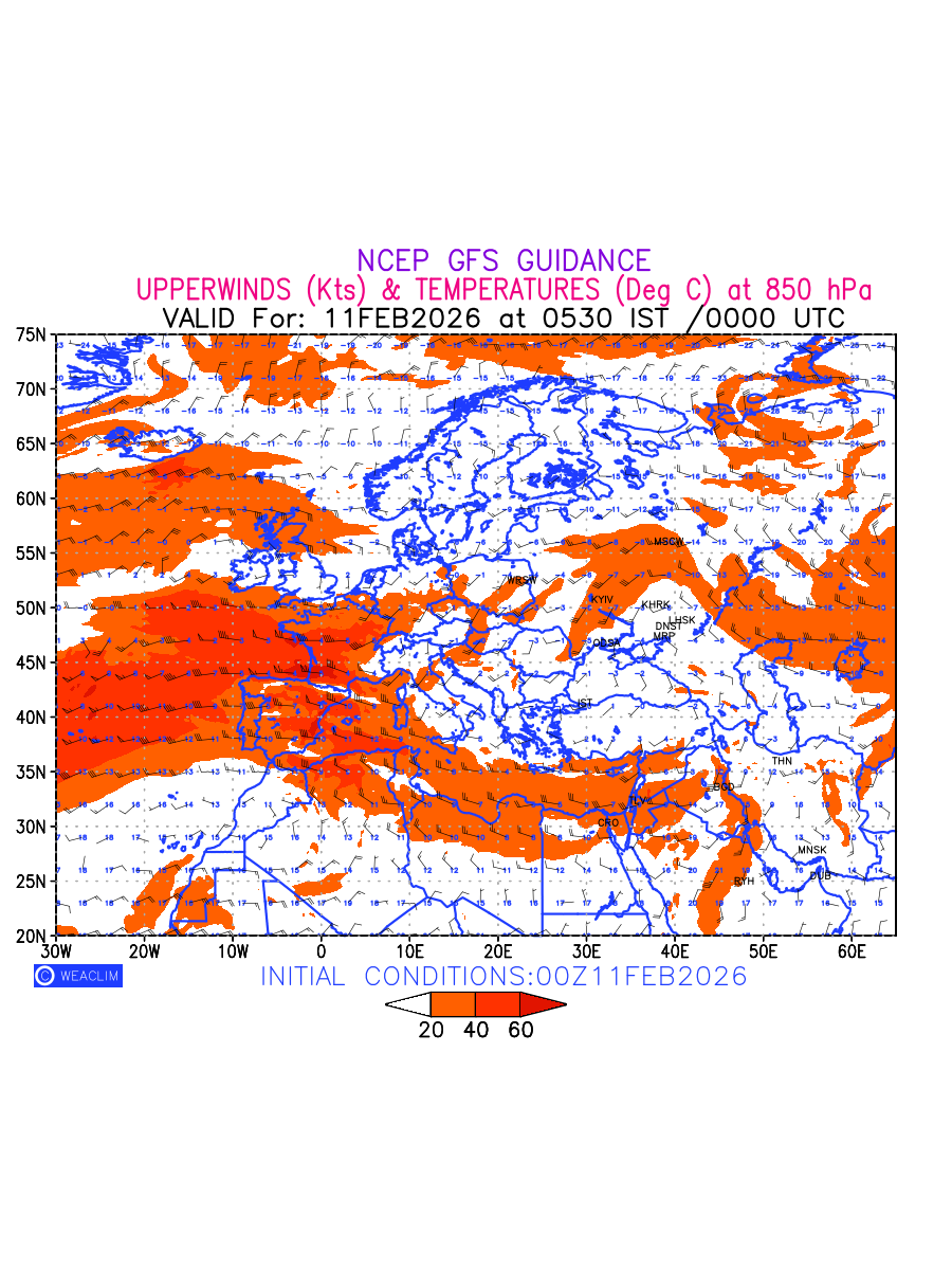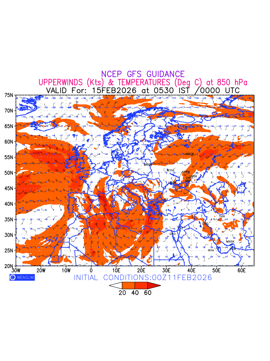 Winds at 850 hPa at the 24 th hour for Europe refers to the predicted wind direction and speed at a pressure level of 850 hPa, which is located in the lower troposphere (1,500 meters or 5,000 feet above the Earth’s surface).The winds are presented in knots (kt), and the direction is given in degrees from true north. Winds with magnitude of more than 20 kt are marked in shades of red. Being close to the Earth’s surface it is strongly influenced by surface features such as mountains, valleys, and bodies of water. It gives insight into the strength and direction of wind flow in the lower troposphere, affecting the movement of weather systems and the transport of heat, moisture, and pollutants in the atmosphere. Depiction also shows the temperature along with the wind barb on the grid points at 850 hPa. Along with the wind speed (kt) and direction, upper air temperatures (Deg C) are also shown at the grid points over the Eurpean Region at 850 hPa level for the next ten days.