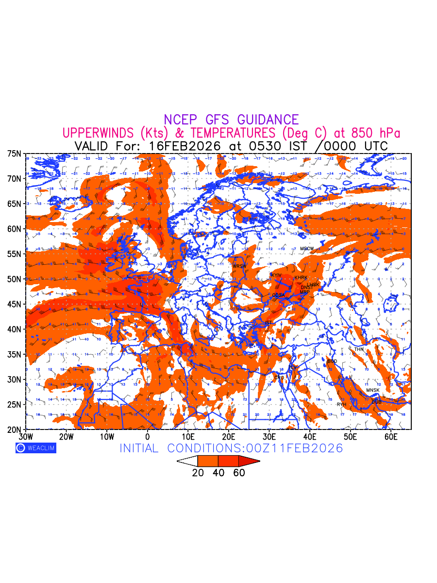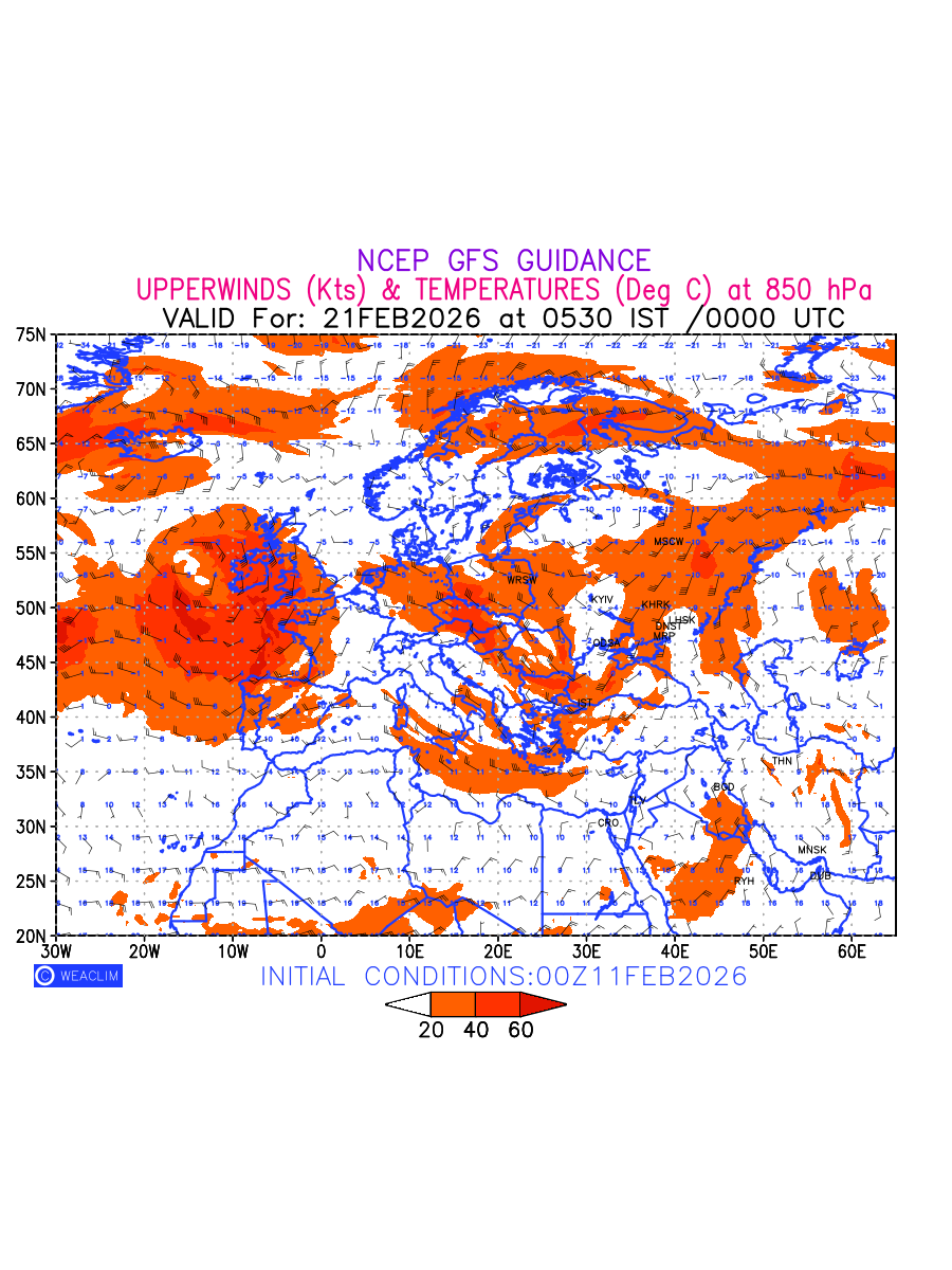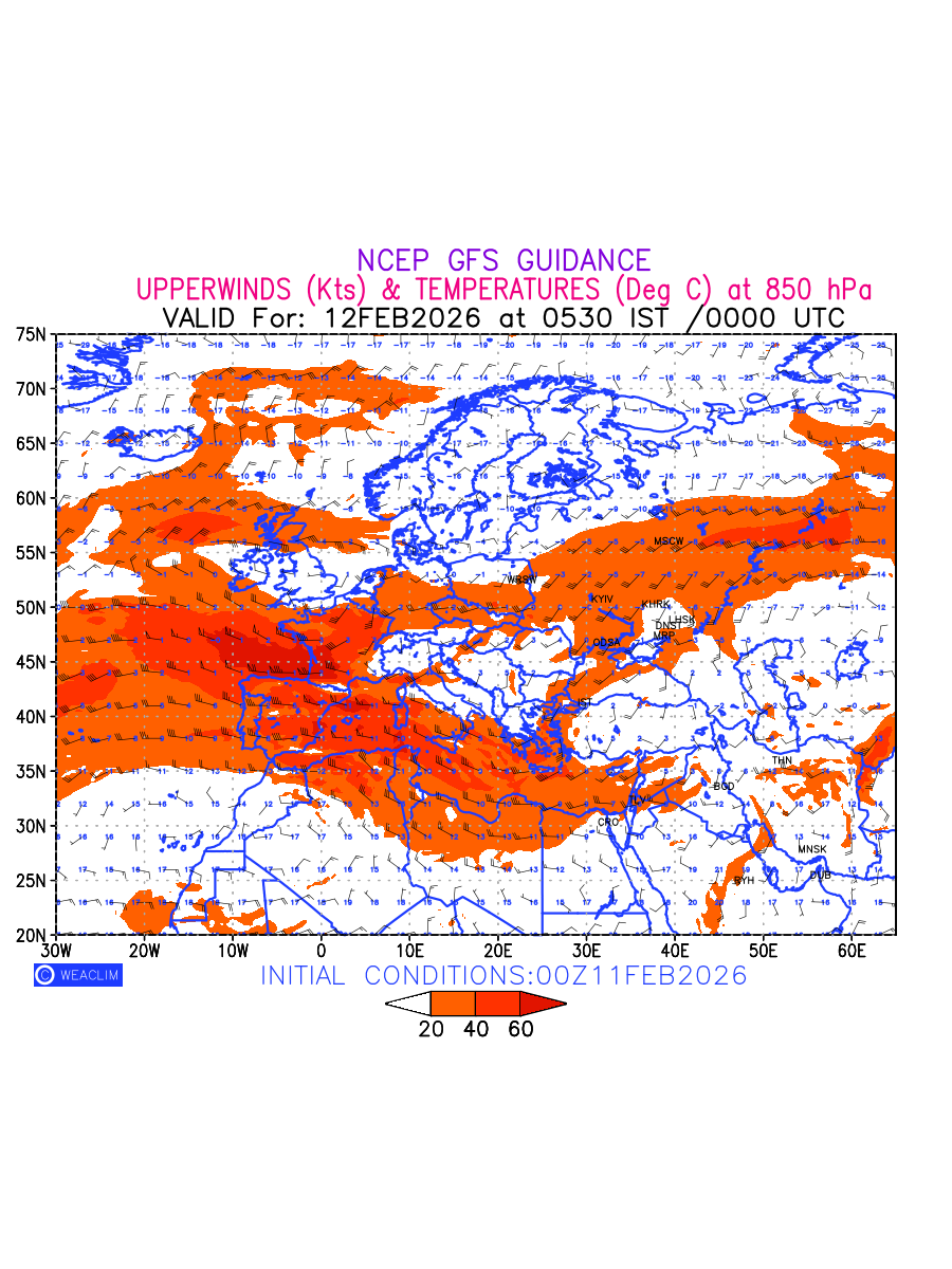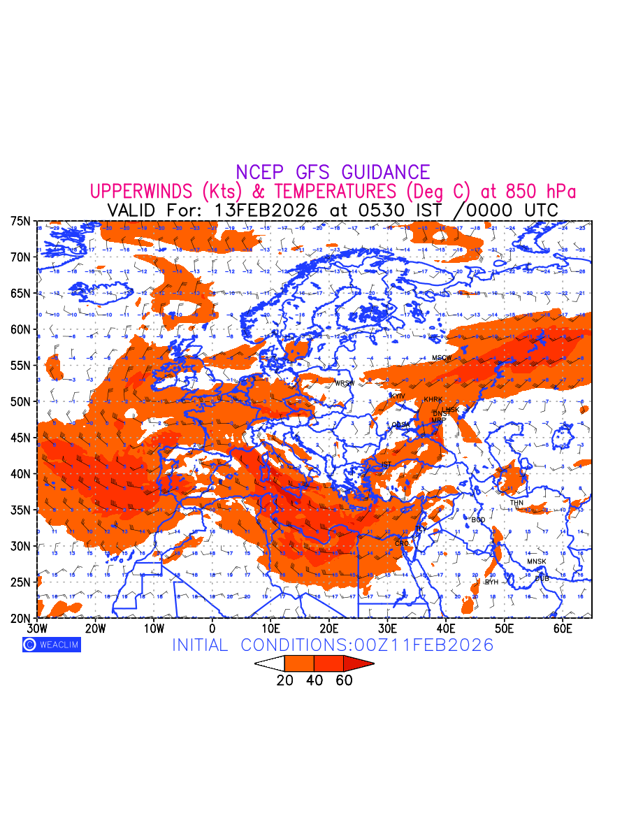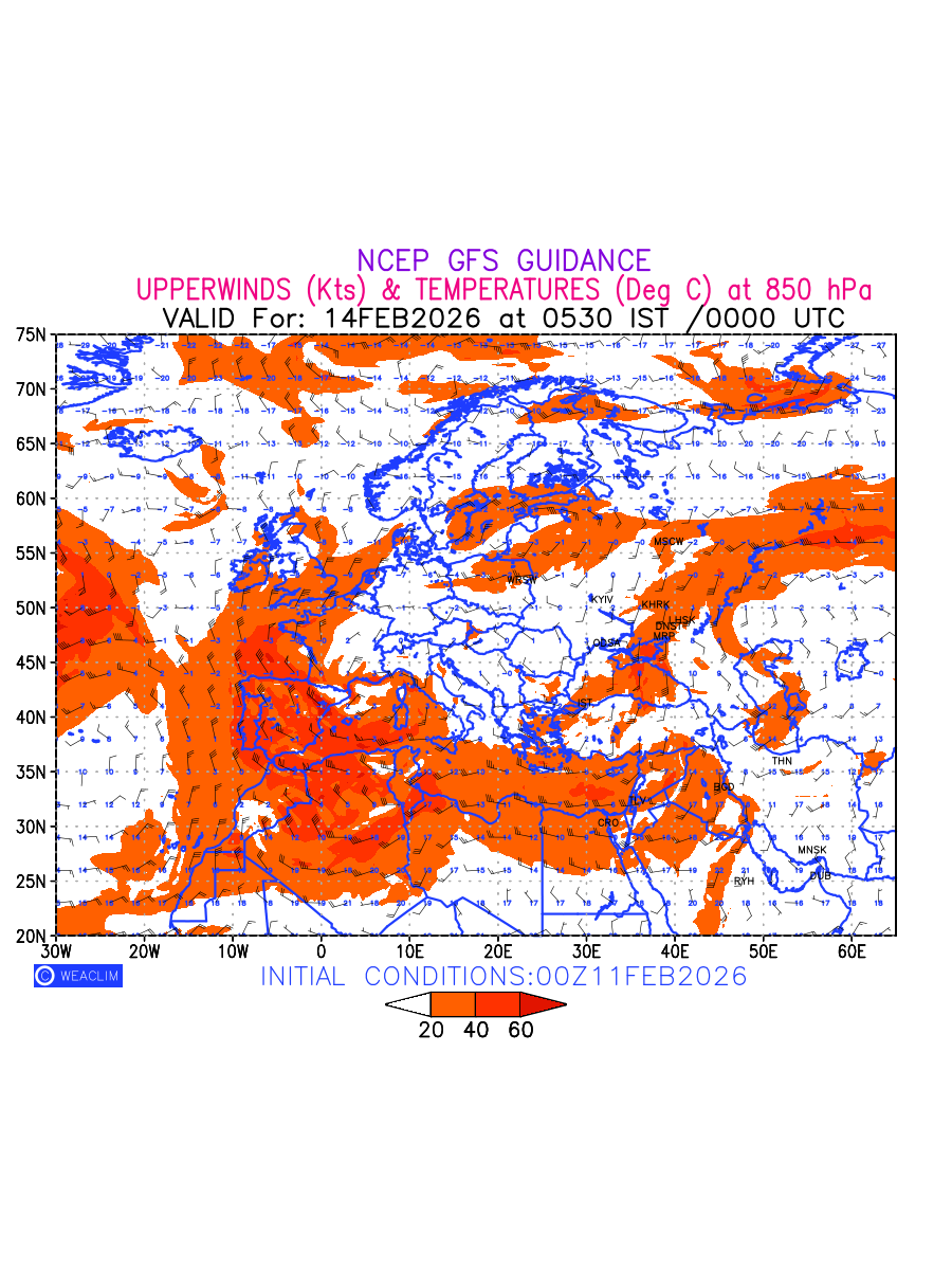 Winds at 850 hPa at the 24 th hour for Europe refers to the predicted wind direction and speed at a pressure level of 850 hPa, which is located in the lower troposphere (1,500 meters or 5,000 feet above the Earth’s surface).The winds are presented in knots (kt), and the direction is given in degrees from true north. Winds with magnitude of more than 20 kt are marked in shades of red. Being close to the Earth’s surface it is strongly influenced by surface features such as mountains, valleys, and bodies of water. It gives insight into the strength and direction of wind flow in the lower troposphere, affecting the movement of weather systems and the transport of heat, moisture, and pollutants in the atmosphere. Depiction also shows the temperature along with the wind barb on the grid points at 850 hPa. Along with the wind speed (kt) and direction, upper air temperatures (Deg C) are also shown at the grid points over the Eurpean Region at 850 hPa level for the next ten days.