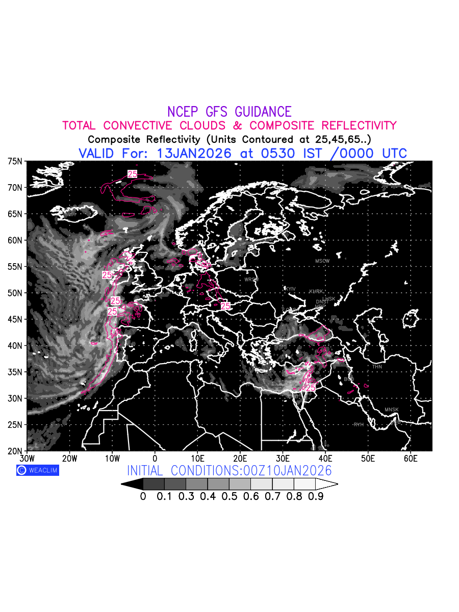 Convective clouds are formed by the vertical movement of air in the atmosphere and are associated with thunderstorms and other types of severe weather like intense rainfall, strong gusty winds etc. Shades from black to white on scale of 0 to 1 with whiter shade depicting more intensity of convection has been used in the depiction. Also shown is the Composite Reflectivity that takes the maximum reflectivity from each elevation angle of the Doppler Weather Radar and meshes it into one image.  Advantage of this type of image is the ability to quickly assess the intensity of storms. Predicted pattern of Total Convective Clouds and percentage of the sky covered by them is shown here along with Composite Reflectivity over the European Region for the next ten days.