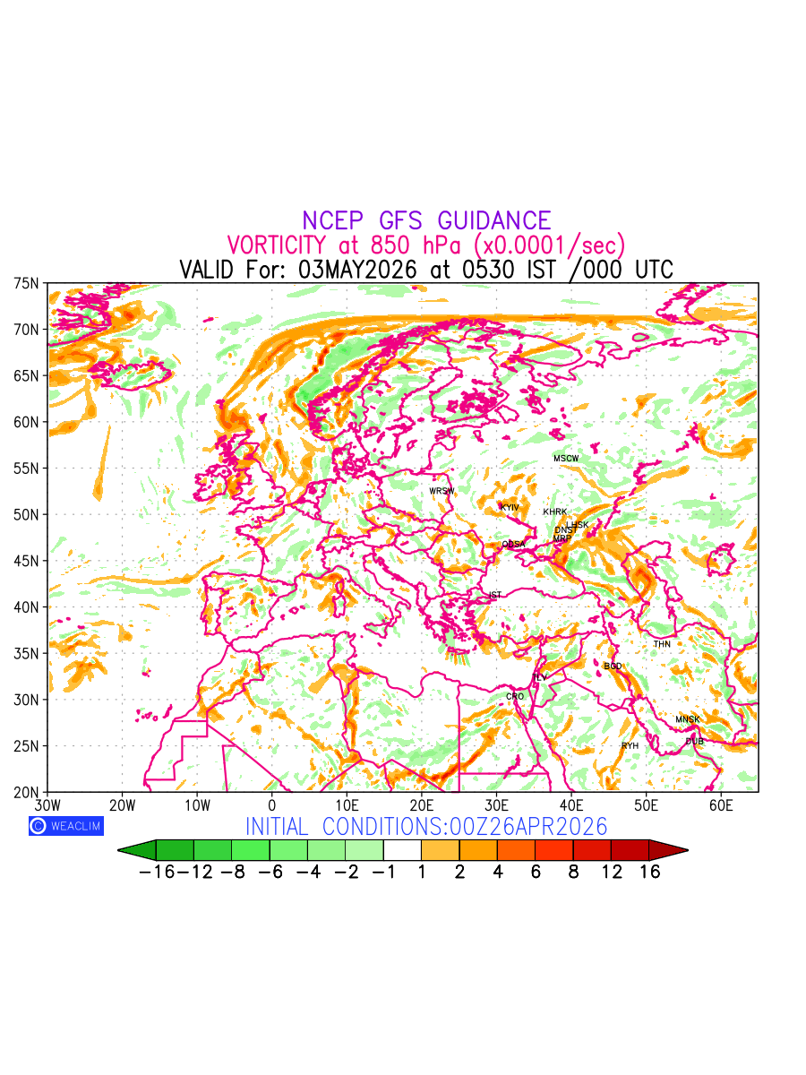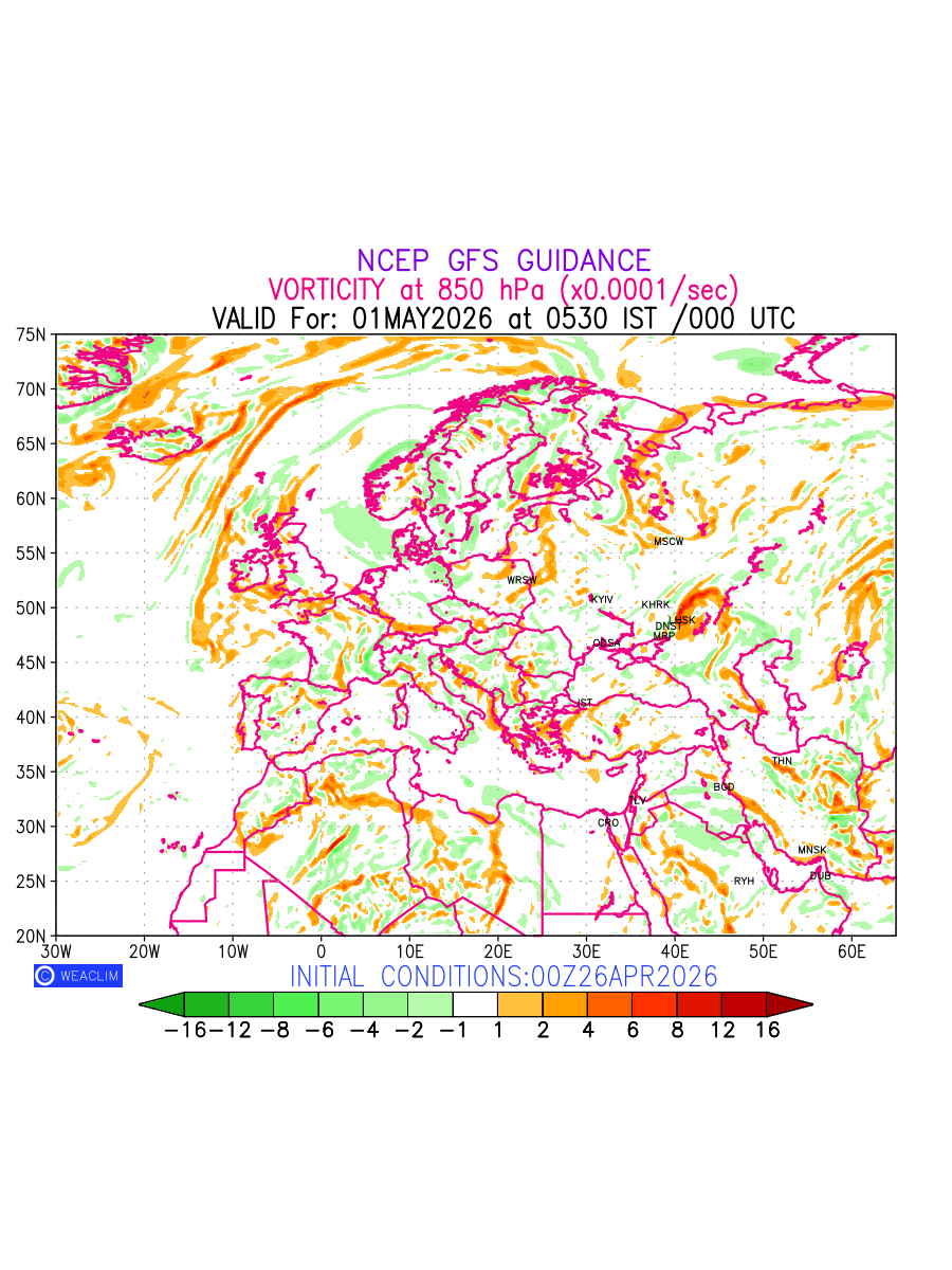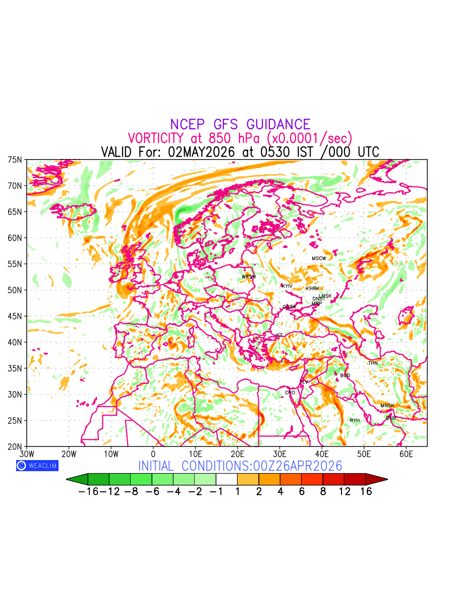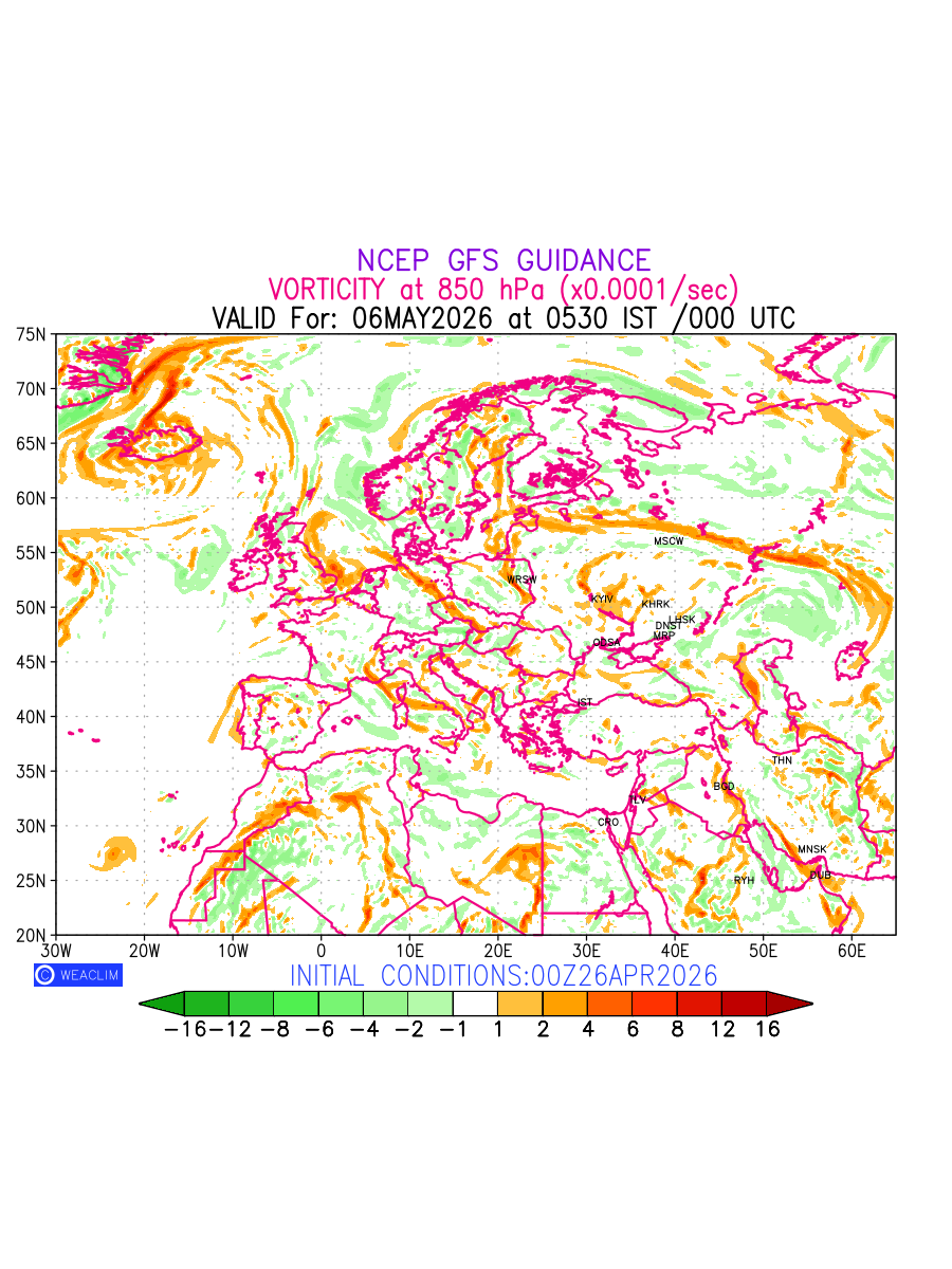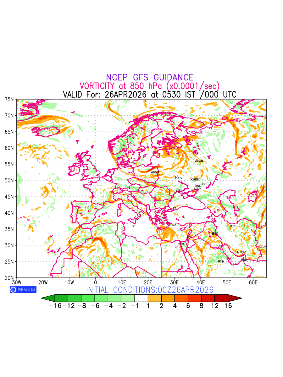 Low Level Convergence at the 24th hour for Europe is the graphical representation of the expected magnitude and pattern of horizontal rotation (or the vorticity) of atmosphere around a vertical axis or the vorticity at 850hPa (1.5km). In northern hemisphere it is typically displayed with warm colors ranging from shades of red (to yellow) indicating positive vorticity (cyclonic rotation), and cool colors shades of green (to blue) indicating negative vorticity (anticyclonic rotation). They are useful in identifying areas of high and low vorticity, associated with weather systems such as fronts, lows, and highs etc.