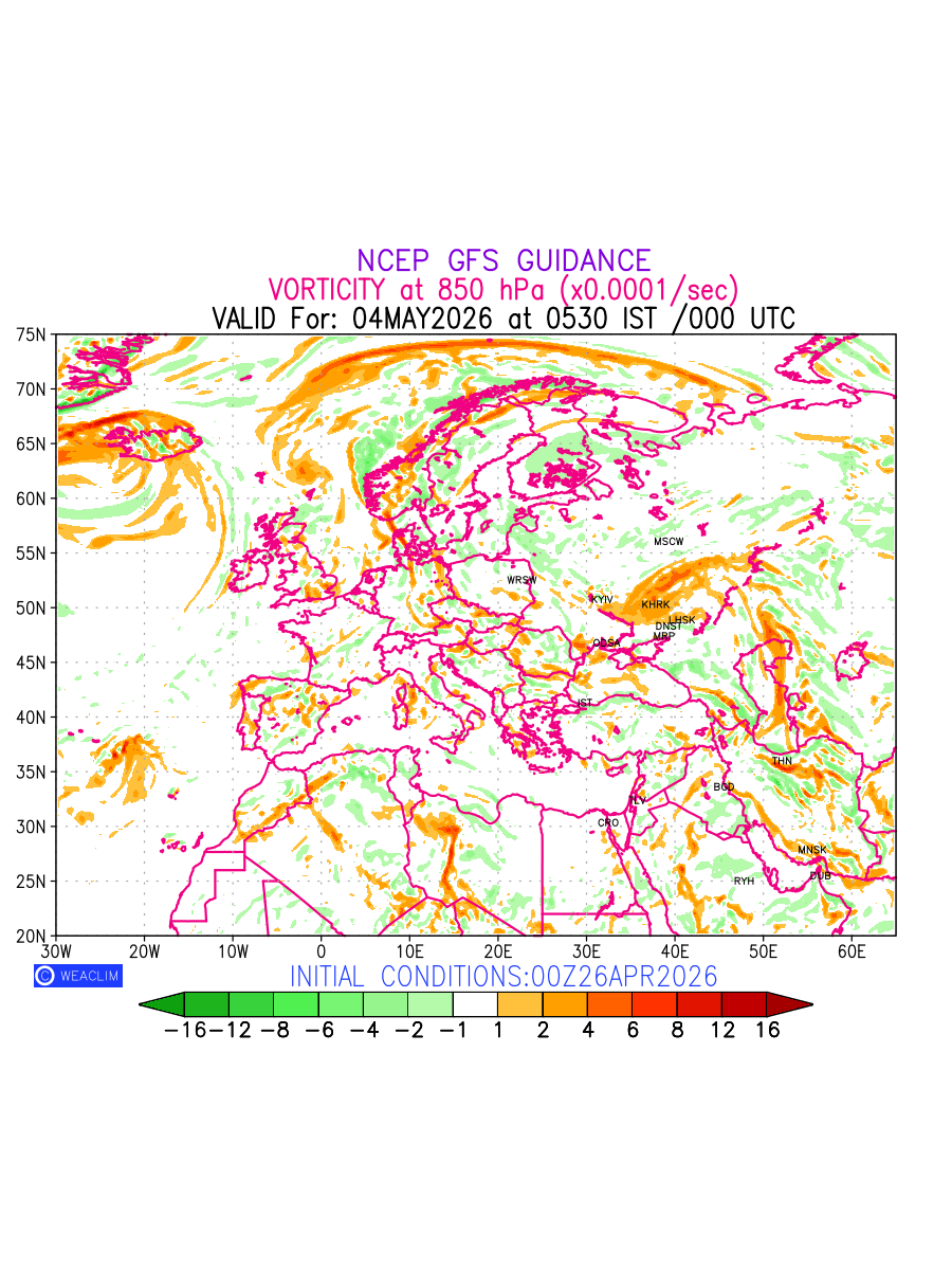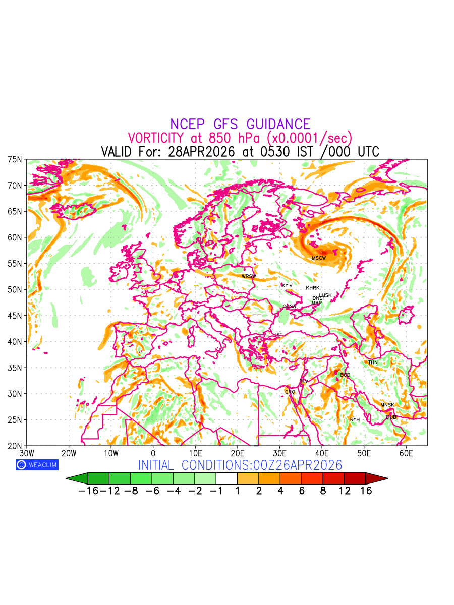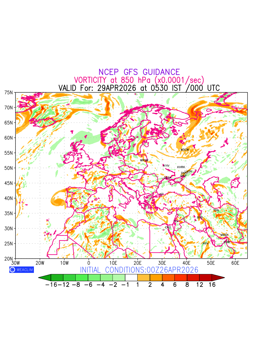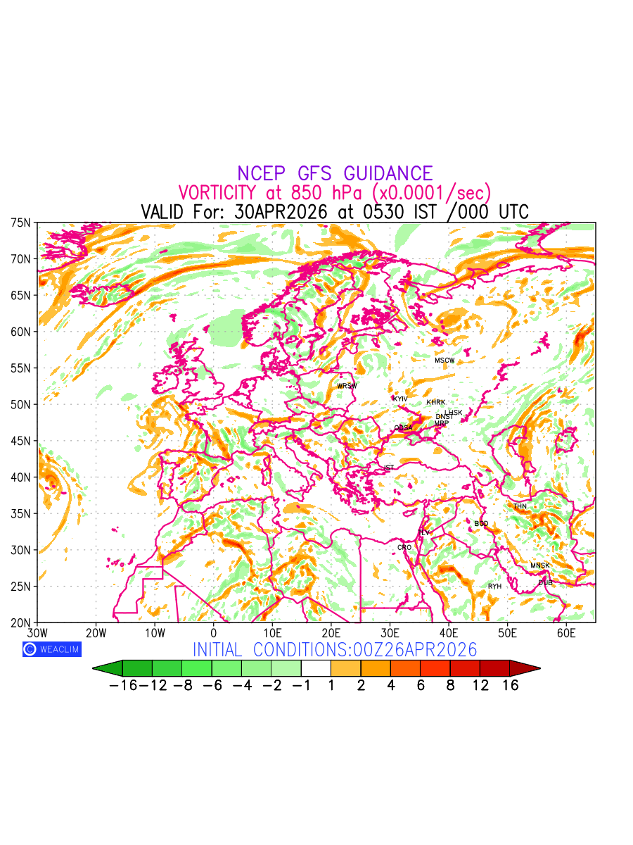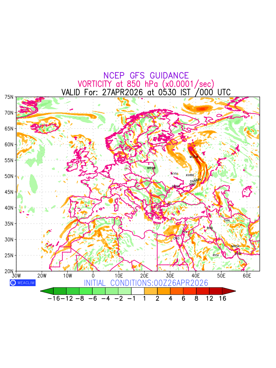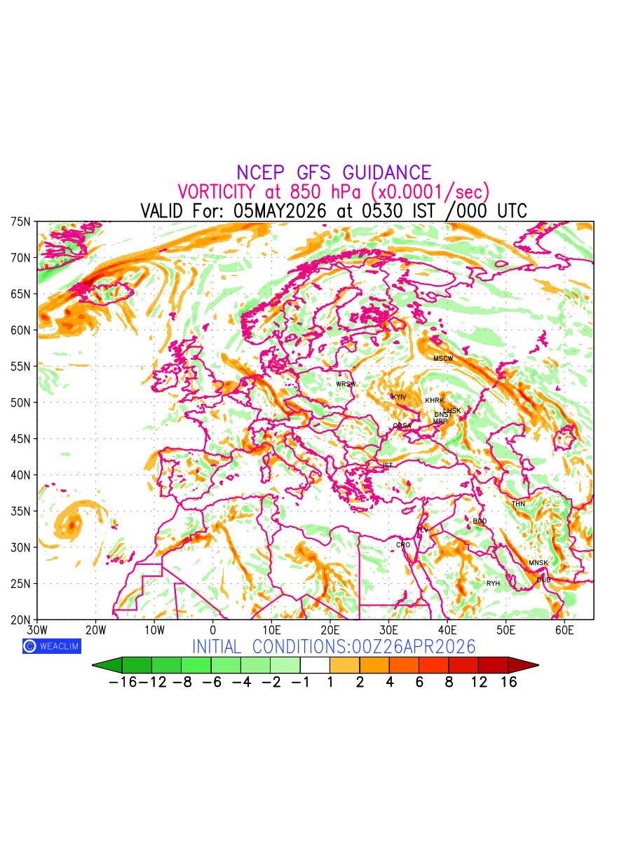 Low Level Convergence at the 24th hour for Europe is the graphical representation of the expected magnitude and pattern of horizontal rotation (or the vorticity) of atmosphere around a vertical axis or the vorticity at 850hPa (1.5km). In northern hemisphere it is typically displayed with warm colors ranging from shades of red (to yellow) indicating positive vorticity (cyclonic rotation), and cool colors shades of green (to blue) indicating negative vorticity (anticyclonic rotation). They are useful in identifying areas of high and low vorticity, associated with weather systems such as fronts, lows, and highs etc.