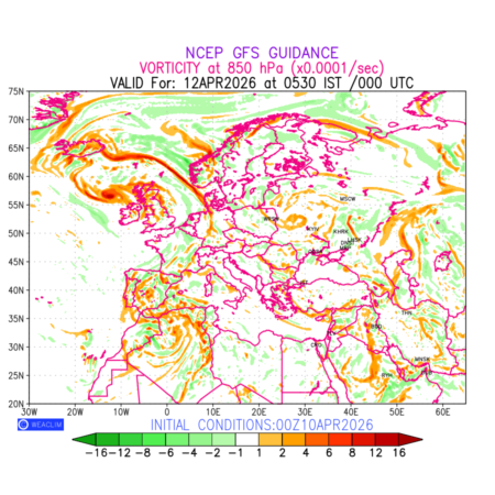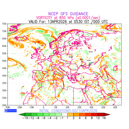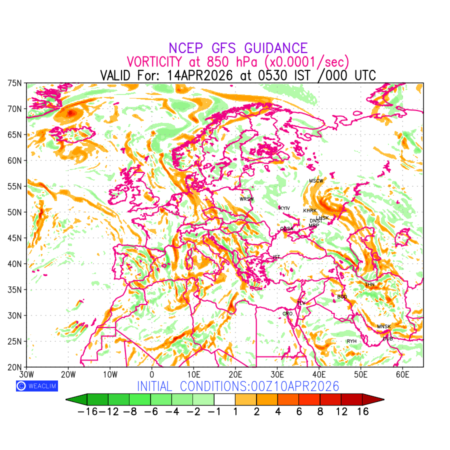 Low Level Convergence at the 24th hour for Europe is the graphical representation of the expected magnitude and pattern of horizontal rotation (or the vorticity) of atmosphere around a vertical axis or the vorticity at 850hPa (1.5km). In northern hemisphere it is typically displayed with warm colors ranging from shades of red (to yellow) indicating positive vorticity (cyclonic rotation), and cool colors shades of green (to blue) indicating negative vorticity (anticyclonic rotation). They are useful in identifying areas of high and low vorticity, associated with weather systems such as fronts, lows, and highs etc.