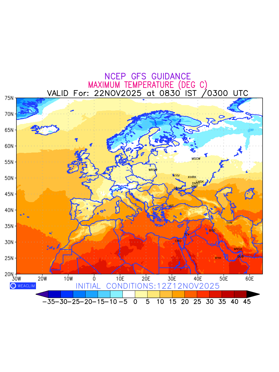 Maximum Temperature for Europe countries depicts the highest temperatures at 2m above the ground surface between 0300 UTC of the previous date to 0300 UTC of the required date. This is an important variable for weather forecasting, as it determines the conditions at the Earth’s surface during the warmest part of the date,affecting human activities, agriculture, and the environment. 2m Temperature data can be used for a variety of applications, such as predicting the onset of heatwaves or cold spells, forecasting temperature trends, and studying the impact of weather on various systems and processes.