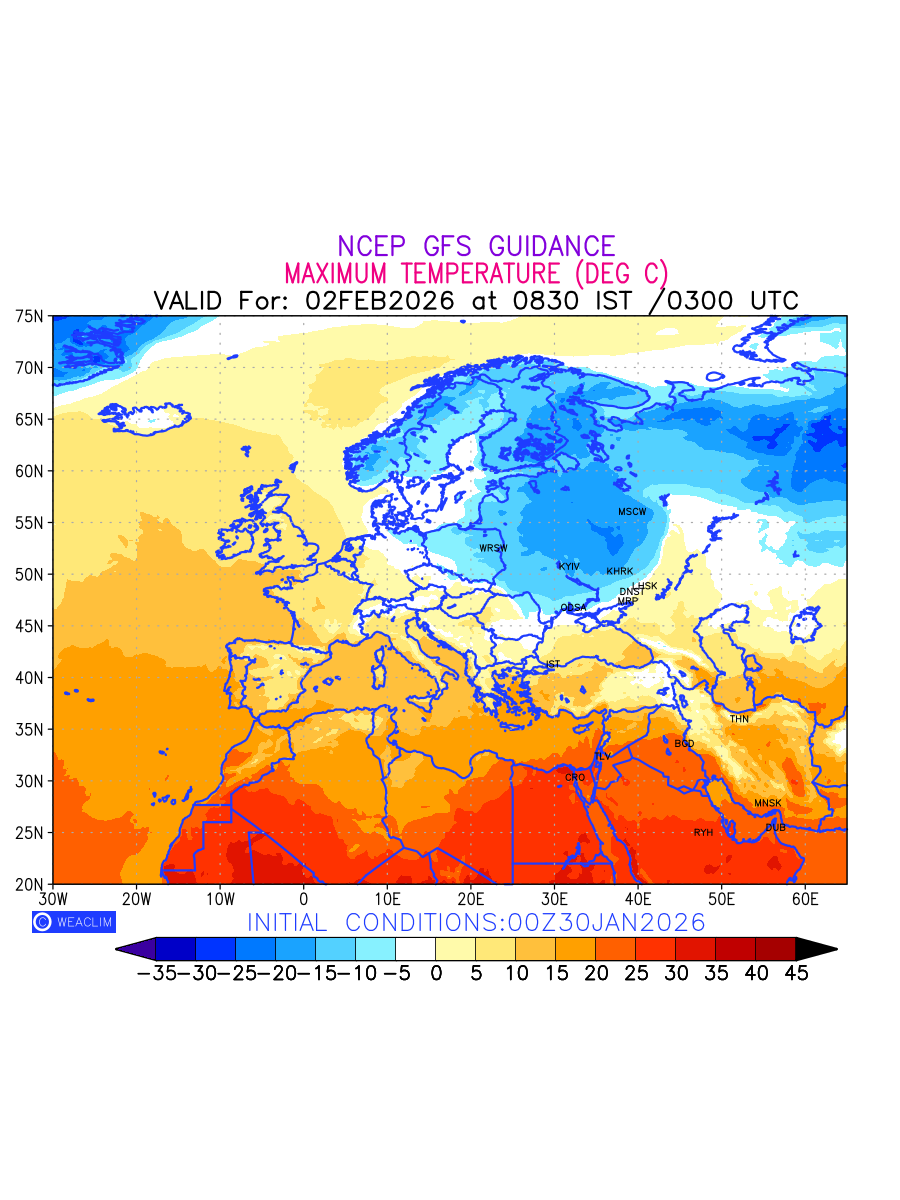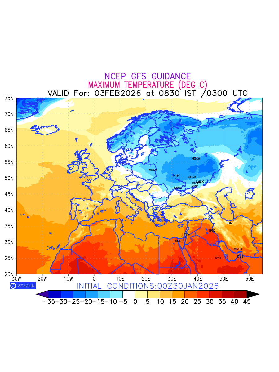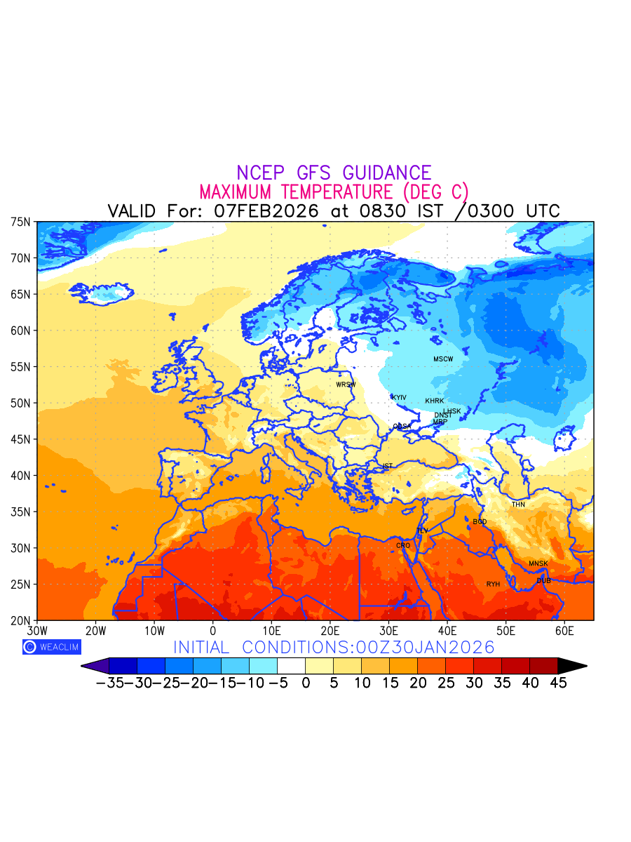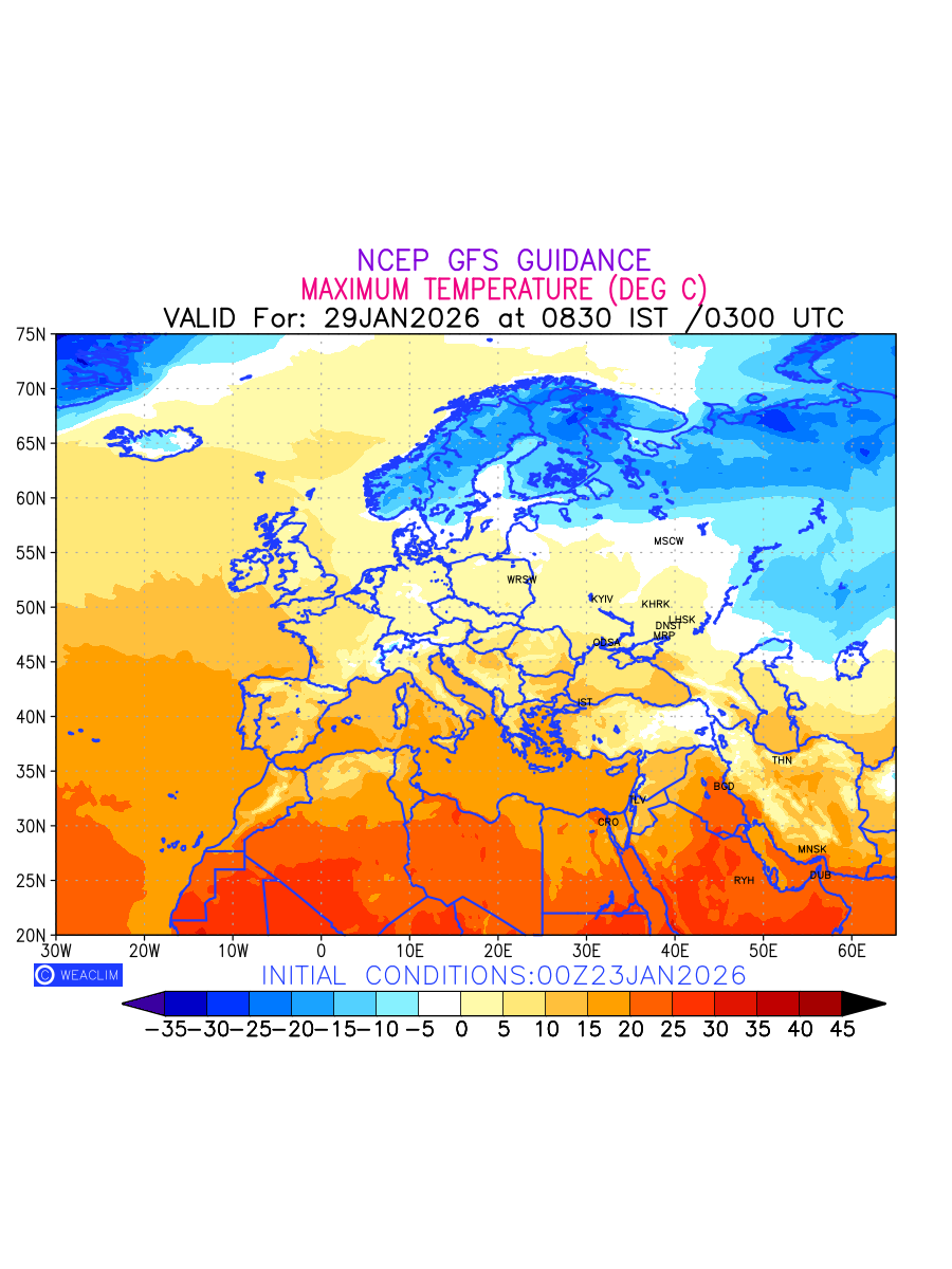 Maximum Temperature for Europe countries depicts the highest temperatures at 2m above the ground surface between 0300 UTC of the previous date to 0300 UTC of the required date. This is an important variable for weather forecasting, as it determines the conditions at the Earth’s surface during the warmest part of the date,affecting human activities, agriculture, and the environment. 2m Temperature data can be used for a variety of applications, such as predicting the onset of heatwaves or cold spells, forecasting temperature trends, and studying the impact of weather on various systems and processes.