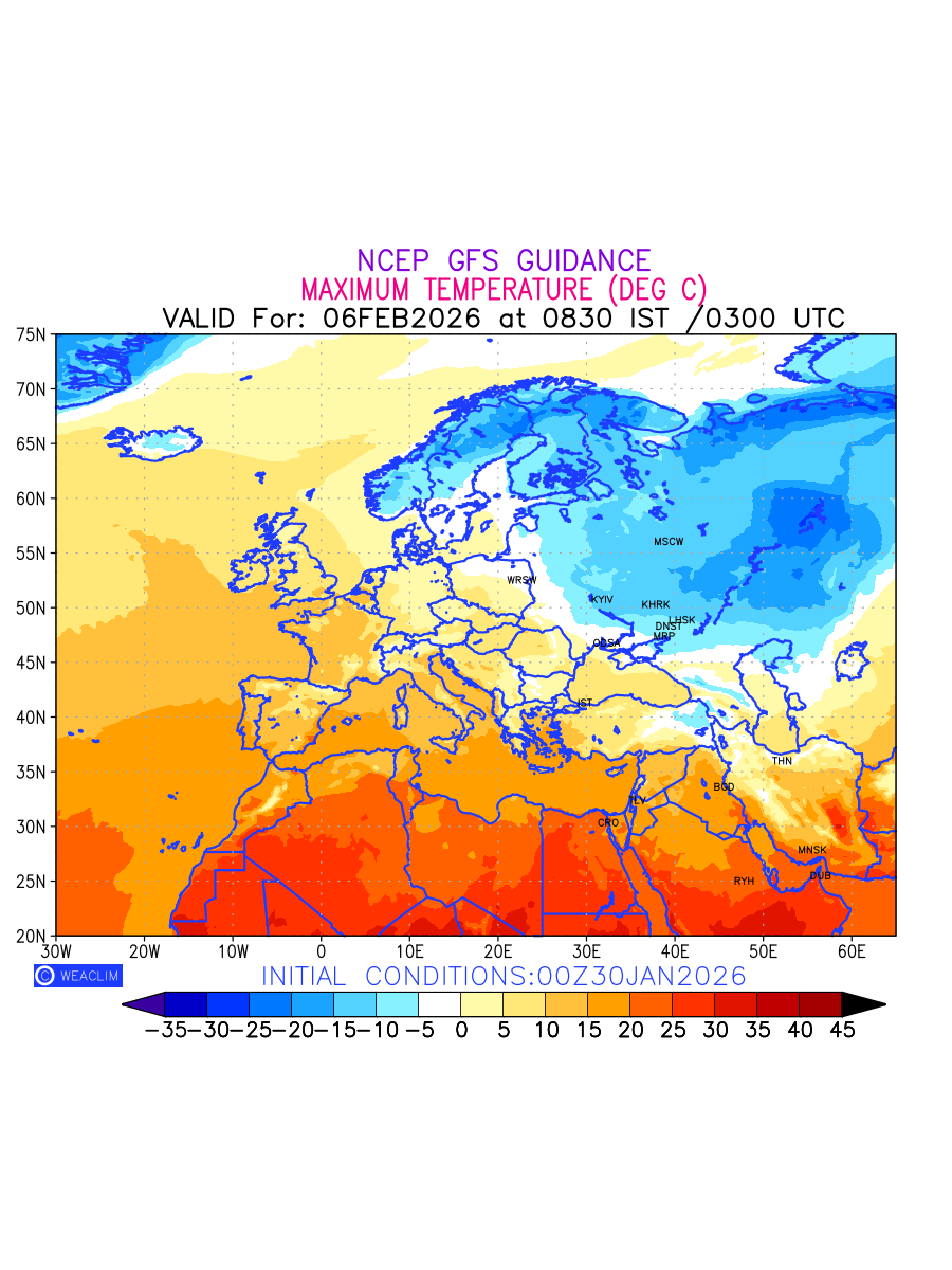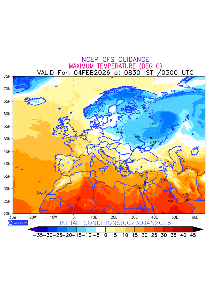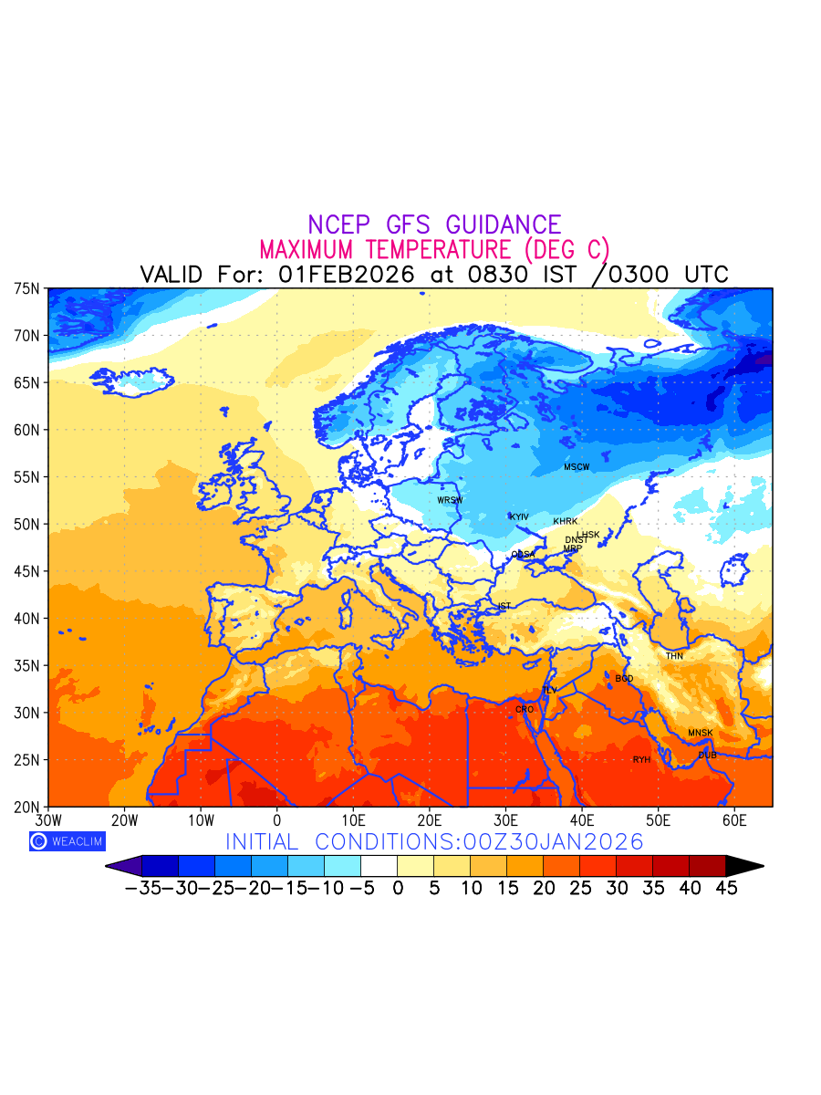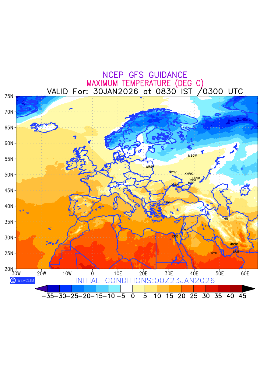 Maximum Temperature for Europe countries depicts the highest temperatures at 2m above the ground surface between 0300 UTC of the previous date to 0300 UTC of the required date. This is an important variable for weather forecasting, as it determines the conditions at the Earth’s surface during the warmest part of the date,affecting human activities, agriculture, and the environment. 2m Temperature data can be used for a variety of applications, such as predicting the onset of heatwaves or cold spells, forecasting temperature trends, and studying the impact of weather on various systems and processes.