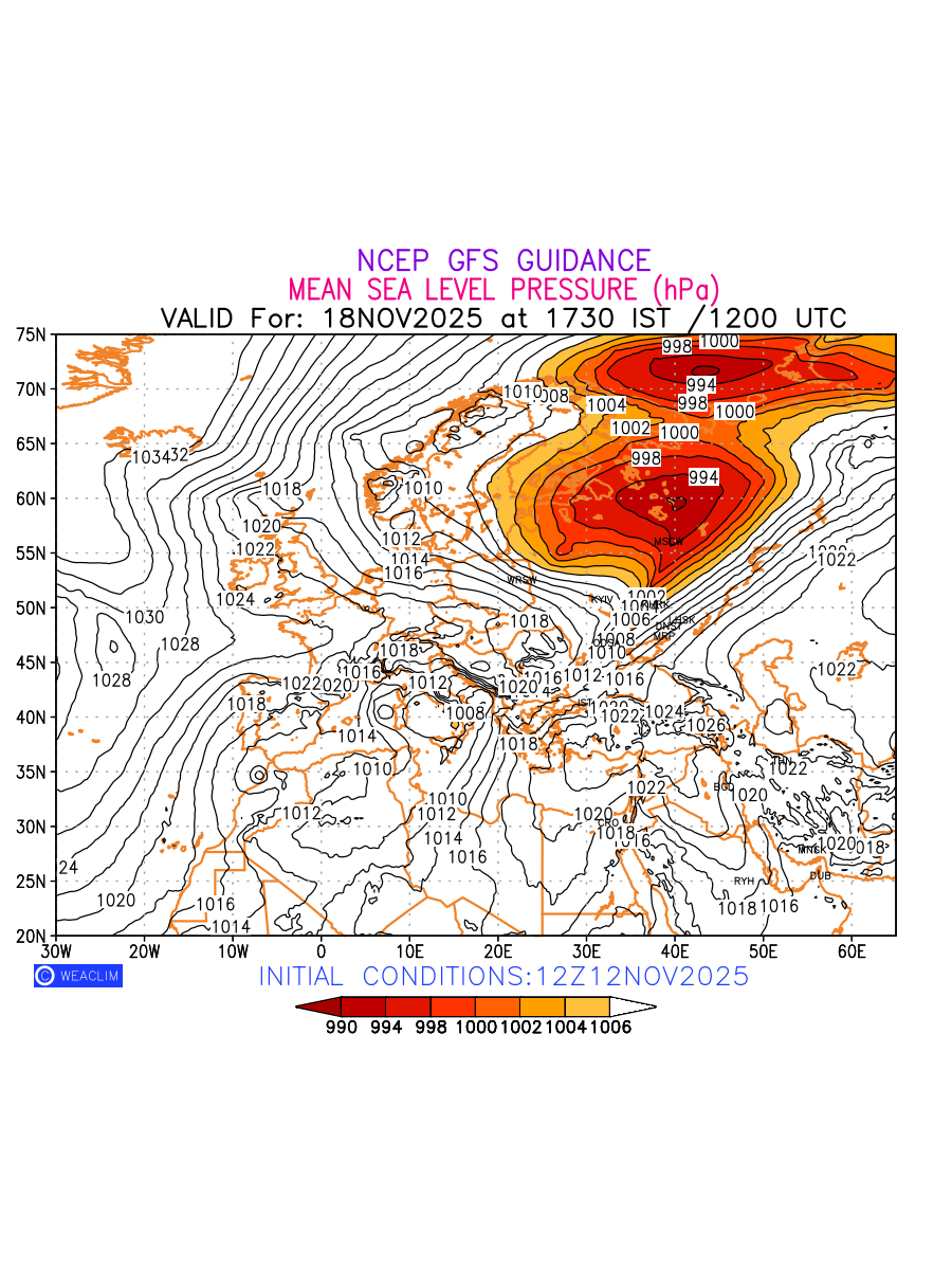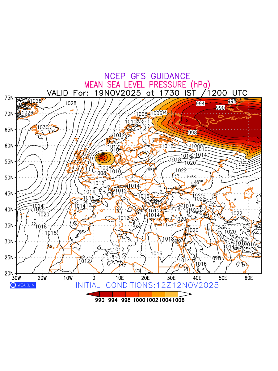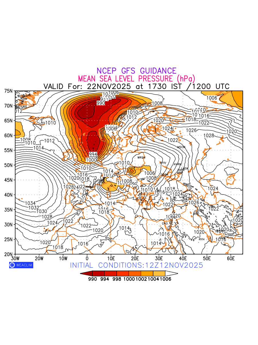 Mean Sea Level Pressure (MSLP) charts at the 24th hour for Europe typically show a color-coded contour map of atmospheric pressure at sea level, with lines of equal pressure (isobars) indicating areas of high and low pressure over a geographic area. Meteorologists use these charts to identify areas of high and low pressure, which can give indications of storms, cold fronts, or warm fronts. The MSLP charts are also useful in identifying areas of convergence and divergence in the atmosphere, which can influence the formation or decay of weather systems.