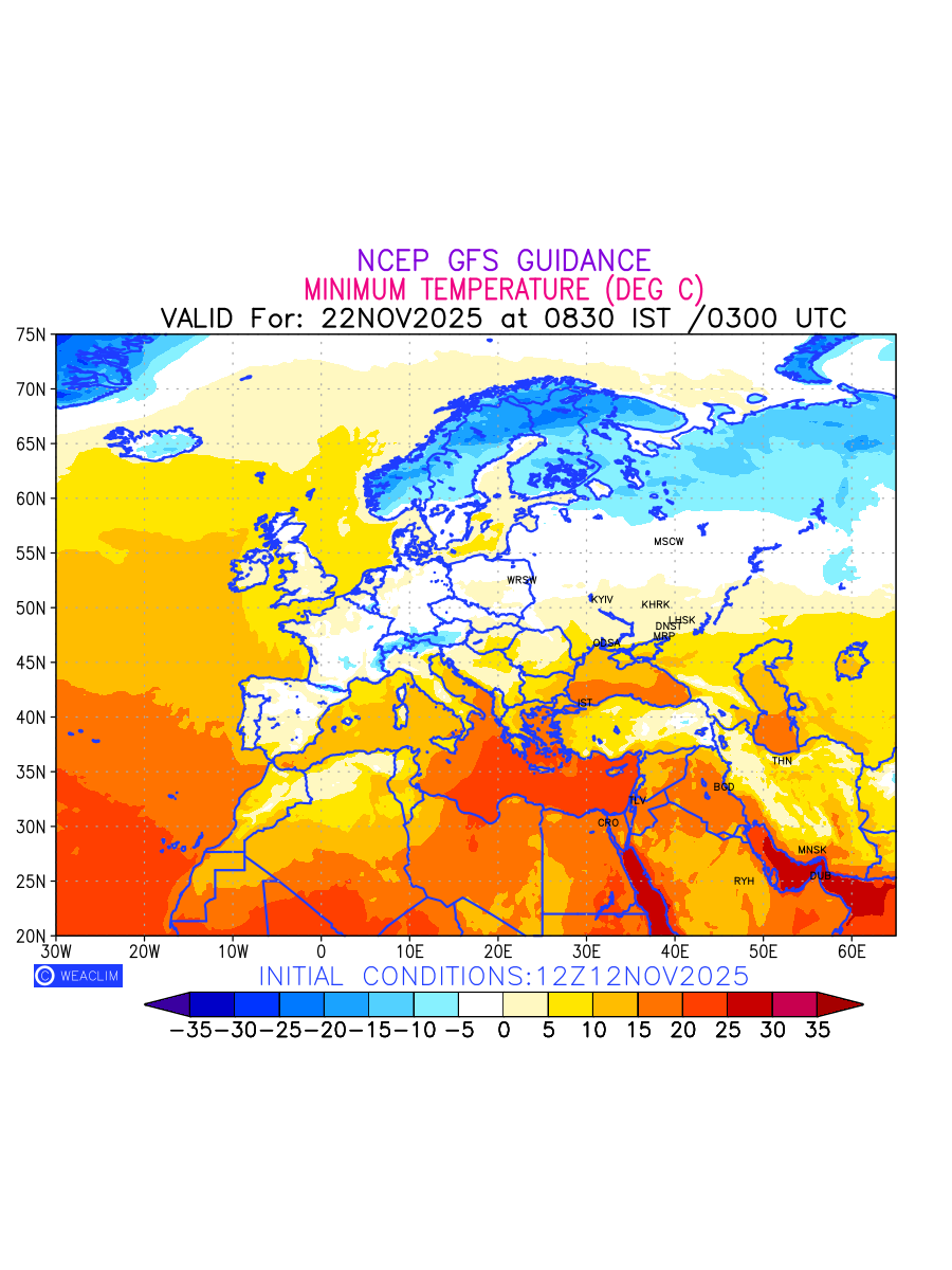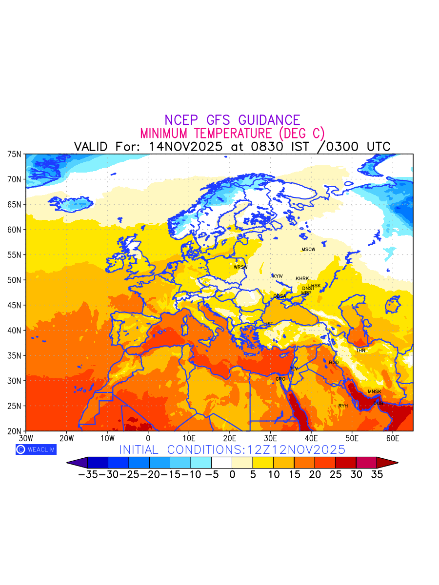 Minimum Temperature for Europe depicts the highest temperatures at 2m above the ground surface between 0300 UTC of the previous date to 0300 UTC of the required date. This is an important variable for weather forecasting, as it determines the conditions at the Earth’s surface during the coldest part of the date, affecting human activities, agriculture, and the environment. 2m Temperature data can be used for a variety of applications, such as predicting the onset of cold spells, forecasting temperature trends, and studying the impact of weather on various systems and processes.