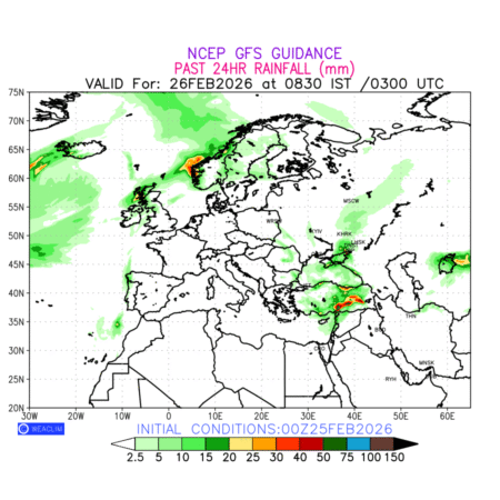 Rainfall forecast for 24 hours for Europe is expected amount of precipitation in millimeters for a given area over a time period of 24 hours and valid from 0300 UTC (0830 IST) of the previous date to 0300 UTC of the required date. This prediction enables the users to plan/review their tasks that are affected by rainfall related severe weather events that may lead to flooding, drought, snowfall and avalanche etc.