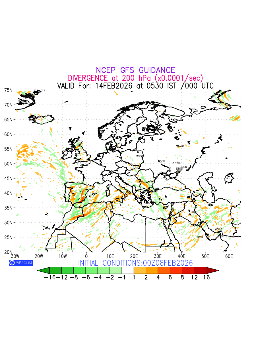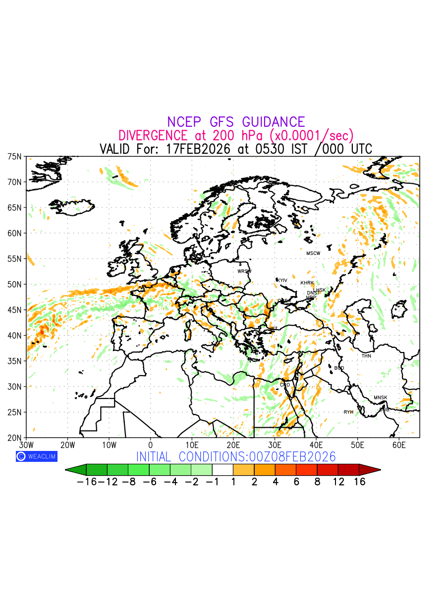 Upper Level Divergence at the 24th hour for Europe is the graphical representation that depict the magnitude and pattern of horizontal rotation (or the vorticity) of atmosphere around a vertical axis or the vorticity at 200 hPa (12.0km). In northern hemisphere, it is displayed in warm colors such as red and yellow indicating positive vorticity (cyclonic rotation), and cool colors such as blue and green indicating negative vorticity (anticyclonic rotation). It can be associated with weather systems such as troughs, ridges, and jet streams.