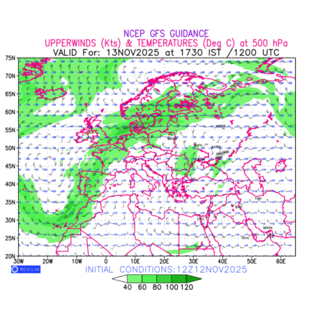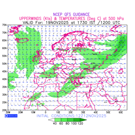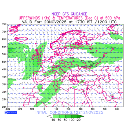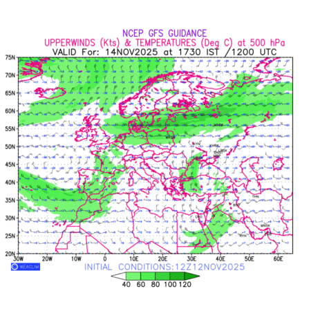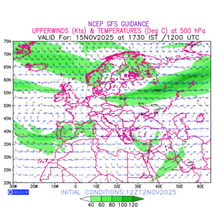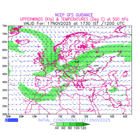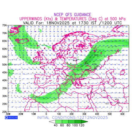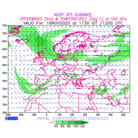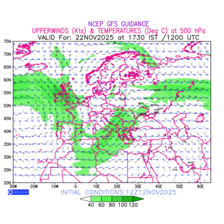 Winds at 500 hPa at the 24th hour for Europe refers to the predicted wind direction and speed at a pressure level of 500 hPa, which is located in the upper troposphere about 5.5 km (18,000 ft) above the Earth’s surface.The winds are presented in knots (kt), and the direction is given in degrees from true north. Winds with magnitude of more than 40 kt are marked in shades of green. It provides important information on forecasting weather patterns, including the movement and intensification of storms, the development of weather fronts, and the location and strength of high and low pressure systems. Along with the wind speed (kt) and direction, upper air temperatures (Deg C) are also shown at the grid points over the European Region at 500 hPa level for the next ten days.