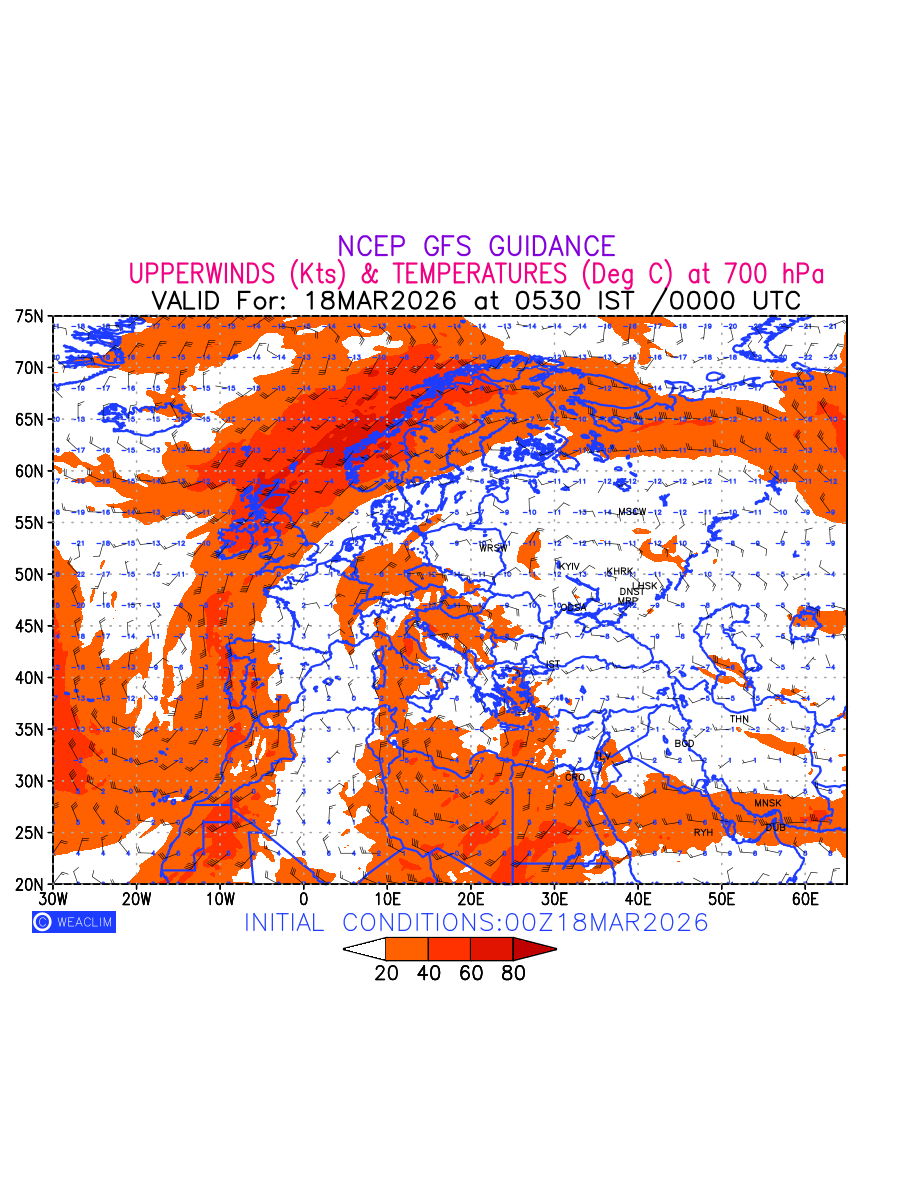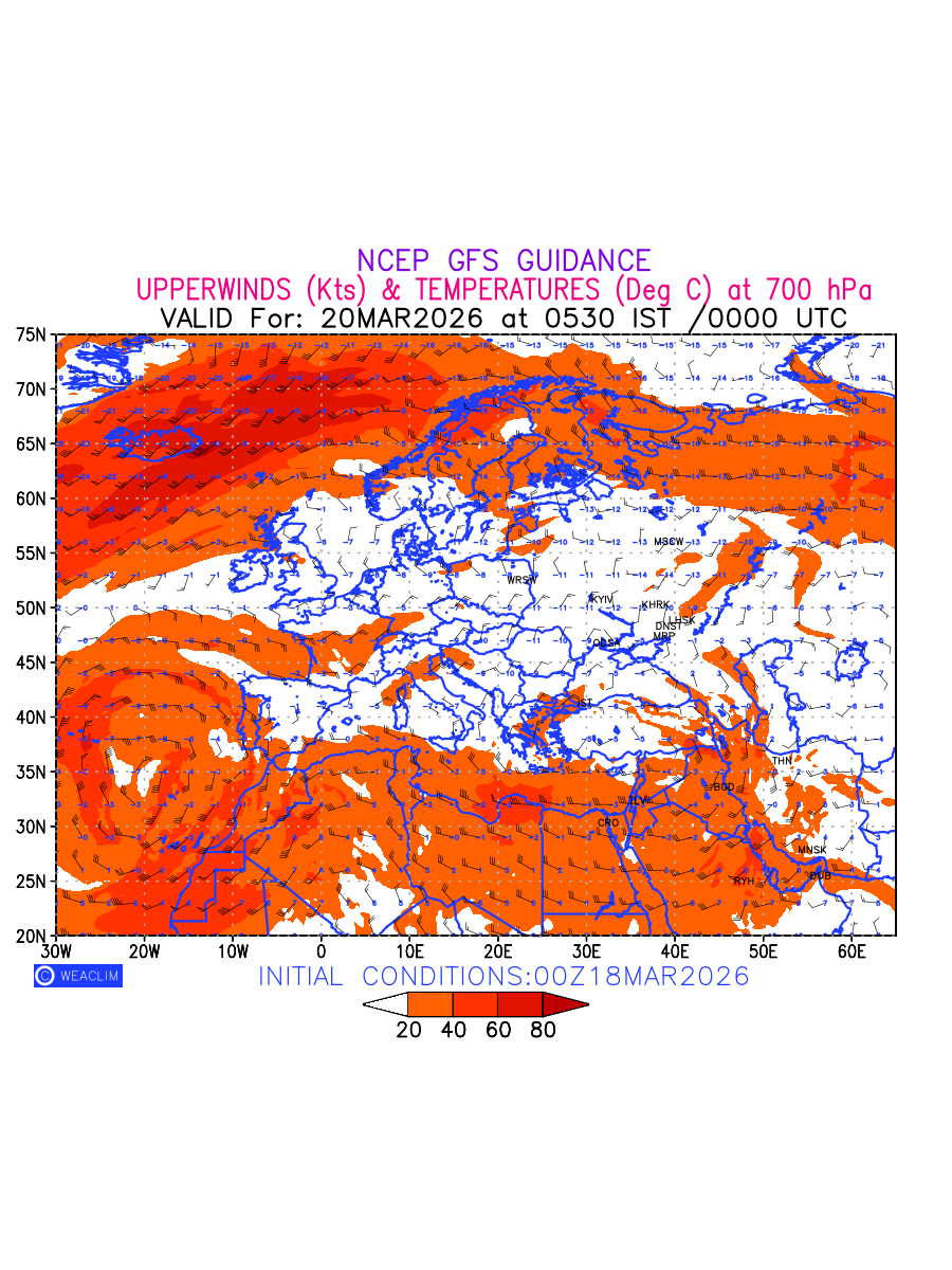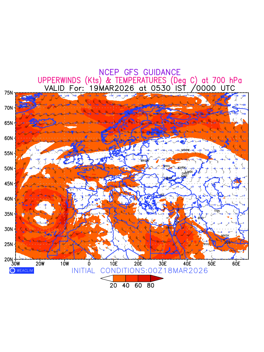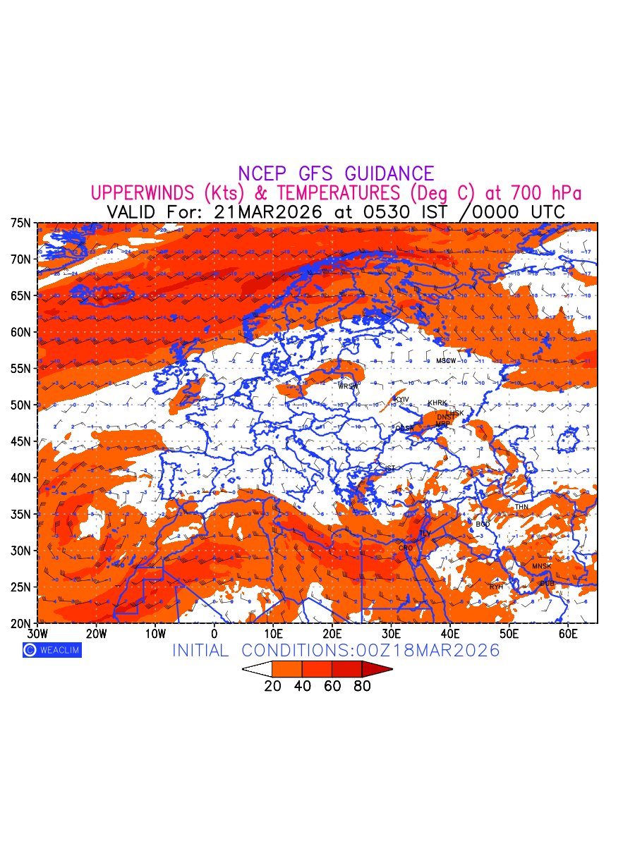 Winds at 700 hPa at the 24th hour for Europe refers to the predicted wind direction and speed at a pressure level of 700 hPa, which is located in the middle troposphere (approximately 3,000 meters or 10,000 feet above the Earths surface). The winds are presented in knots (kt), and the direction is given in degrees from true north. Winds with magnitude of more than 20 kt are marked in shades of red. At this level, the wind speed and direction can influence the movement and development of weather systems such as storms, fronts, and high-pressure systems.The depiction also shows the temperature along with the wind barb on the grid points at 700 hPa. Along with the wind speed (kt) and direction, upper air temperatures (Deg C) are also shown at the grid points over the European Region at 700 hPa level for the next ten days.