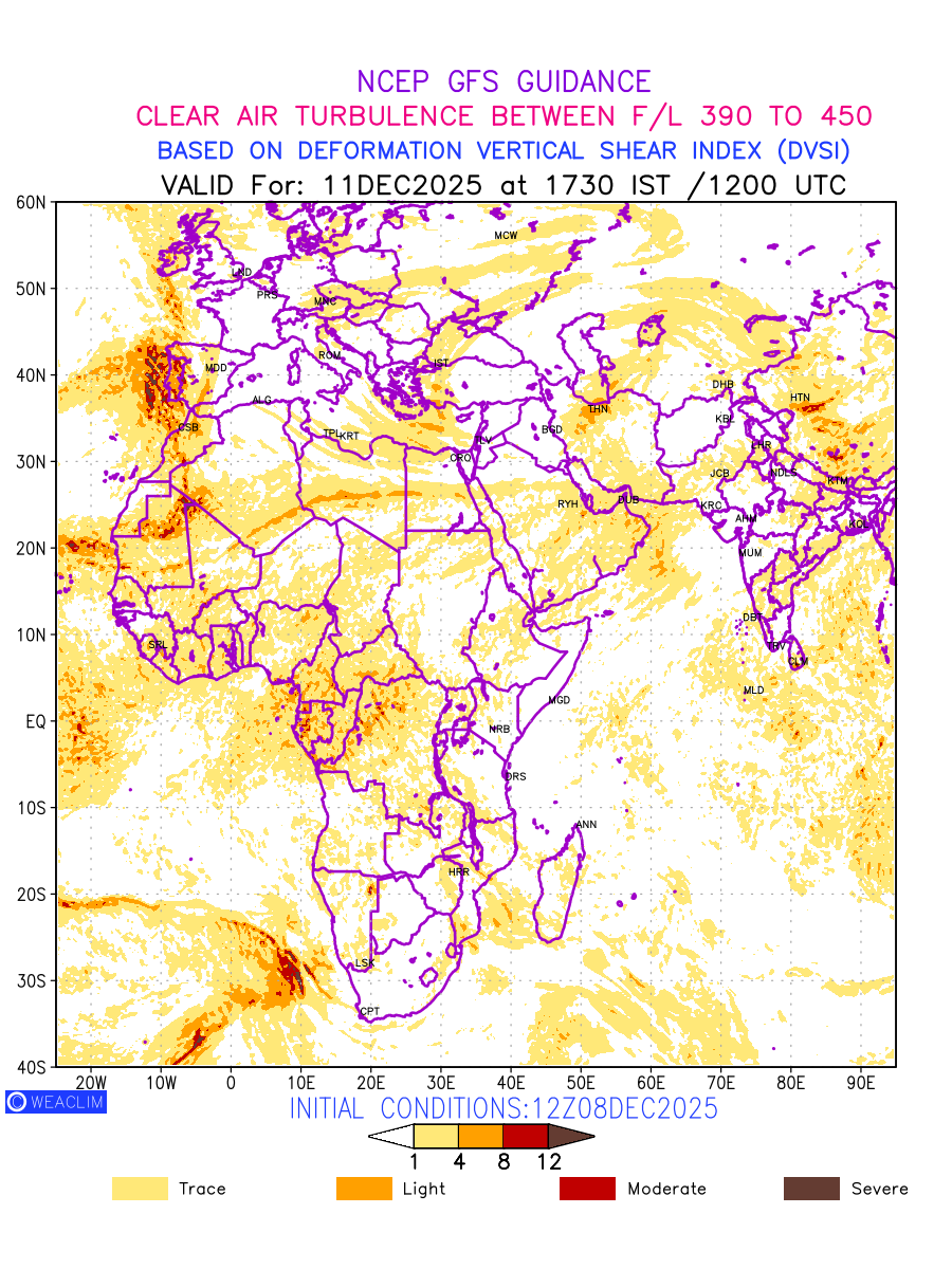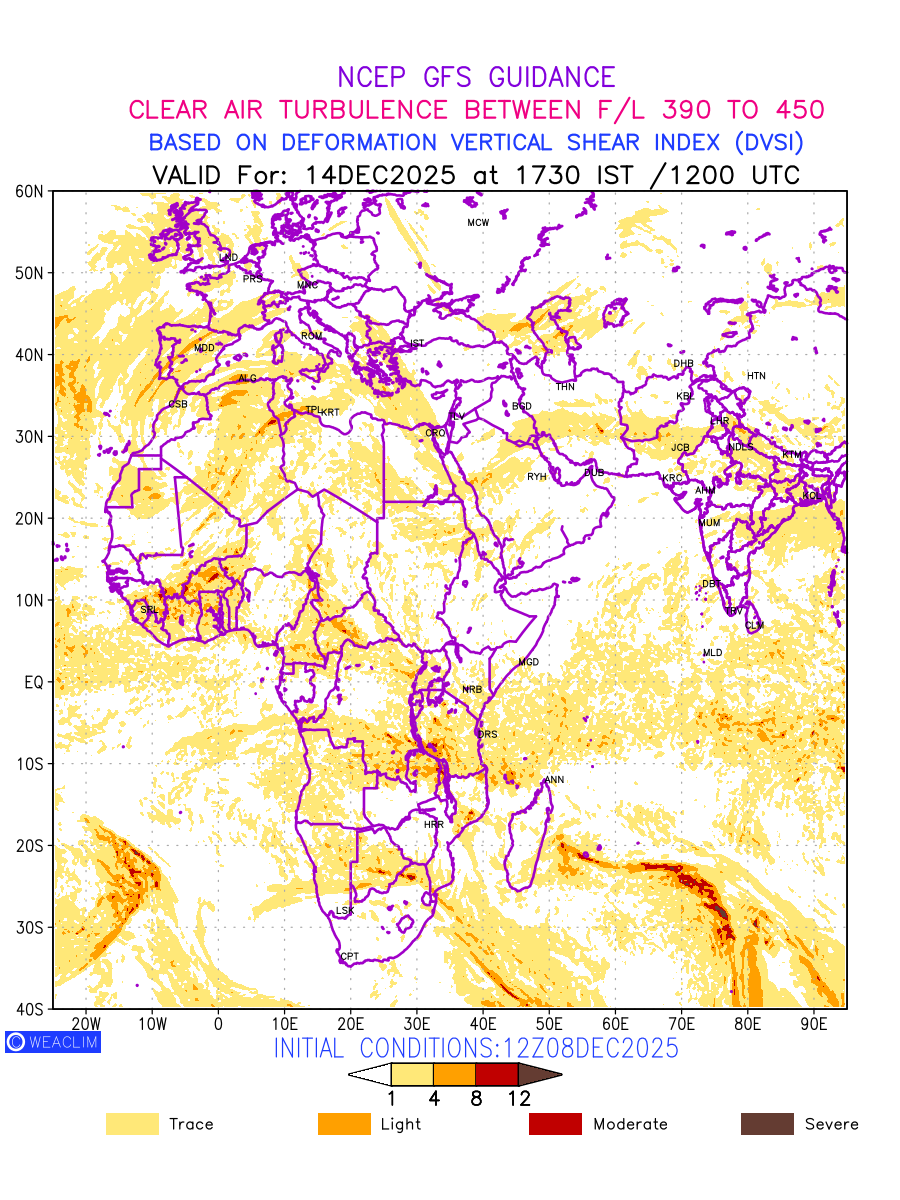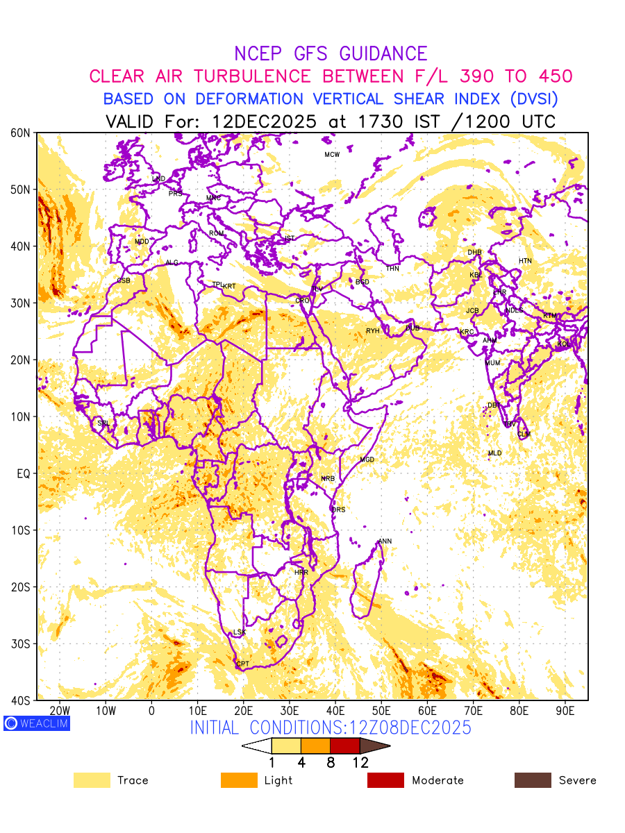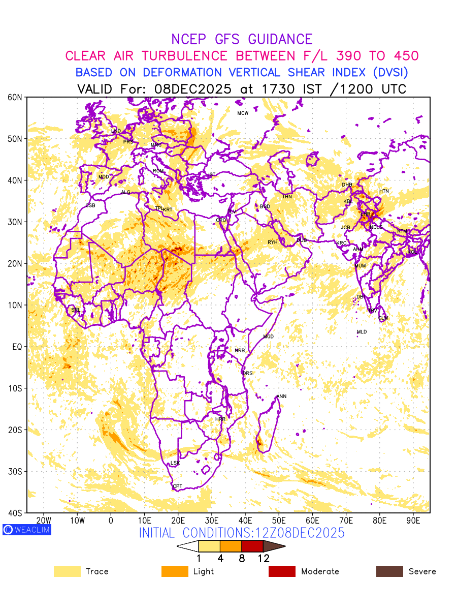 Clear Air Turbulence (CAT) is sudden severe turbulence occurring in cloudless regions that causes violent buffeting of aircraft. CAT is commonly applied to higher altitude turbulence associated with wind shear. It is caused by patches of air swirling chaotically within the world’s jet streams—strong air currents that circle the globe from west to east and that we see on weather maps as wide, wavy lines that bend around low- and high-pressure centre. It is prominent between 500hPa to 200hPa. Shown here are the CAT Conditions at 200hPa for the African Region for the next ten days.