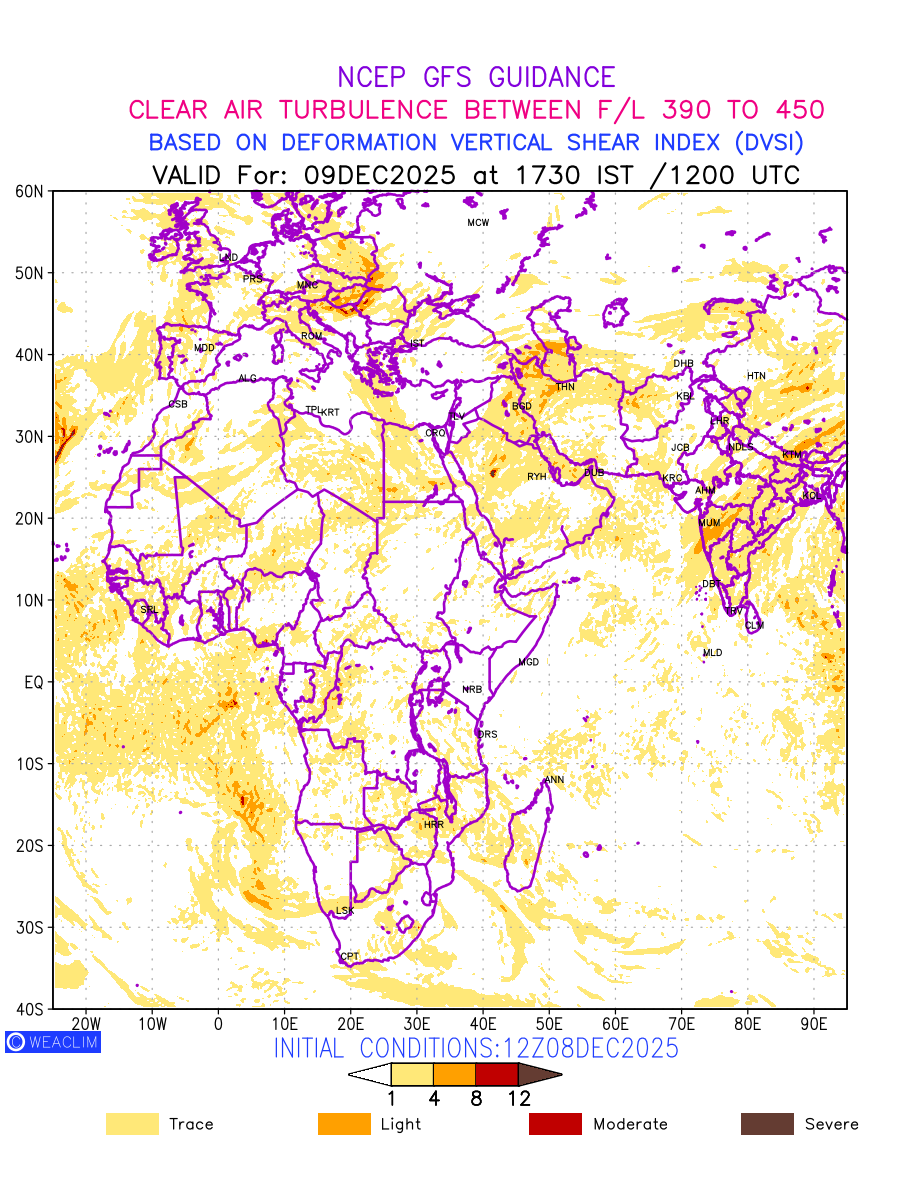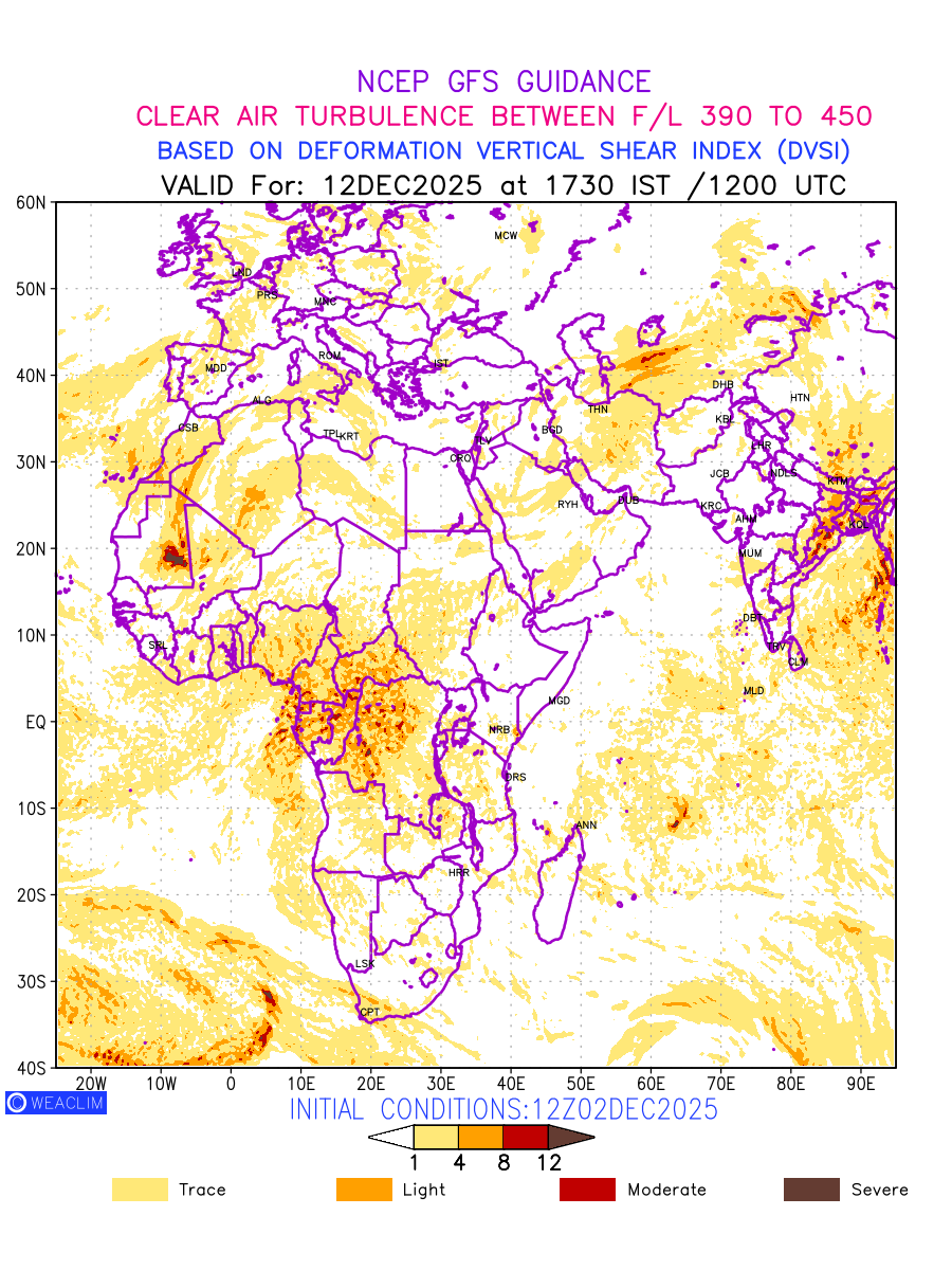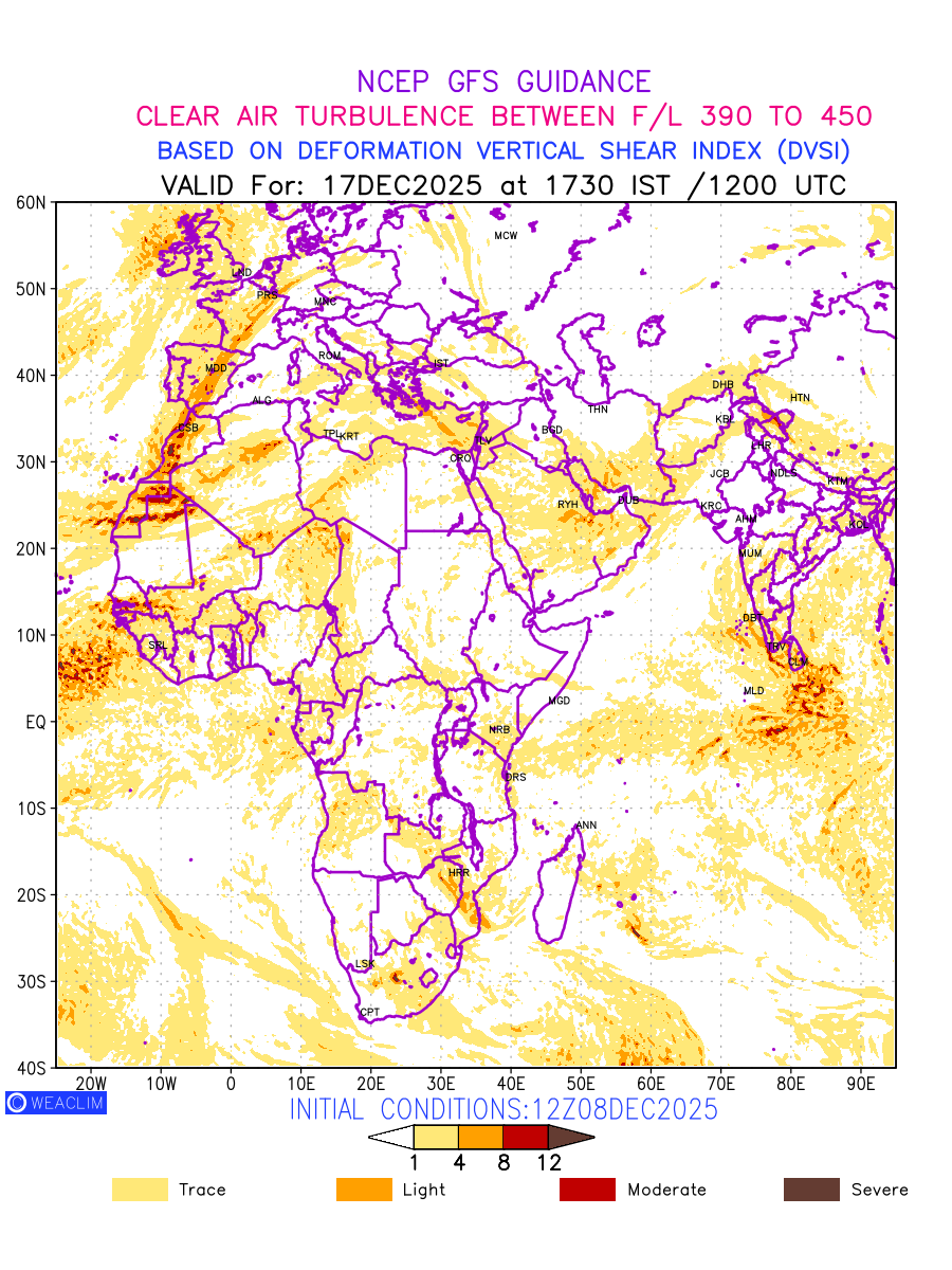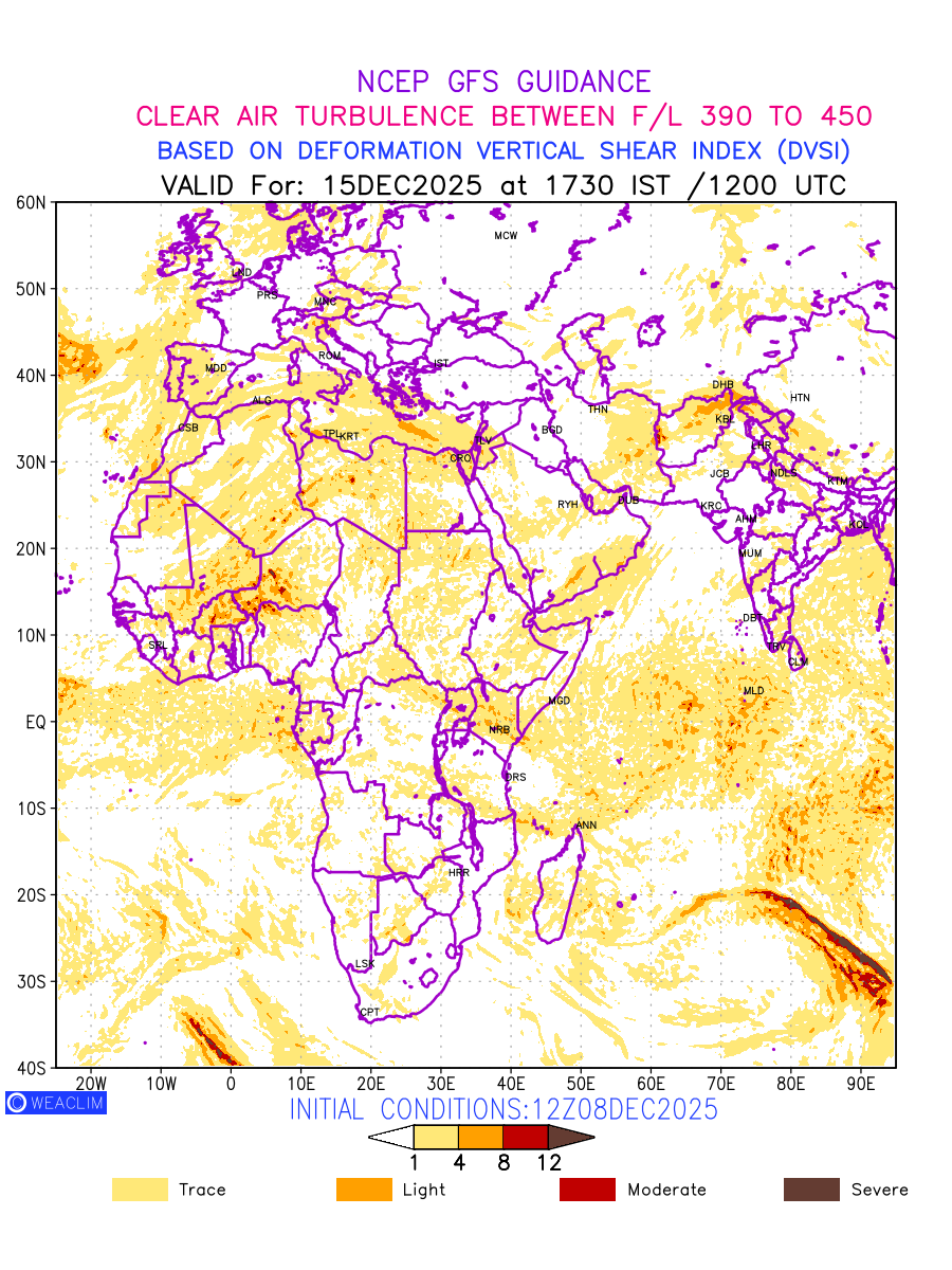 Clear Air Turbulence (CAT) is sudden severe turbulence occurring in cloudless regions that causes violent buffeting of aircraft. CAT is commonly applied to higher altitude turbulence associated with wind shear. It is caused by patches of air swirling chaotically within the world’s jet streams—strong air currents that circle the globe from west to east and that we see on weather maps as wide, wavy lines that bend around low- and high-pressure centre. It is prominent between 500hPa to 200hPa. Shown here are the CAT Conditions at 200hPa for the African Region for the next ten days.