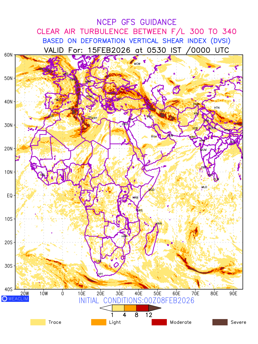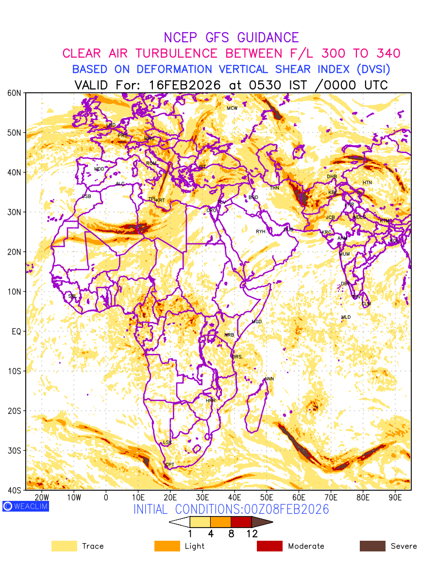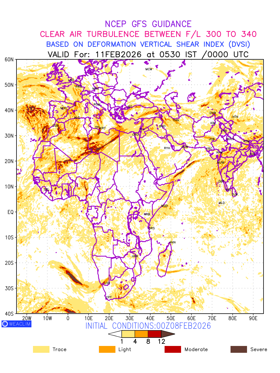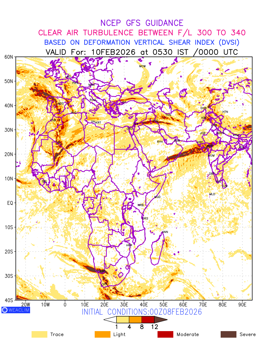 Clear Air Turbulence (CAT) is sudden severe turbulence occurring in cloudless regions that causes violent buffeting of aircraft. CAT is commonly applied to higher altitude turbulence associated with wind shear. It is caused by patches of air swirling chaotically within the world’s jet streams—strong air currents that circle the globe from west to east and that we see on weather maps as wide, wavy lines that bend around low- and high-pressure centre. It is prominent between 500hPa to 200hPa. Shown here are the CAT Conditions at 300hPa for the African Region for the next ten days.